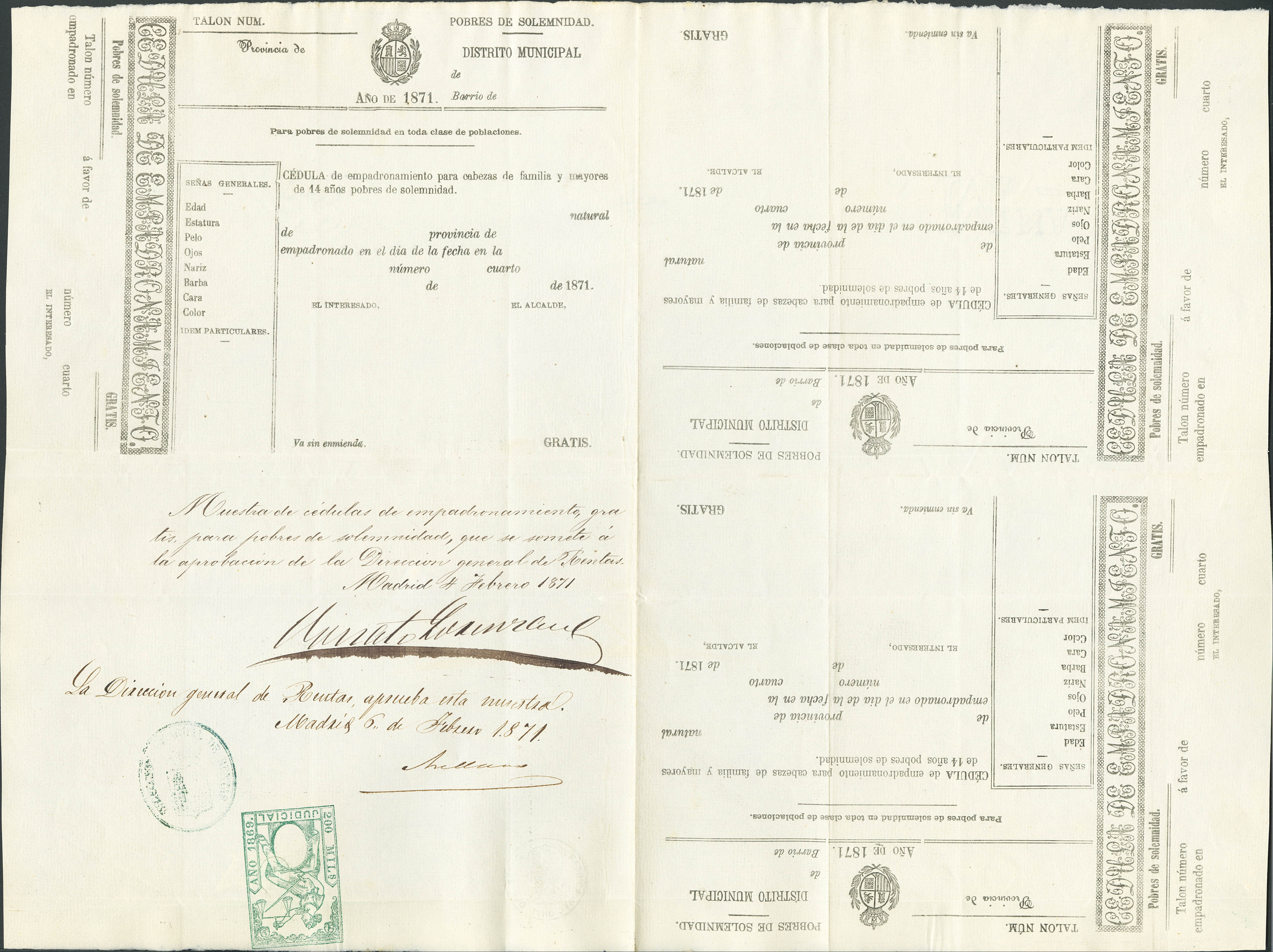 (★)1869. 200 mils green JUDICIAL LAW on complete document of REGISTRATION CERTIFICATE with handwritten annotations "Sample of registration certificate, free for the indigent" and "The General Directorate of Revenue approves this sample". MAGNIFICENT AND RARE.