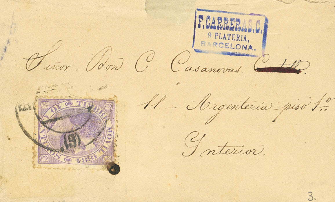1884. 10 cts lilac MOVABLE STAMP (1884). Barcelona Internal Mail, sent by F. Carreras Candí (letterhead in blue). MAGNIFICENT AND RARE POSTAL USE OF A MOVABLE STAMP.