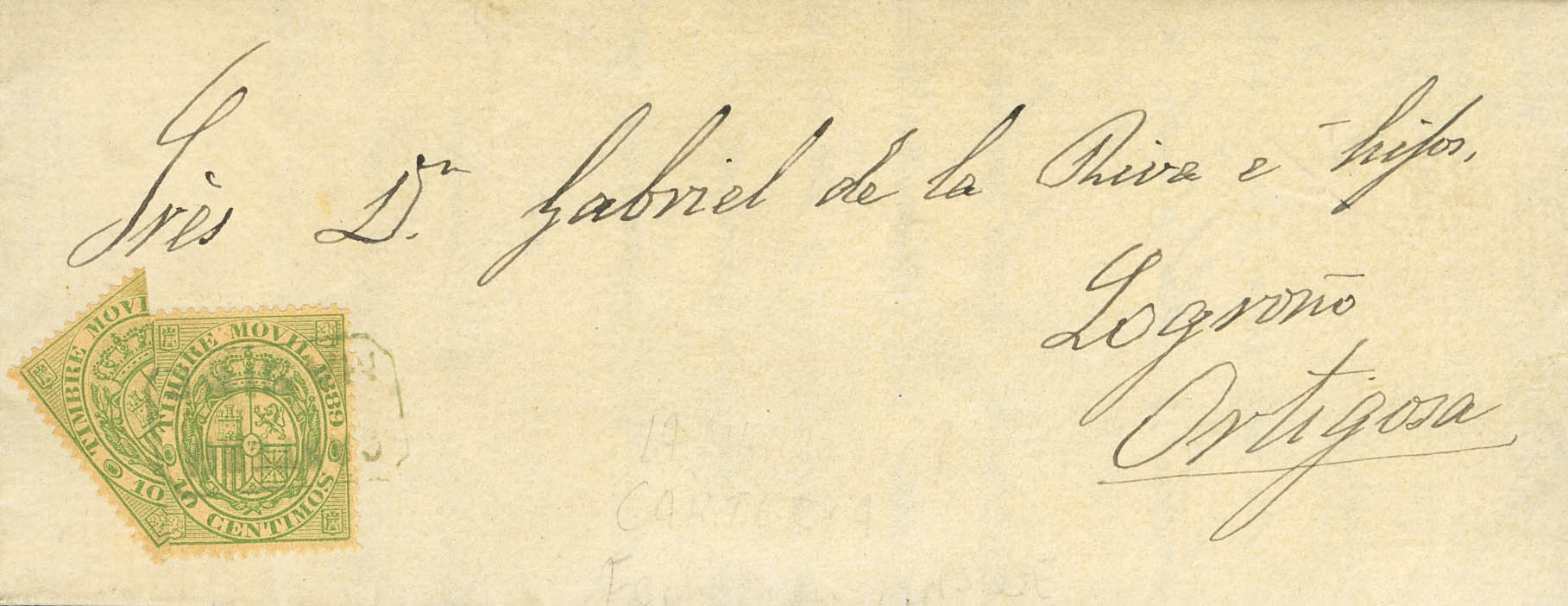 1889. 10 cts green yellow MOVABLE STAMP (1889), two stamps, one bisected to complete the 15 cts rate for single postage. MASIDE to ORTIGOSA DE CAMEROS. Postmark CARTERIA / MASIDE, in blue. MAGNIFICENT AND EXTRAORDINARILY RARE POSTAL USE OF A MOVABLE STAMP, ESPECIALLY BISECTED.