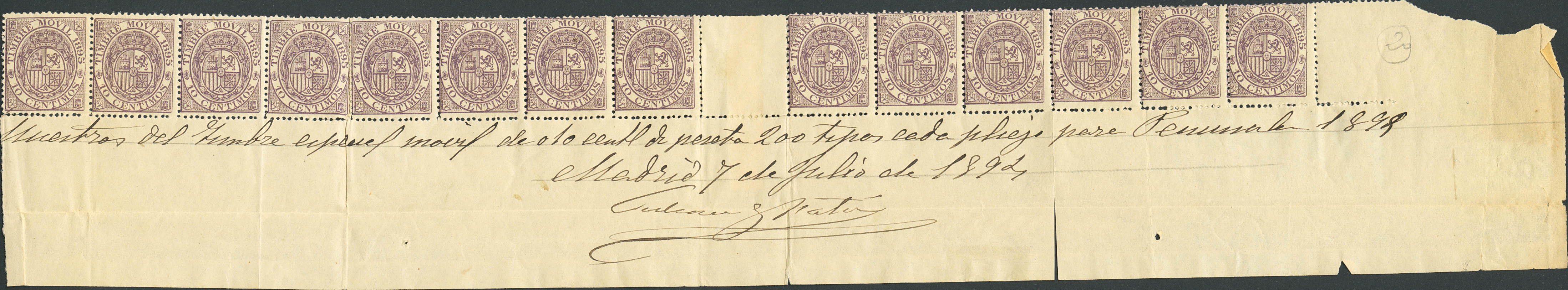 ★★/★1894. 10 cts violet MOVABLE STAMP, strip of fourteen stamps, sheet edge with interpanel. In the margin, handwritten annotation "Samples of the special 0.10 cts movable stamp..." and signature. MAGNIFICENT AND RARE. (Alemany 40)