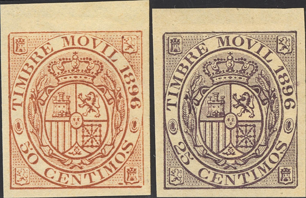 1896. 25 cts violet and 50 cts chestnut MOVABLE STAMP (1896). PERFORATED. MAGNIFICENT AND VERY RARE. (Alemany 45/46s)