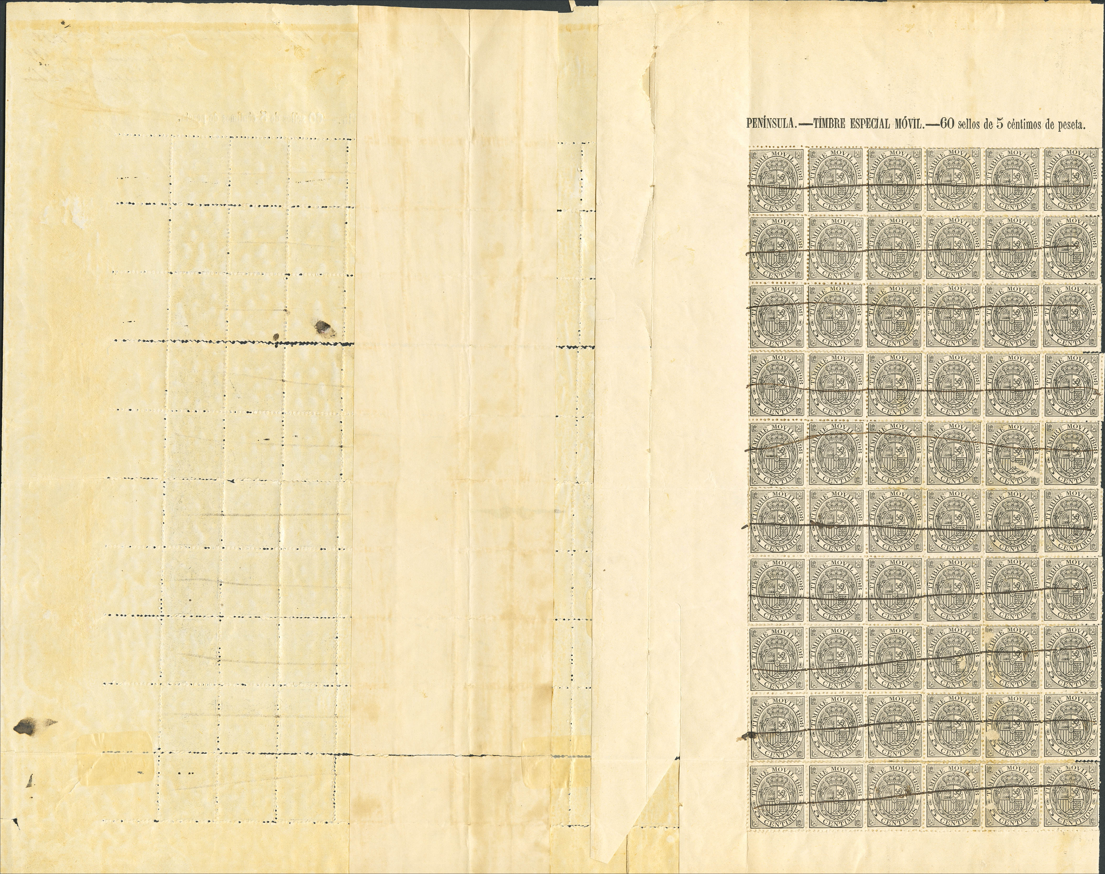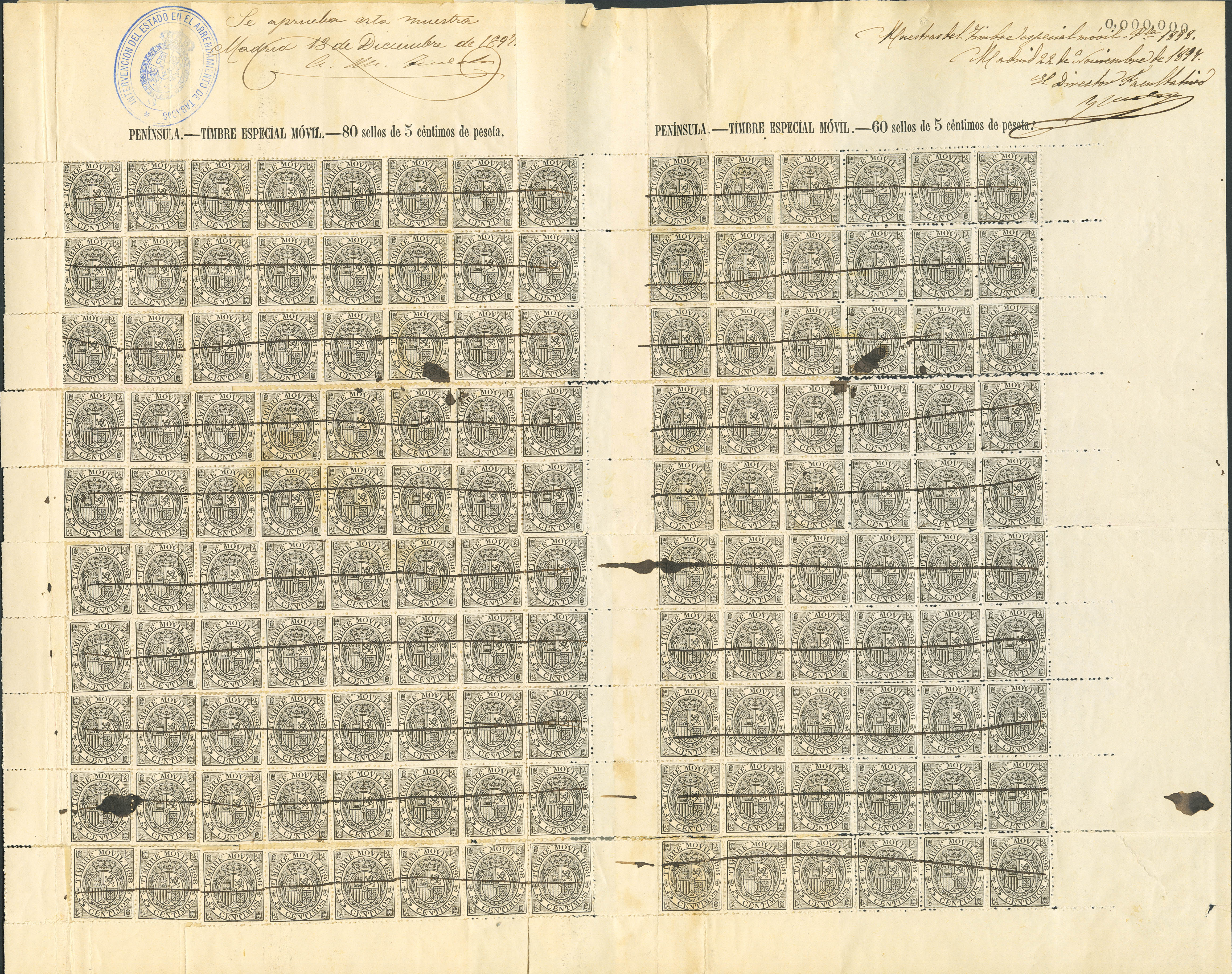 1898. 5 cts black MOVABLE STAMP, full sheet of two hundred stamps with two interpanels (folded and reinforced). Cancelled with a pen, handwritten annotation "This sample is approved" and mark STATE INTERVENTION IN TOBACCO LEASES, in blue. BEAUTIFUL AND RARE. (Alemany 51)