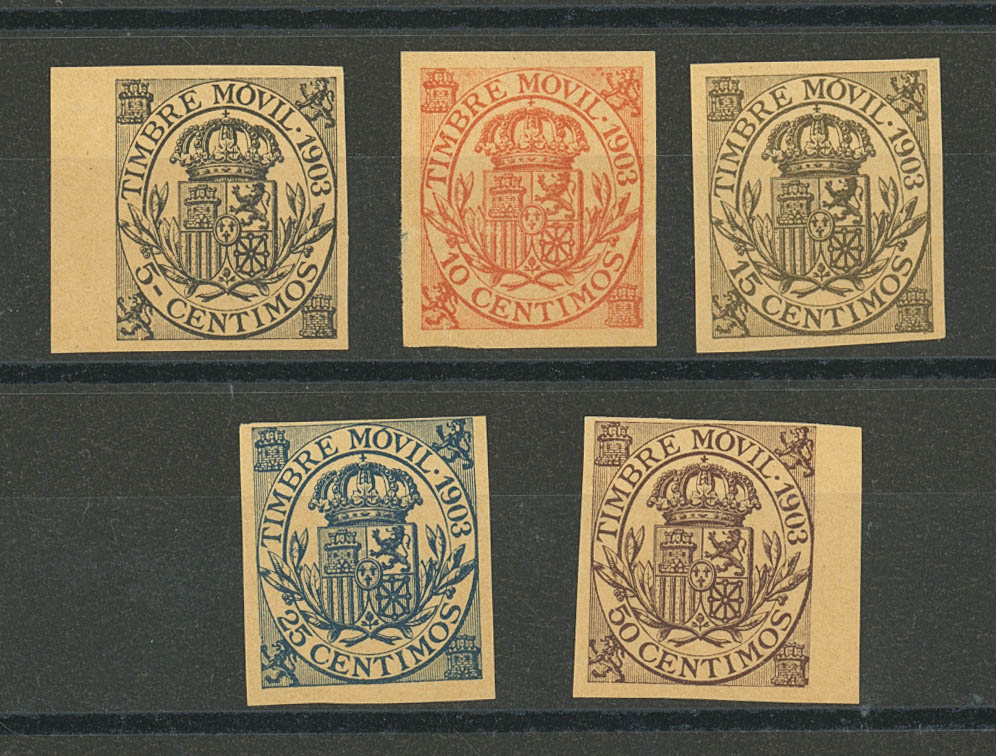 (★)1903. Complete series (the 10 cts horizontal fold) MOVABLE STAMP (1903). IMPERATED. MAGNIFICENT AND RARE. (Alemany 74/78s)