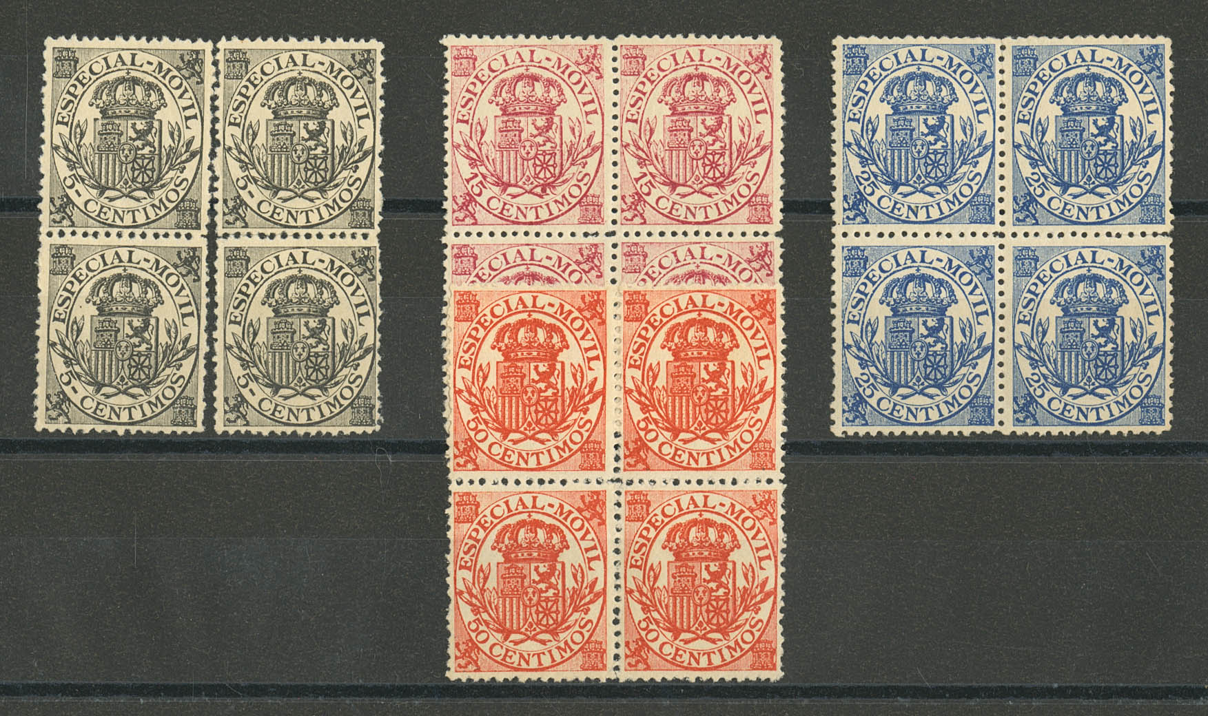 1908. 5 cts black, 15 cts carmine, 25 cts blue and 50 cts orange, blocks of four (the 5 cts detached). MOVABLE STAMP and No. A000.000. MAGNIFICENT AND RARE. (Alemany 1, 3, 5, 6)