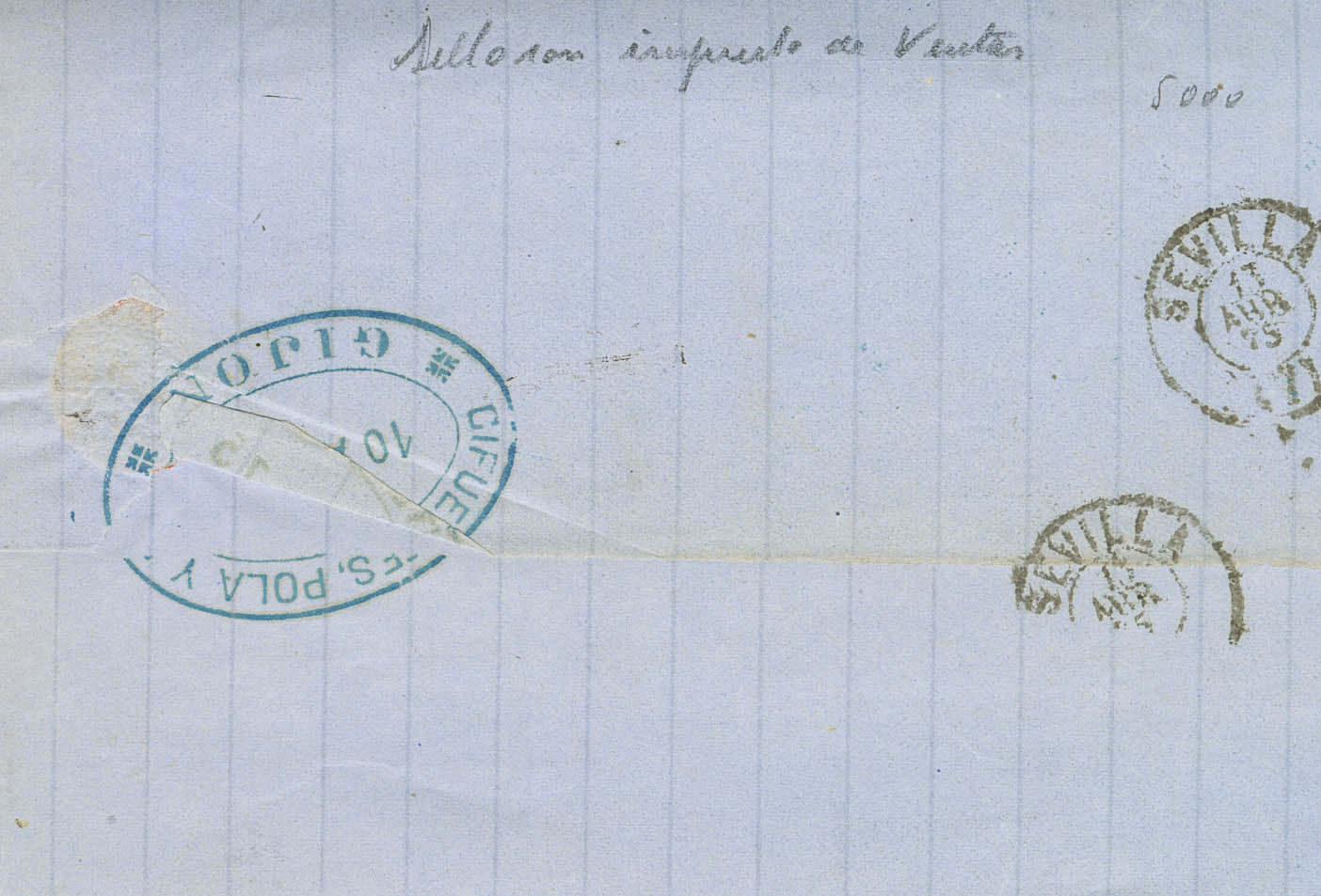 153. 1875. 10 cts brown and 5 cts pale blue SALES TAX. GIJON to SEVILLE. Postmark GIJON / OVIEDO. MAGNIFICENT AND RARE POSTAL USE OF A REVENUE STAMP. (Alemany 1b)