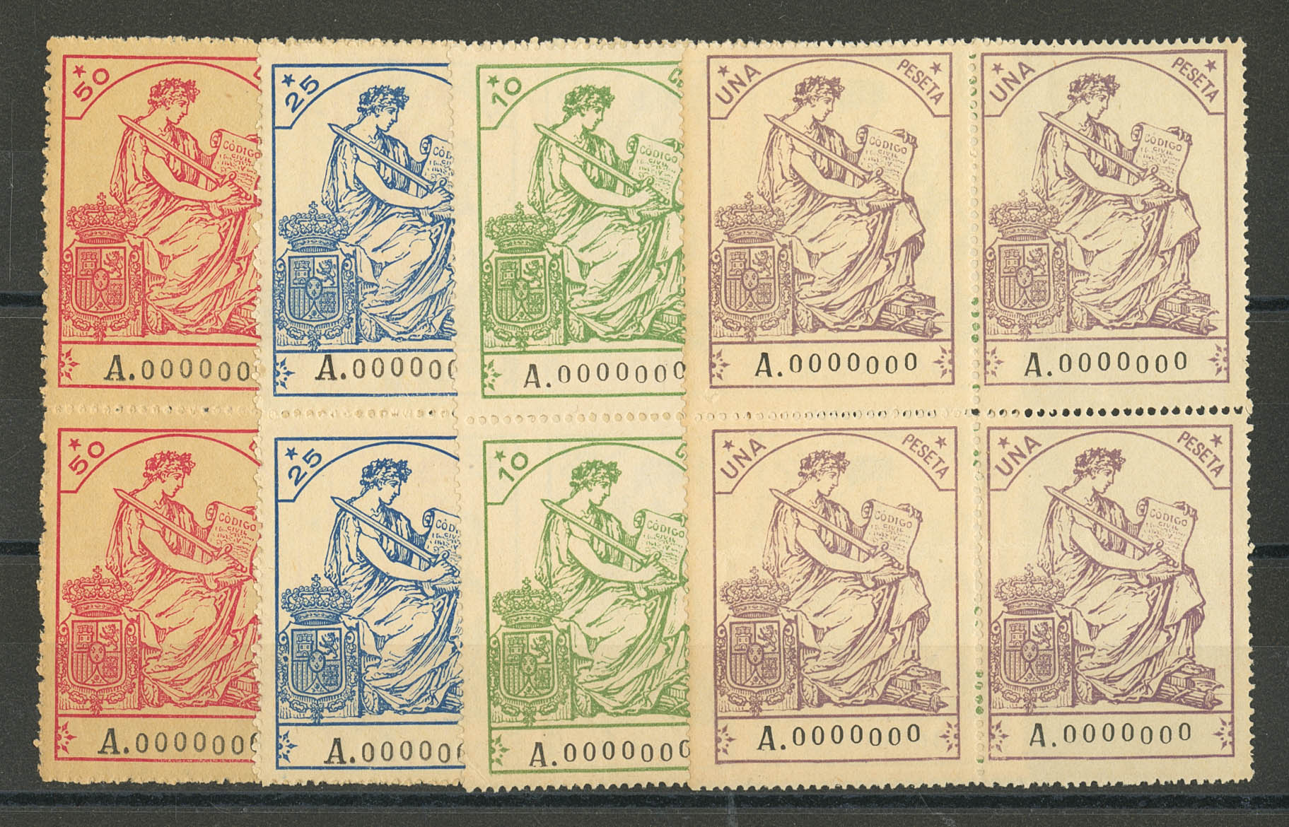 ★★/★1909. Complete series of INVOICES, four values, block of four. No. A000000. MAGNIFICENT AND RARE. (Alemany 1/4)