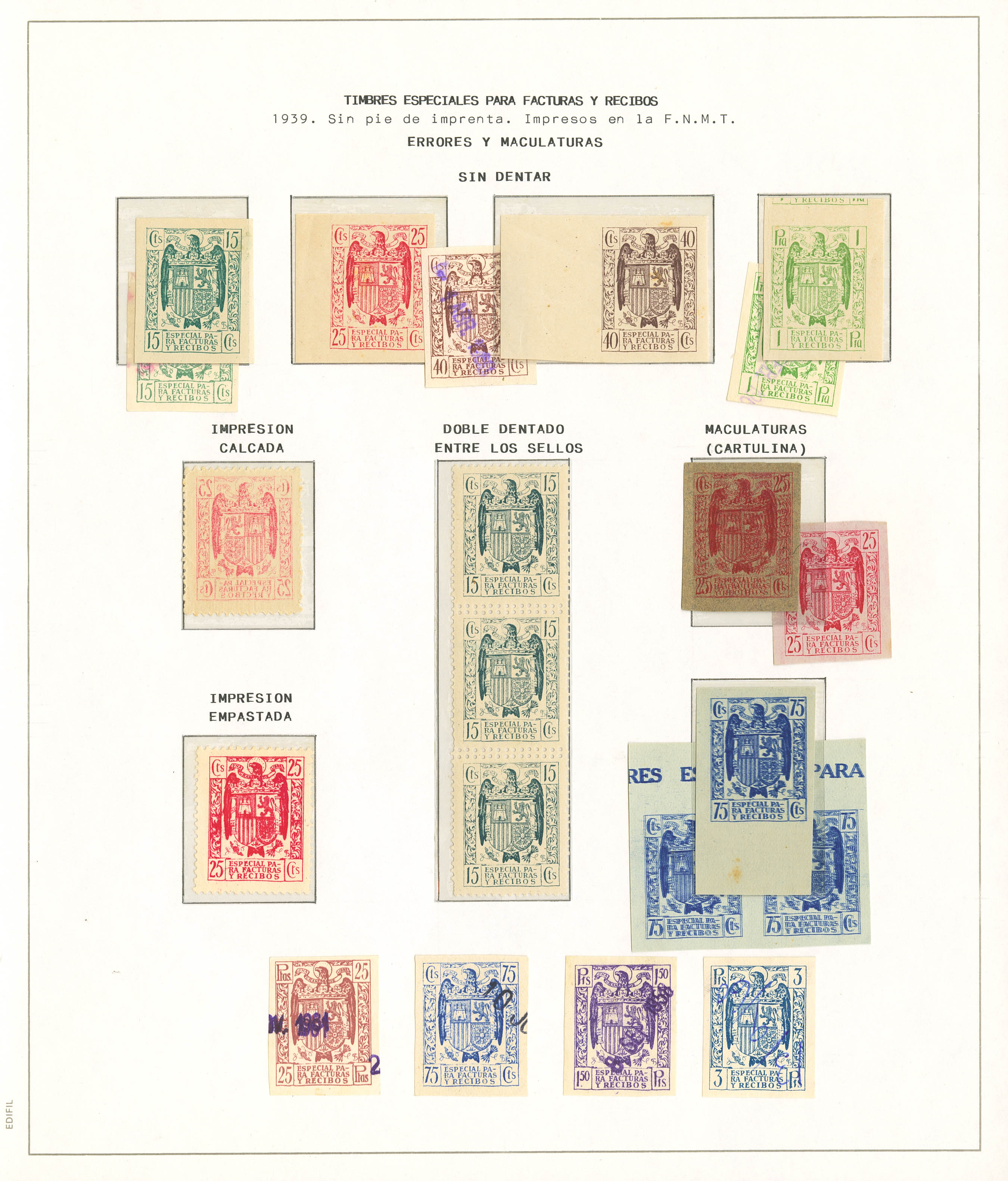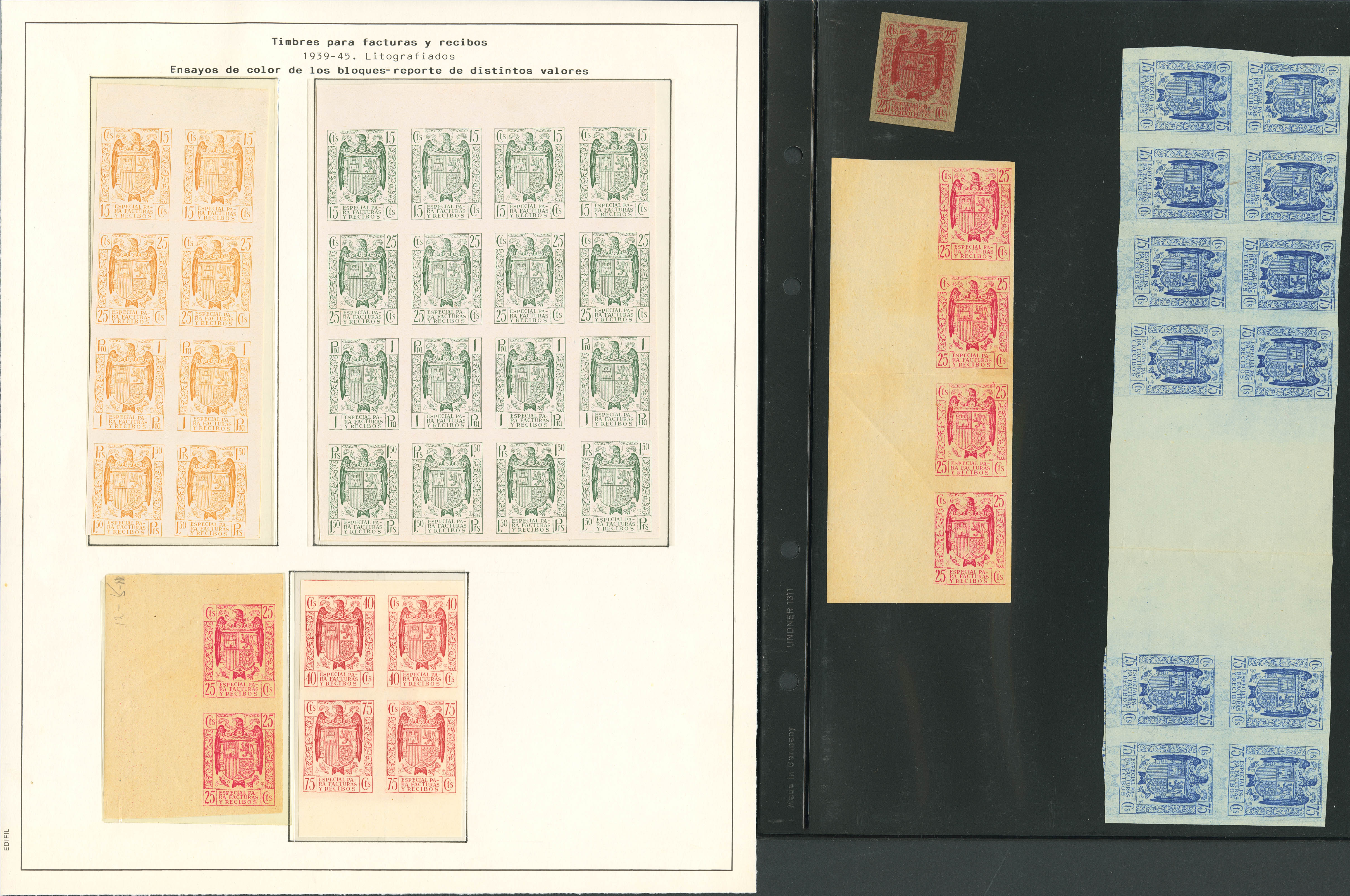 (★)/1939. Spectacular collection of varieties, blemishes, and color trials from the 1939 INVOICES AND RECEIPTS series, mostly mint and used. Includes several large, imperforate blocks in both mint and used, as well as three report blocks of varying sizes with values of 15 cts, 25 cts, 75 cts, 1 pt, and 1.50 pts, in yellow, grey-green, and carmine. A MAGNIFICENT AND EXTREMELY RARE COLLECTION. Ex-Alemany.