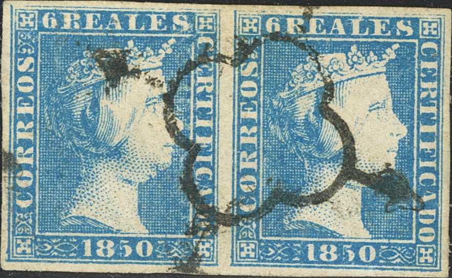 4(2). 1850. 6 reales blue, pair (light dots). Large margins and intense color. MAGNIFICENT AND RARE. Cert. GRAUS.