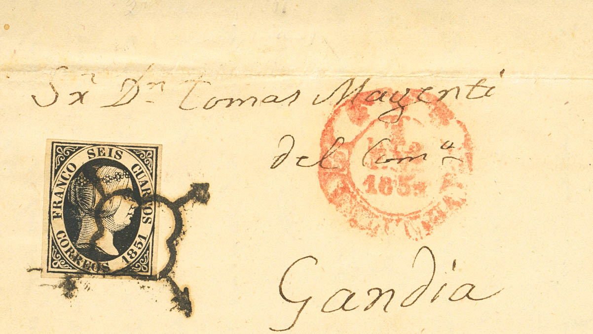 6. 1851. 6 cuartos black. VALENCIA to GANDIA. On the front Baeza *** / 2-JAN-51 / VALENCIA. MAGNIFICENT AND UNUSUAL SECOND DAY OF CIGoodULATION OF THE 1851 ISSUE. Cert. CEM.