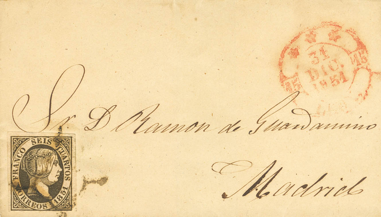 6. 1851. 6 cuartos black. LEON to MADRID. On the front Baeza *** / 31-DEC-1851 / LEON. MAGNIFICENT AND RARE LAST DAY OF CIGoodULATION OF THE ISSUE.