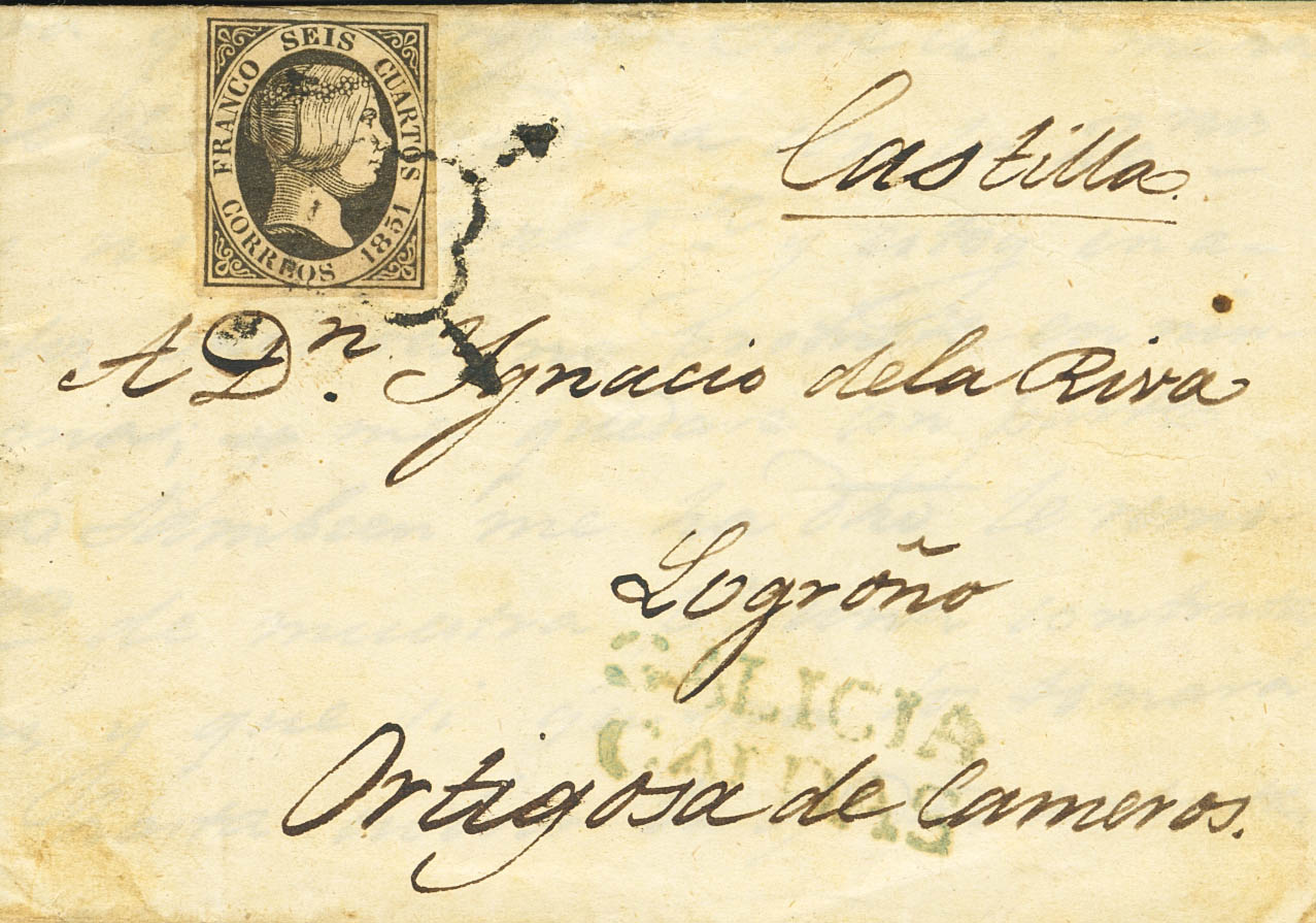 6. 1851. 6 black cuartos. CALDAS DE REYES (PONTEVEDRA) to ORTIGOSA DE CAMEROS. Postmark SPIDER and on the front pre-philatelic mark GALICIA / CALDAS, in green (inside annotation "PD a Post Office Administration has been established in this town, Don Frutos being appointed with 3500 rs and from the public he receives the benefit of the cuarto". MAGNIFICENT AND INTERESTING TEXT.