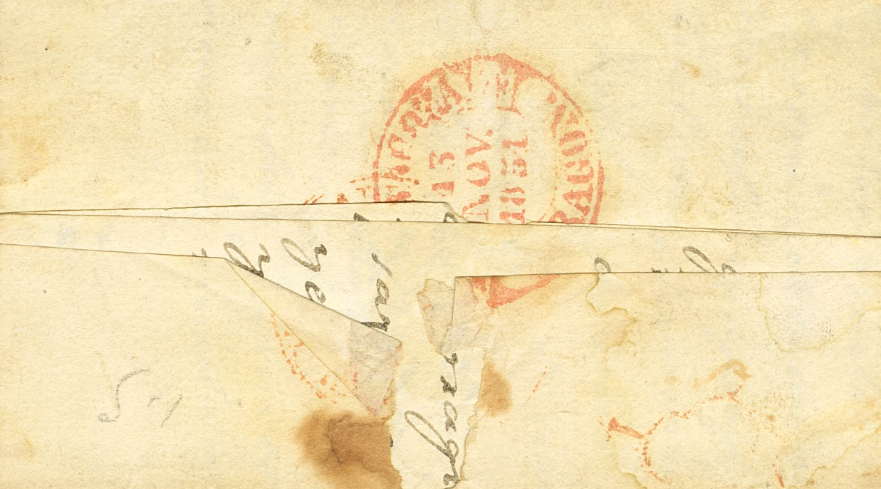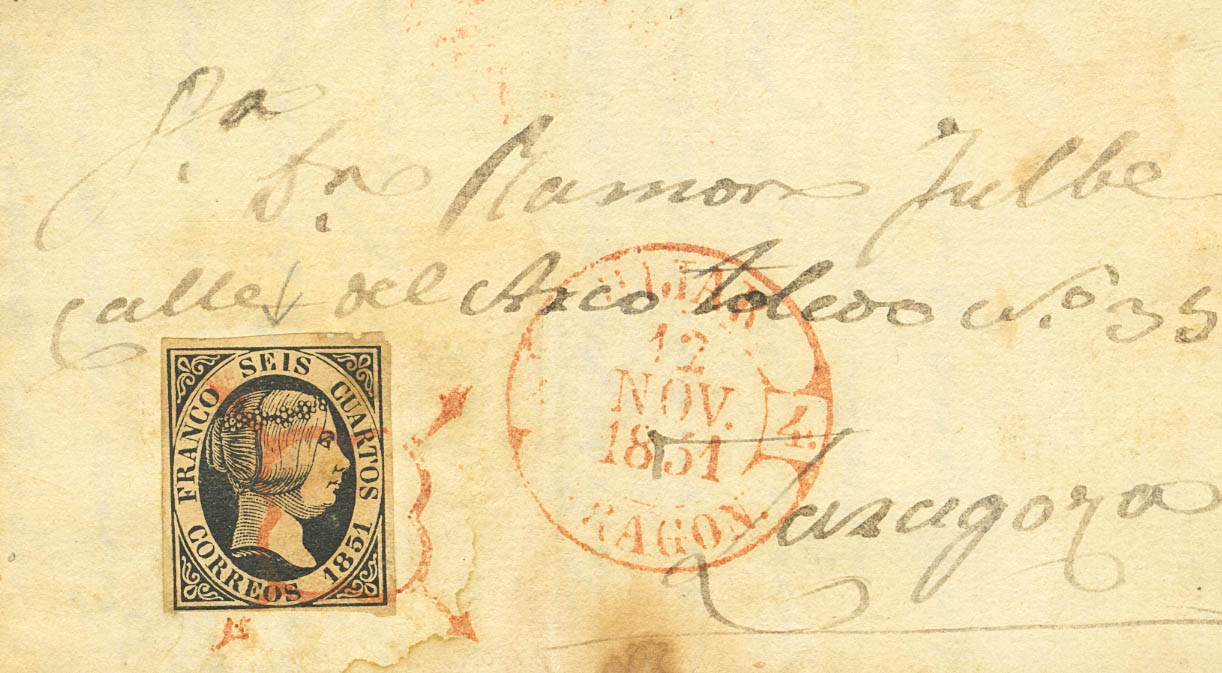 6. 1851. 6 cuartos black. ANDORRA (TERUEL) to ZARAGOZA. Postmark SPIDER, in red and on the front baeza HIJAR / ARAGON. MAGNIFICENT AND RARE.