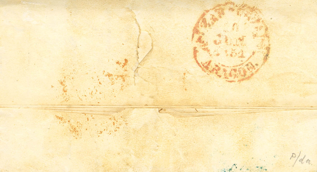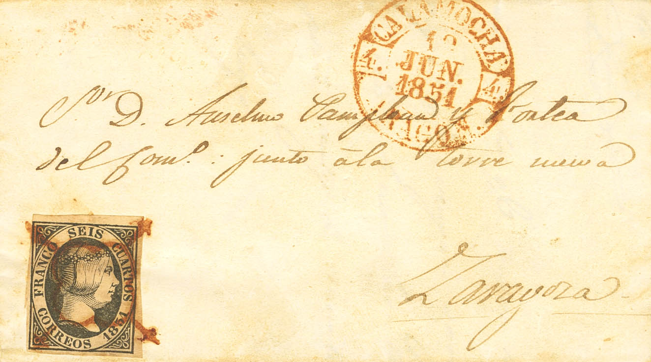6. 1851. 6 cuartos black. CALAMOCHA (TERUEL) to ZARAGOZA. Postmark SPIDER, in red. MAGNIFICENT AND RARE.