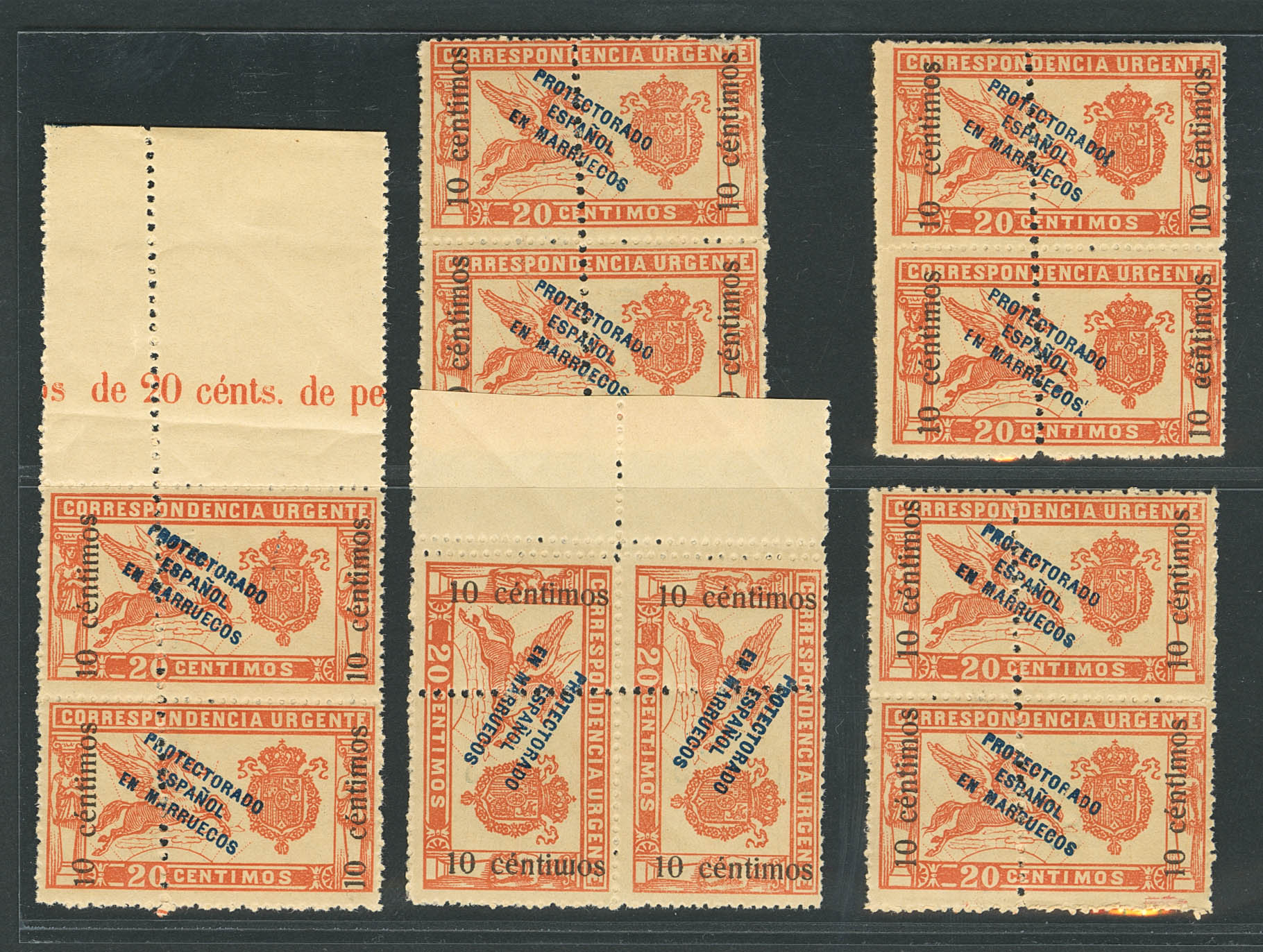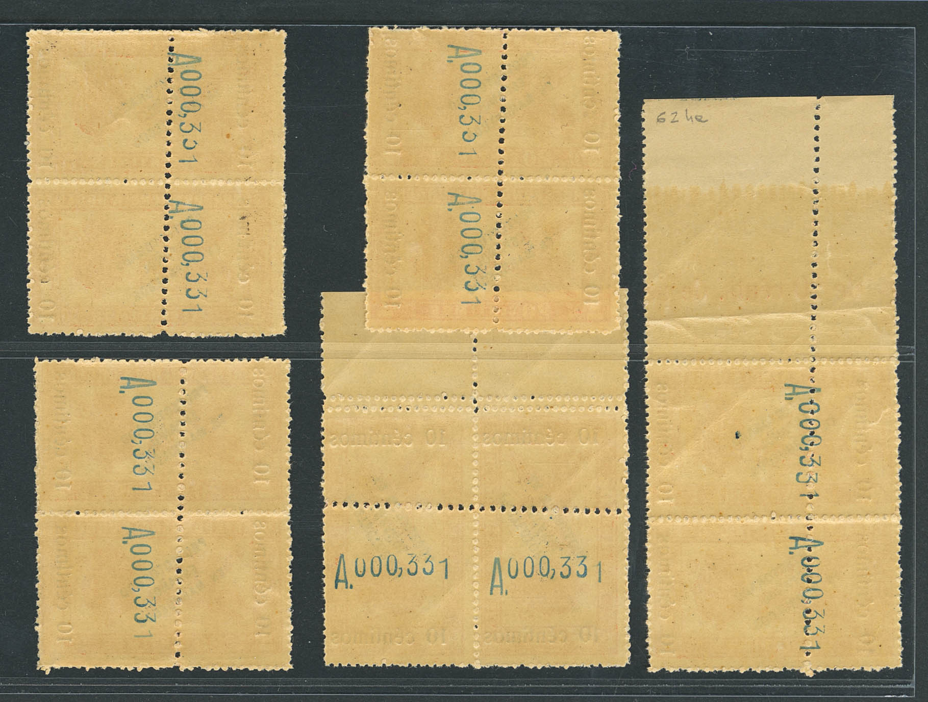 ★★ 66he, hea, heb, hec, hed. 1916. Set of five pairs of 10-centavo stamps on orange 20-centavo stamps, including all cataloged composition errors in each pair and accompanied by the type stamp. Magnificent and extremely rare. Edifil 2018: ++960 Euros