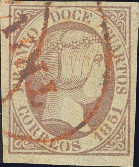 7. 1851. 12 lilac cuartos. Pre-philatelic postmark TRIVES, in red. MAGNIFICENT. Cert. GRAUS.
