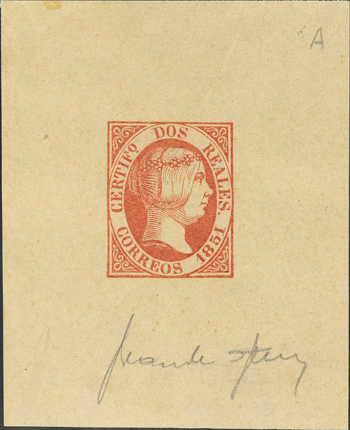 (★) 8F. 1851. 2 reales orange-red. SPERATI PROOF (Type A), with the signature of Jean de Sperati. MAGNIFICENT AND RARE.