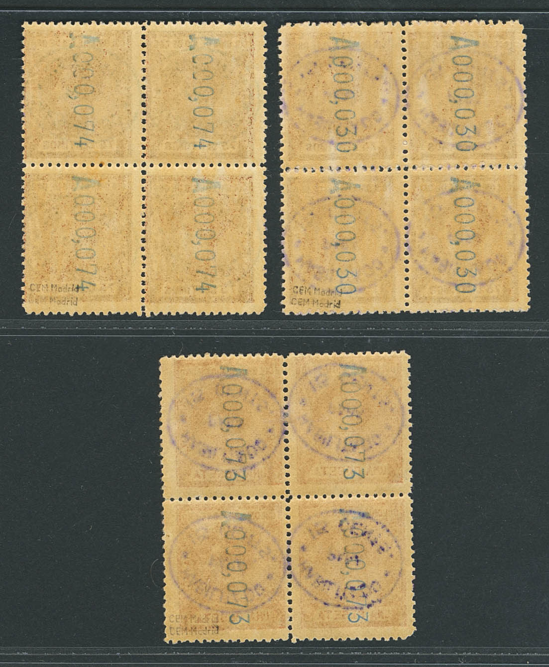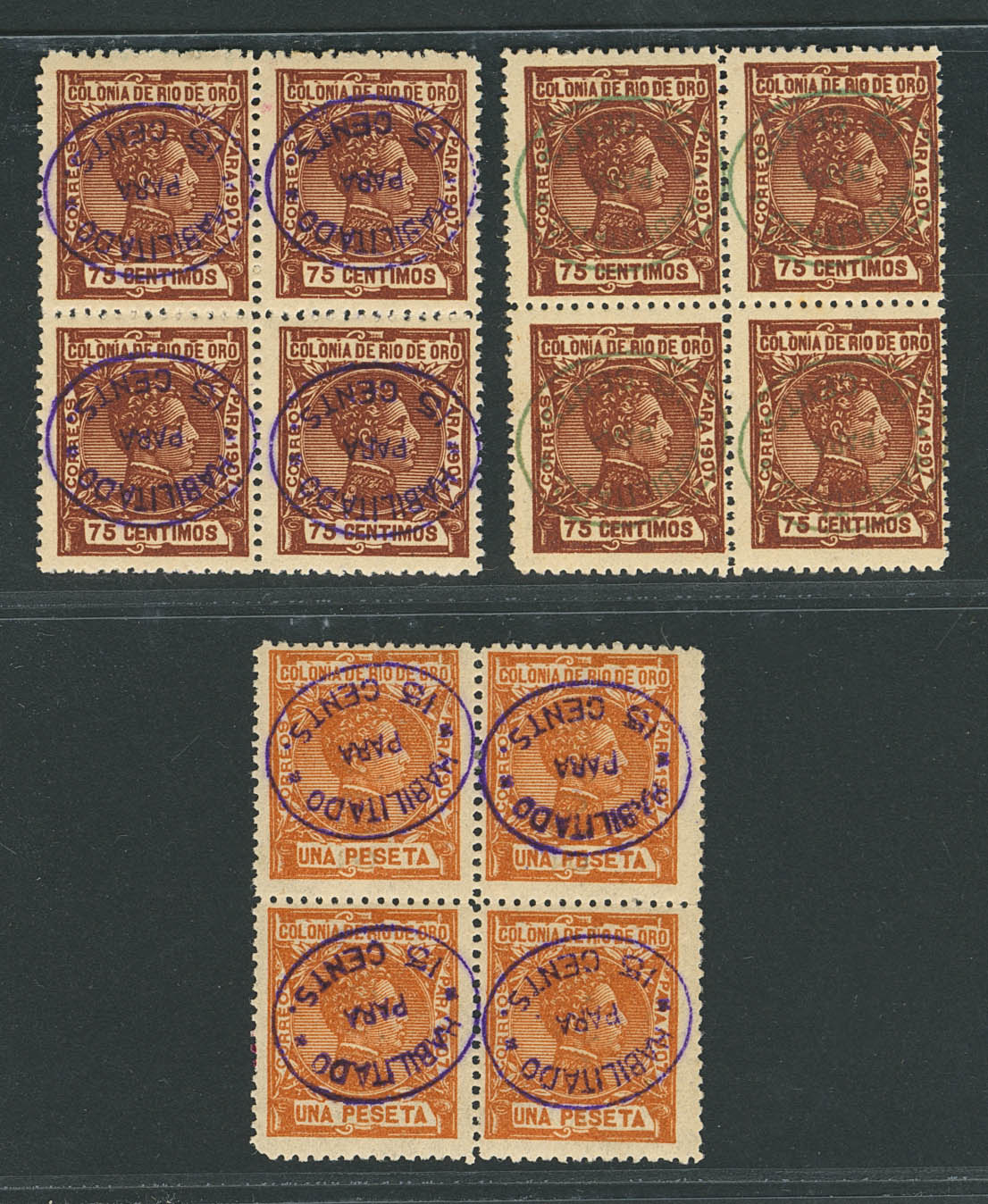 ★★ 39hi(4), 39hcci(4), 40hi(4). 1907. 15 cts on 75 cts REVERSED OVERLOAD, block of four, 15 cts on 75 cts REVERSED OVERLOAD and COLOR CHANGE, in green, block of four and 15 cts on 1 pt REVERSED OVERLOAD, block of four. MAGNIFICENT. Edifil 2026: 840 Euros
