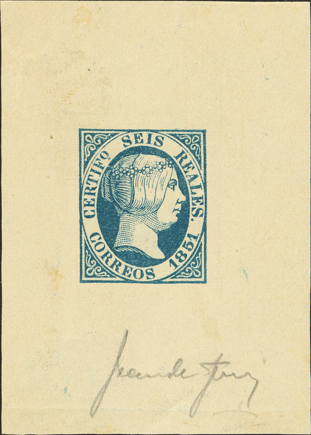 (★) 10F. 1851. 6 reales blue. SPERATI PROOF, on the reverse BPA mark and signature of Jean de Sperati. MAGNIFICENT AND RARE.