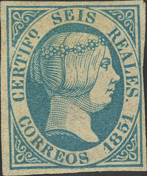 ★ 10. 1851. 6 reales blue (invisible light dot). MAGNIFICENT AND EXTREMELY RARE IN MINNED CONDITION. Cert. CEM.