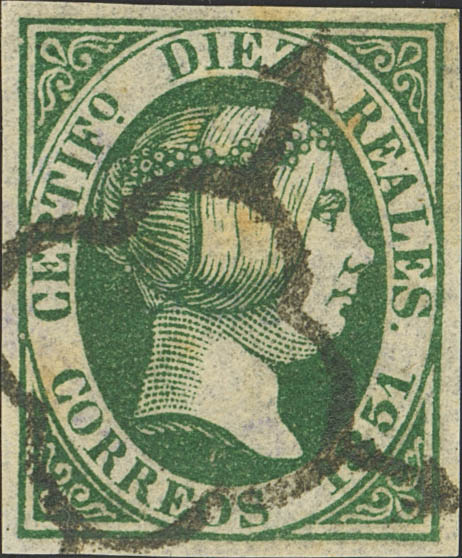 11F. 1851. 10 green reales. FALSE SPERATI (Type A), on the back the MAGNIFICO BPA mark.