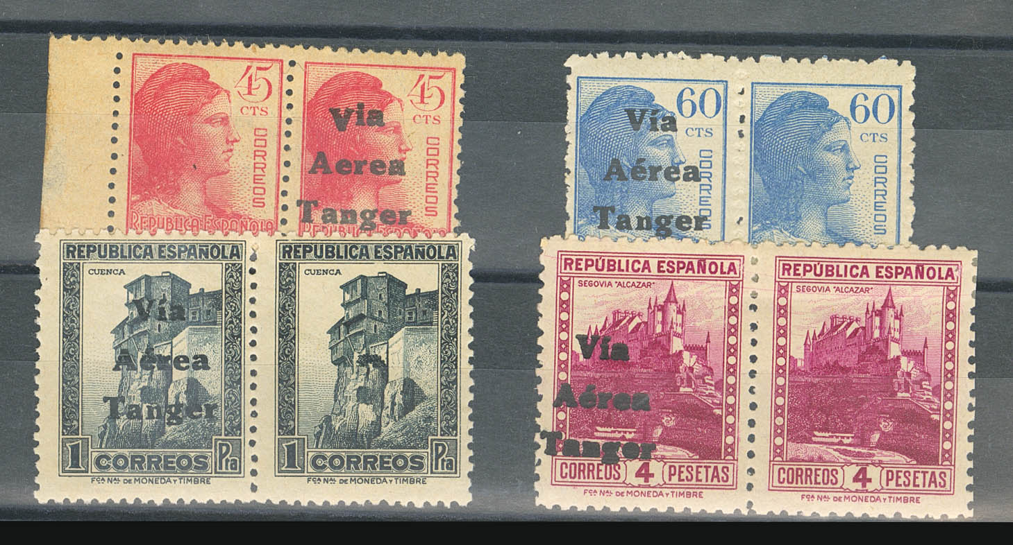 ★★/★ 135hph, 137/39hph. 1938. 45 cts pink, 60 cts blue, 1 pt slate, and 4 pts carmine lilac, in pairs. Variety: ONE STAMP WITHOUT OVERLOAD. MAGNIFICENT AND VERY RARE. Edifil 2018: 435 Euros