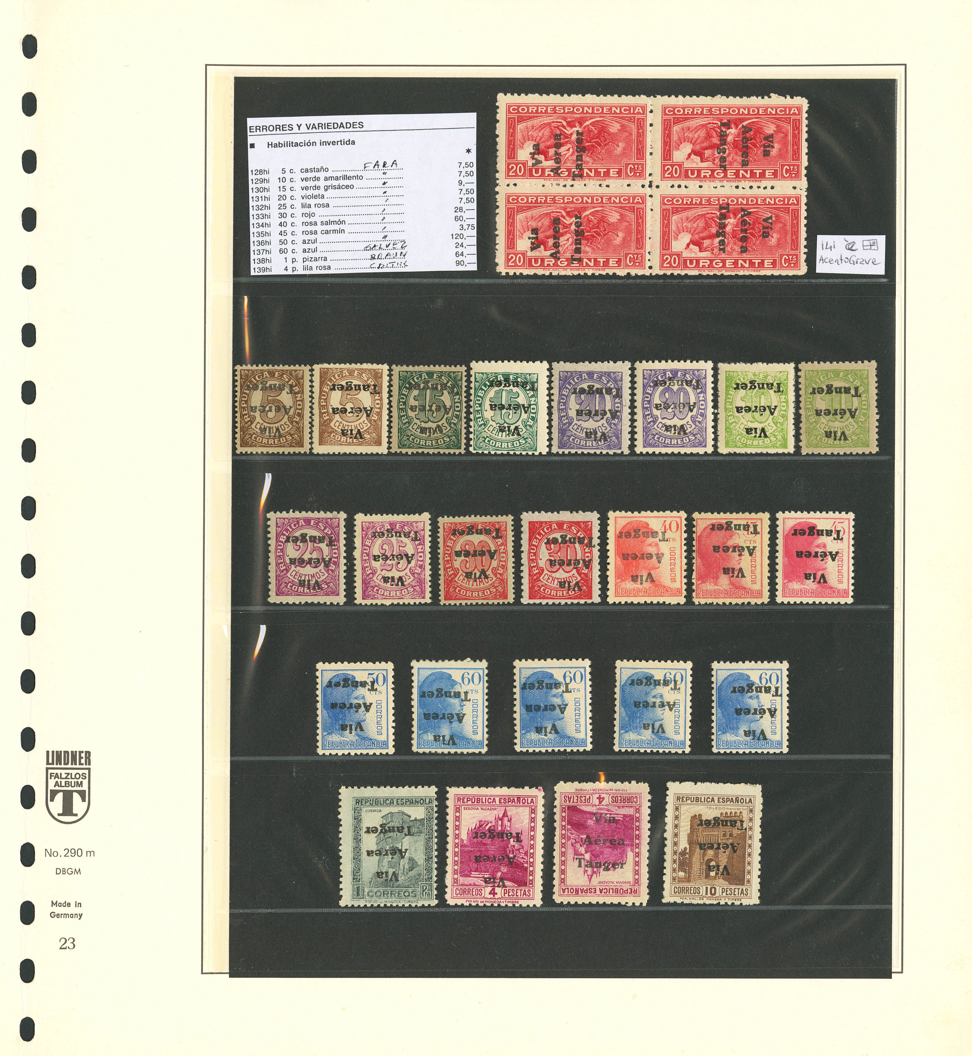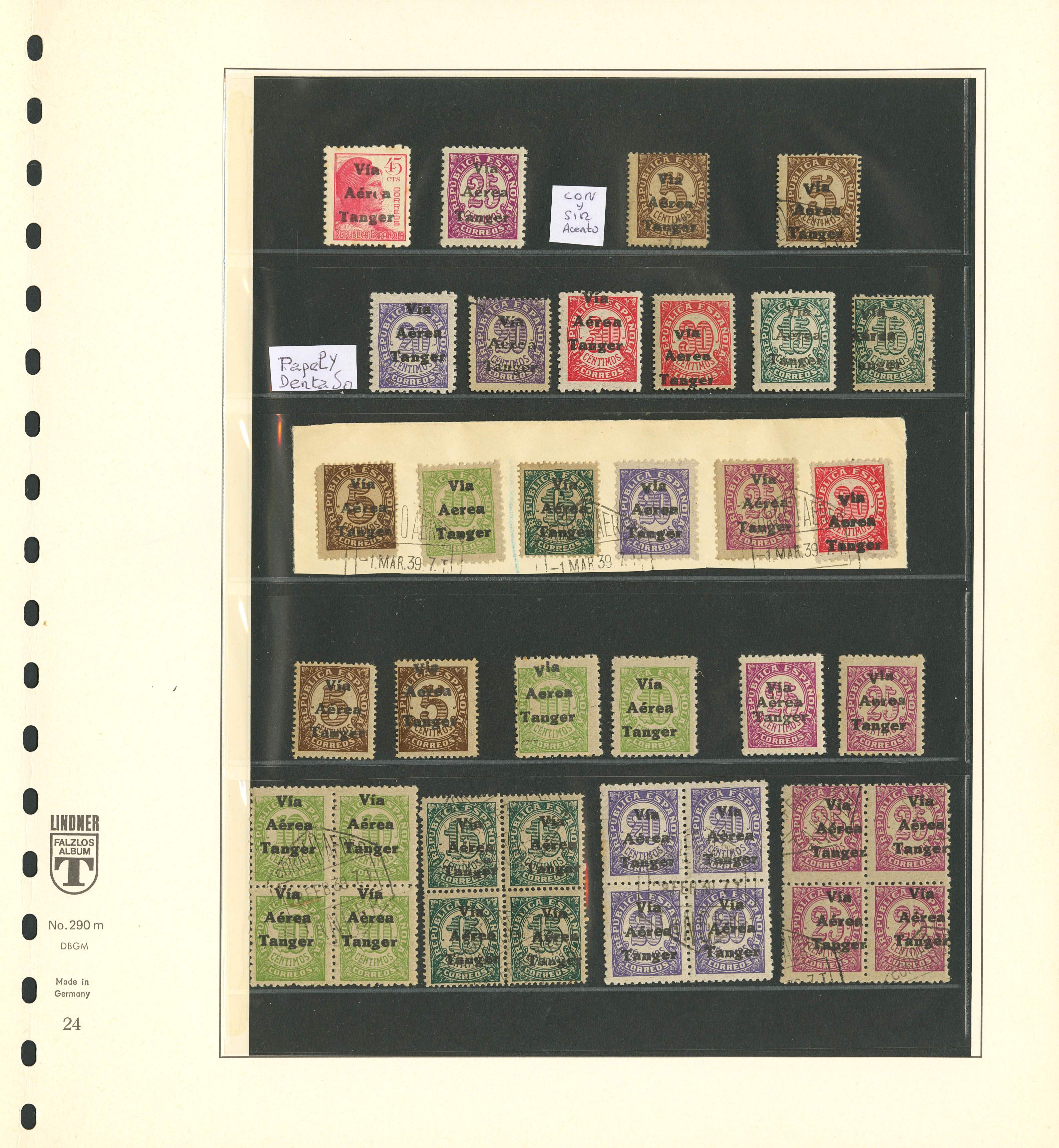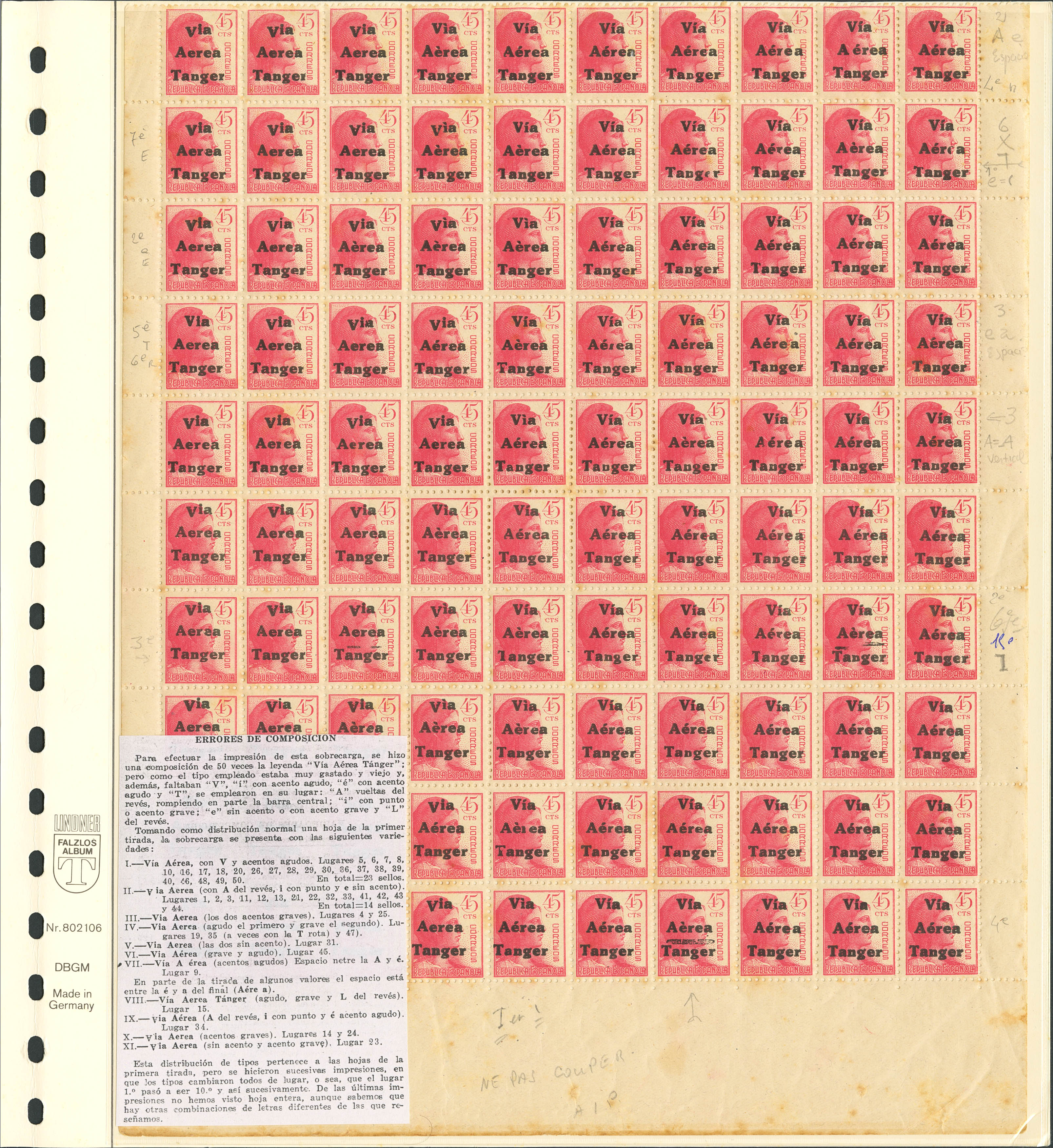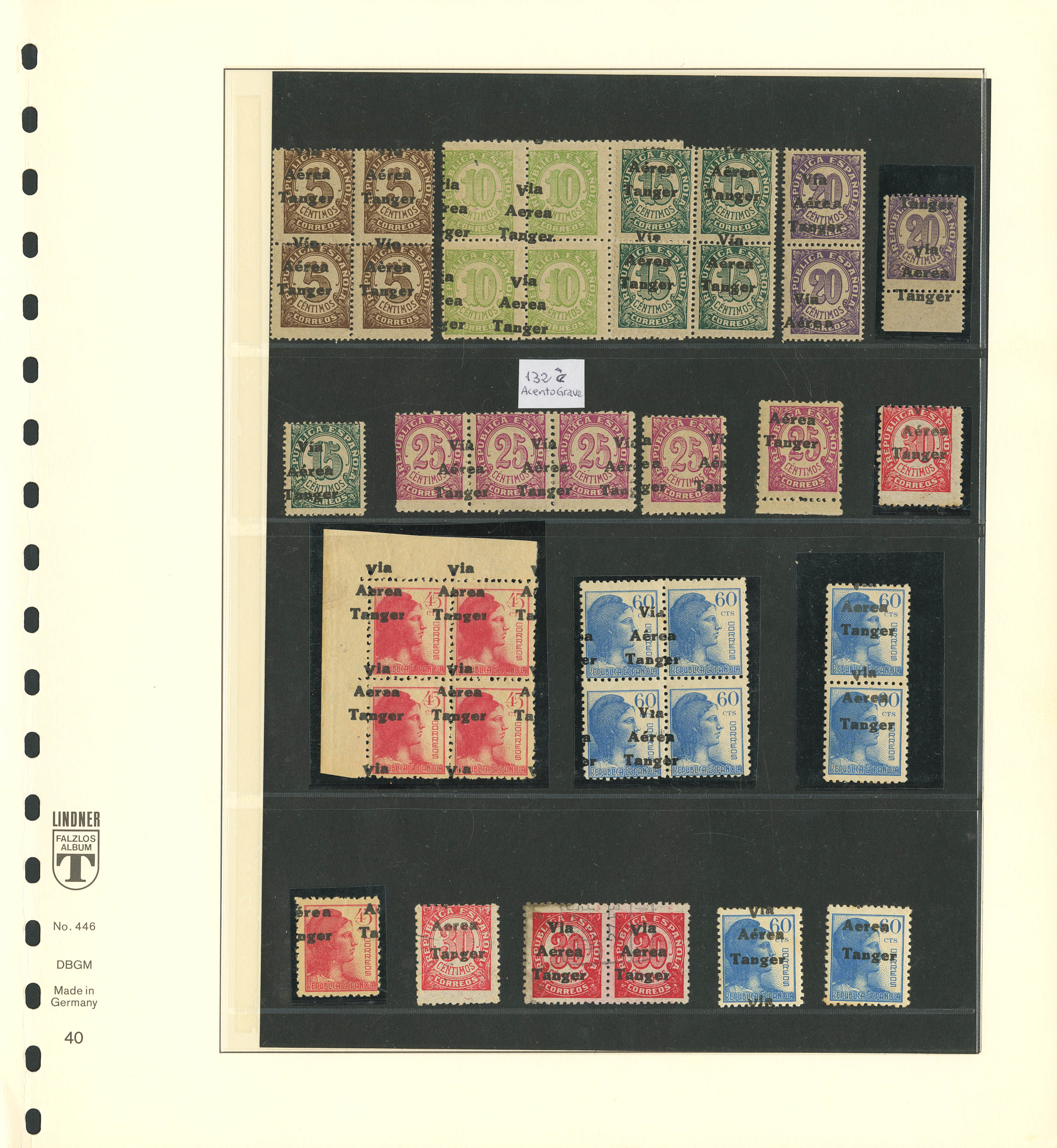 English ★★/★1938. Spectacular set from the 1938 issue with VIA / AEREA / TANGER overprint, including the standard series and numerous overprint varieties such as inverted, double, offset, inverted "L", pairs with an unoverprinted stamp, etc., plus some used stamps, two registered letters, and three large blocks of 45-cent stamps. EXTREMELY HIGH CATALOG VALUE. EXAMINATION IS ESSENTIAL.