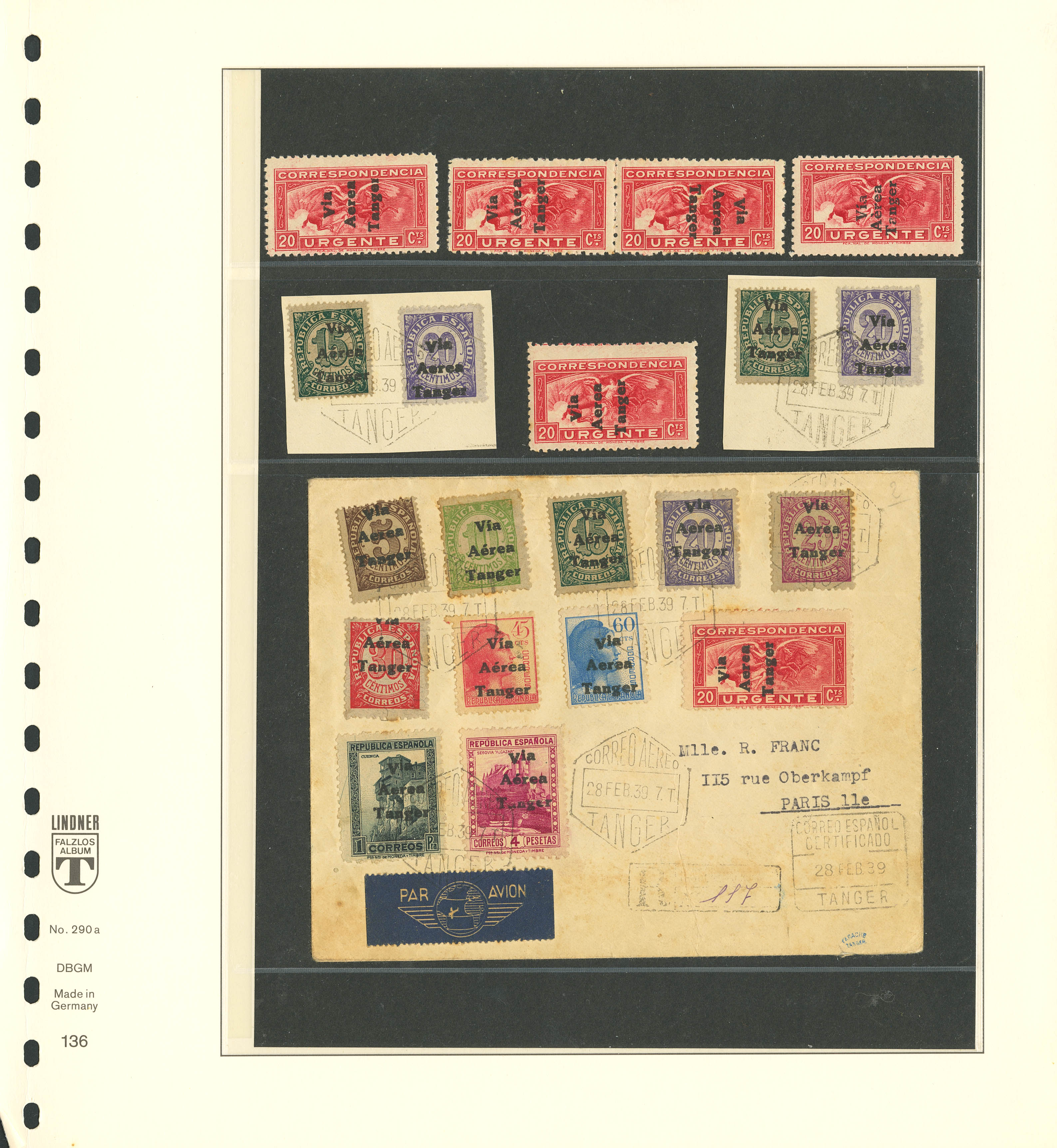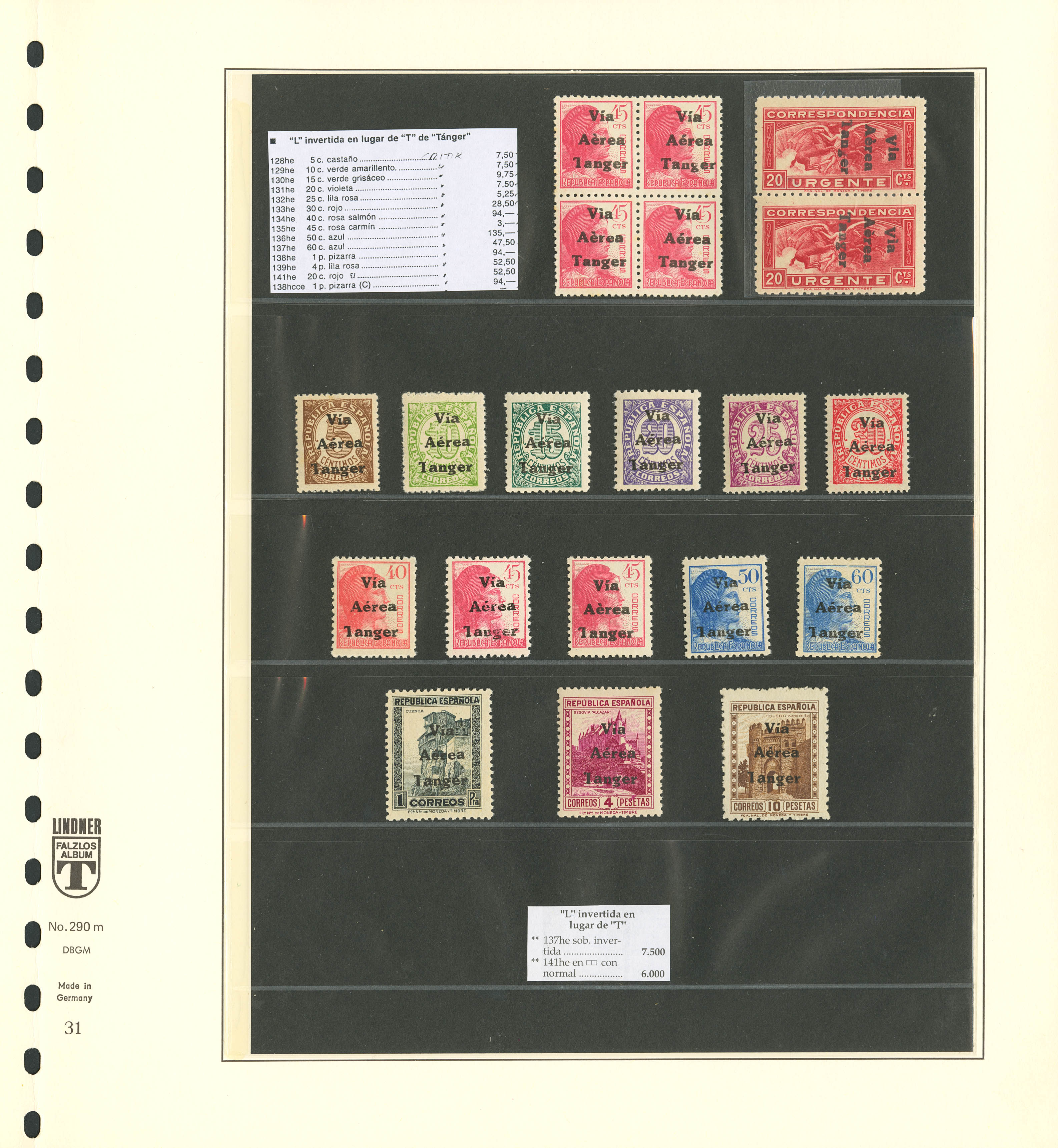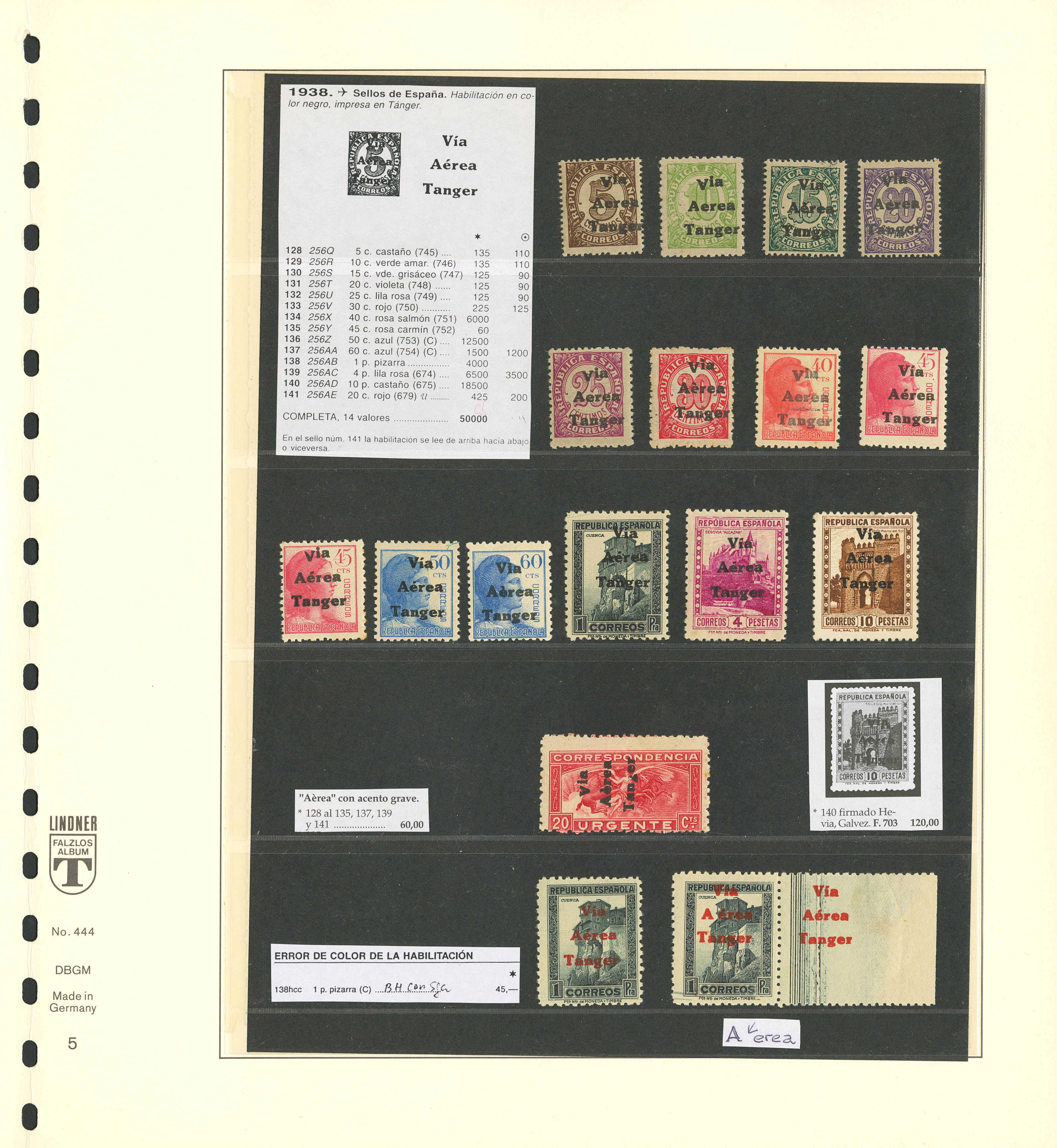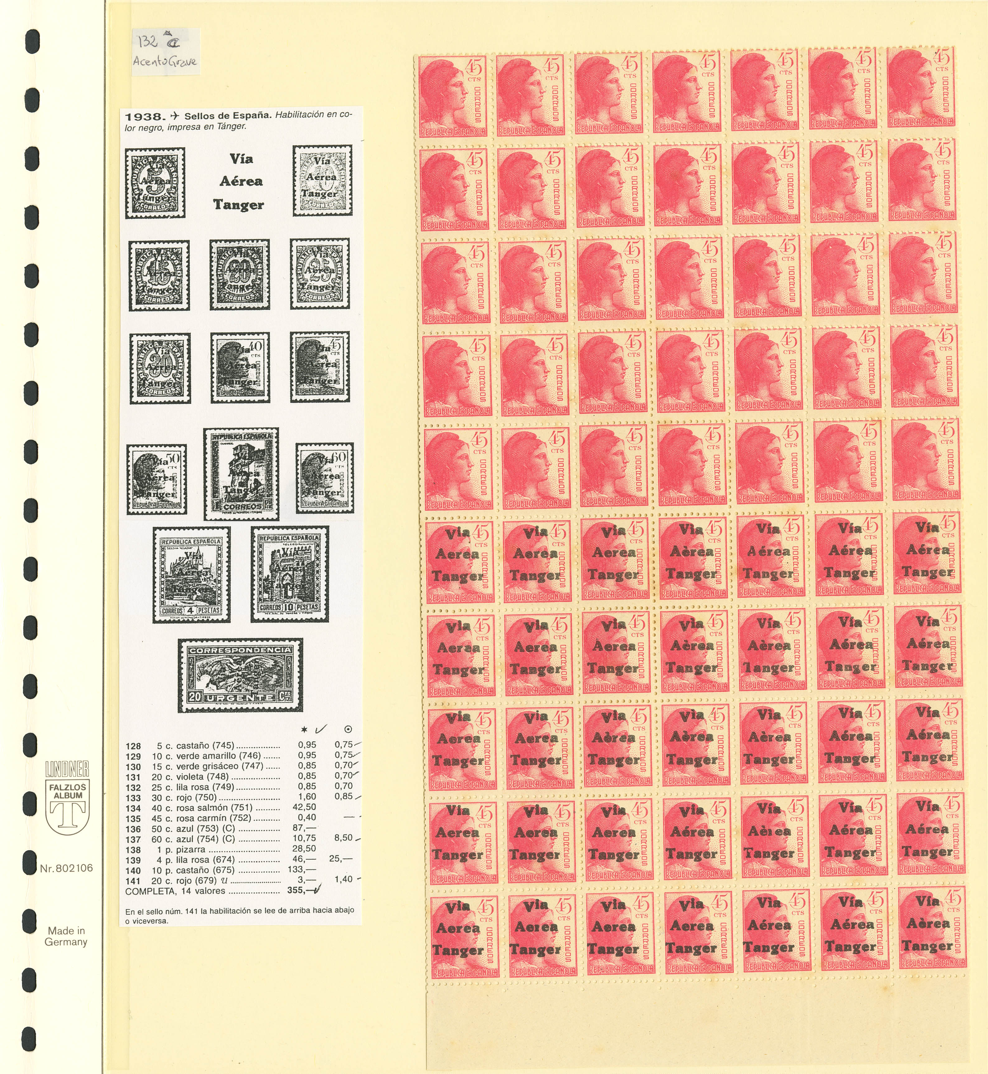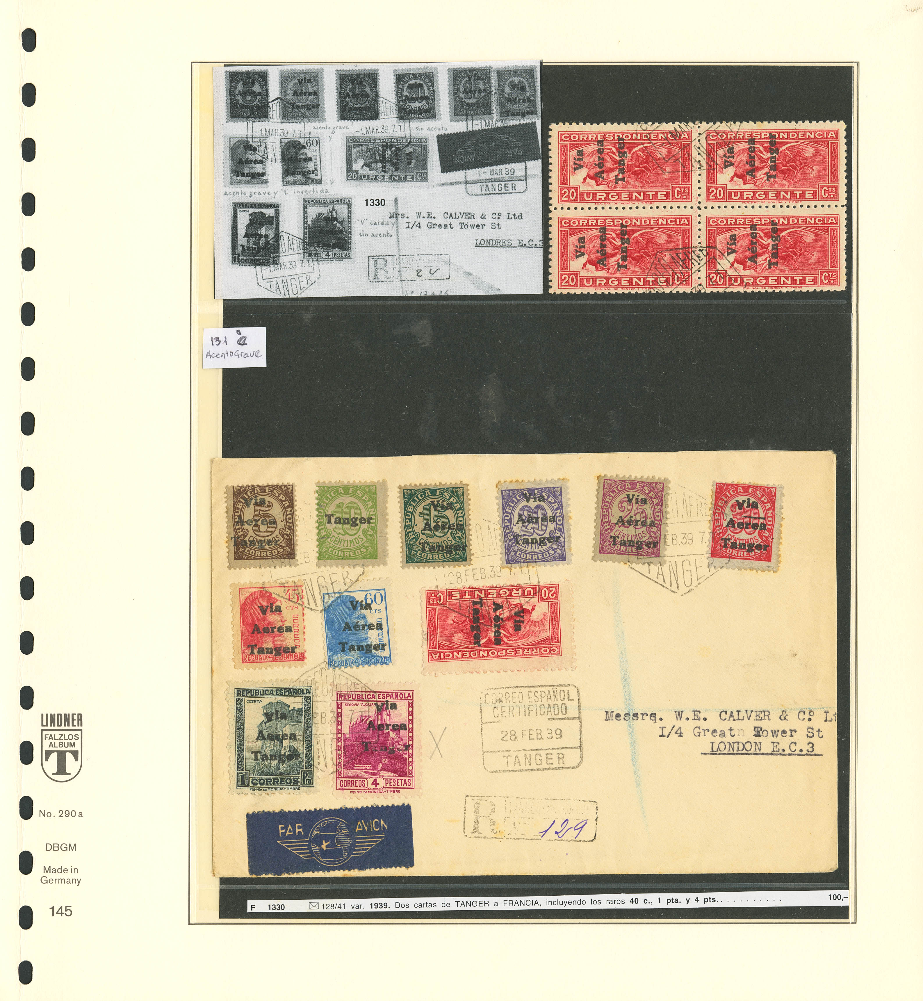 English ★★/★1938. Spectacular set from the 1938 issue with VIA / AEREA / TANGER overprint, including the standard series and numerous overprint varieties such as inverted, double, offset, inverted "L", pairs with an unoverprinted stamp, etc., plus some used stamps, two registered letters, and three large blocks of 45-cent stamps. EXTREMELY HIGH CATALOG VALUE. EXAMINATION IS ESSENTIAL.