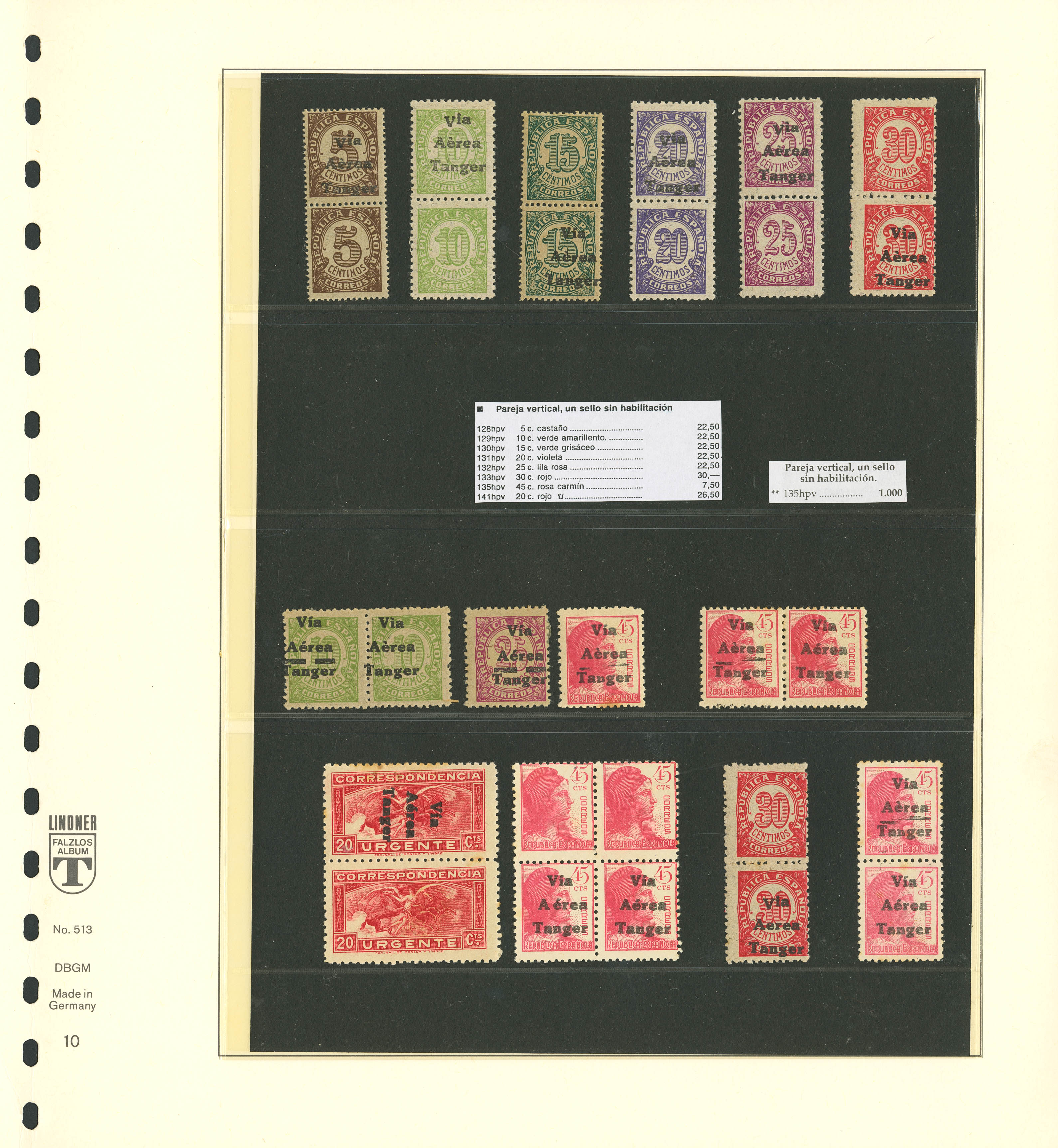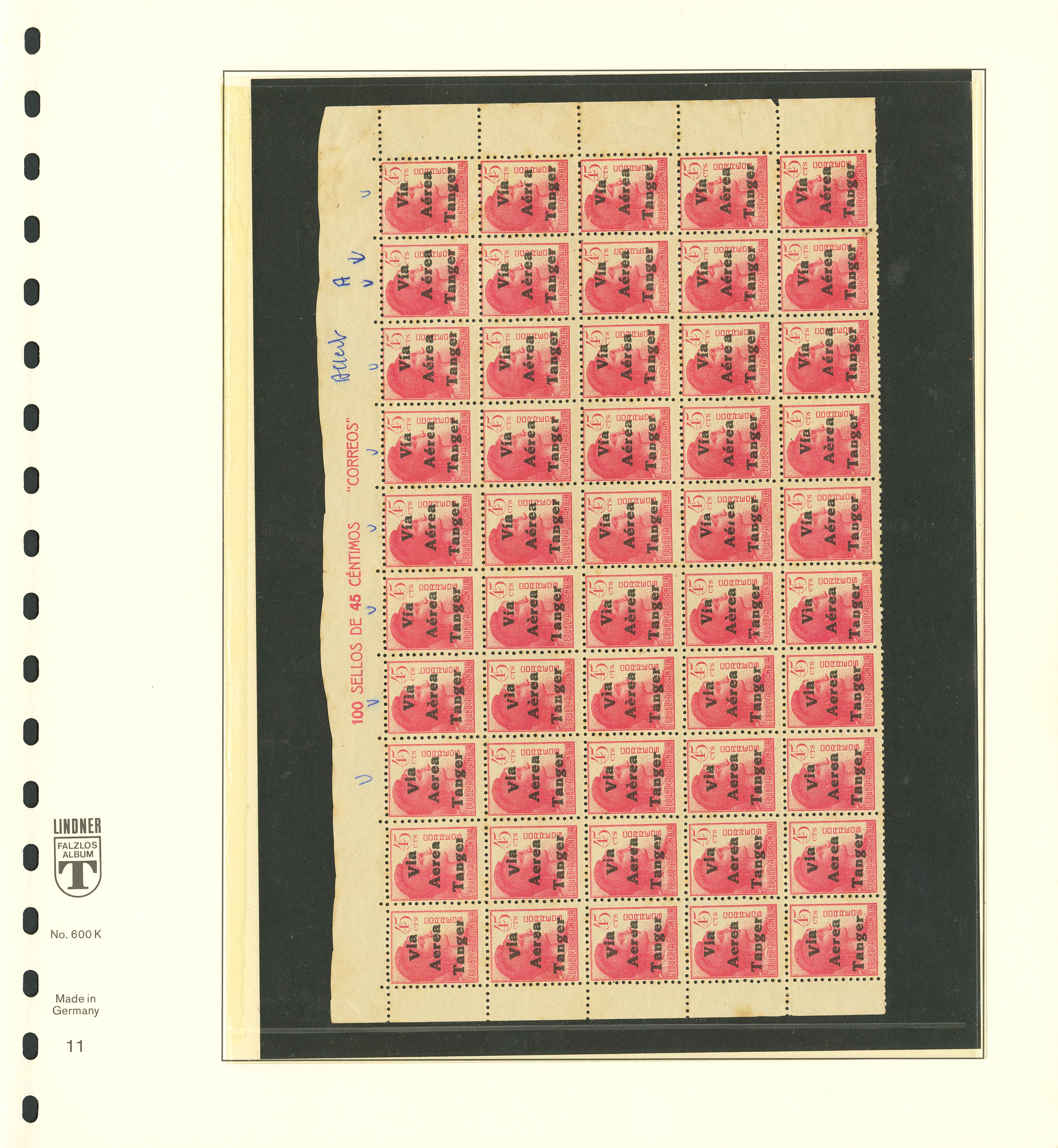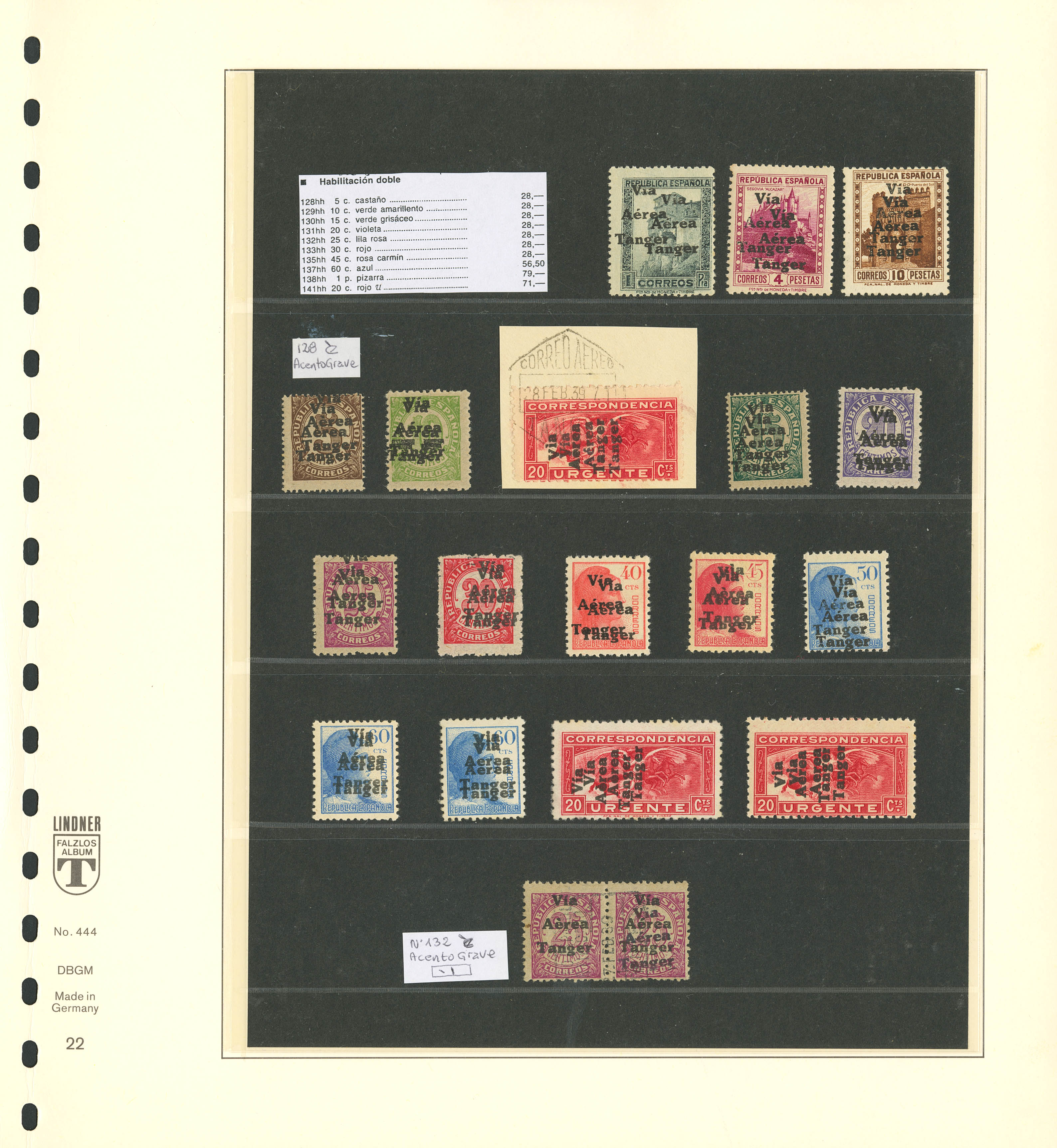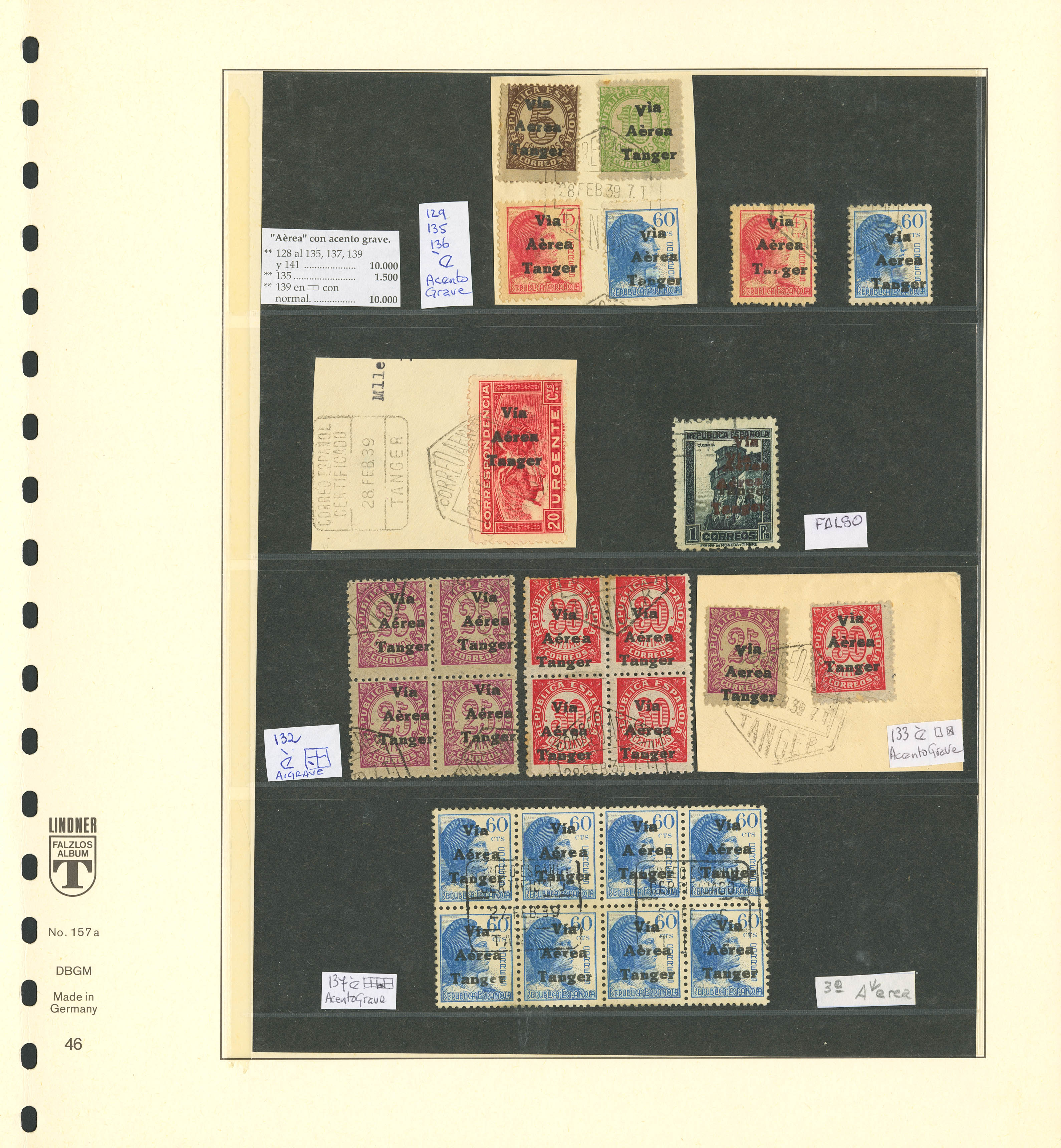 English ★★/★1938. Spectacular set from the 1938 issue with VIA / AEREA / TANGER overprint, including the standard series and numerous overprint varieties such as inverted, double, offset, inverted "L", pairs with an unoverprinted stamp, etc., plus some used stamps, two registered letters, and three large blocks of 45-cent stamps. EXTREMELY HIGH CATALOG VALUE. EXAMINATION IS ESSENTIAL.