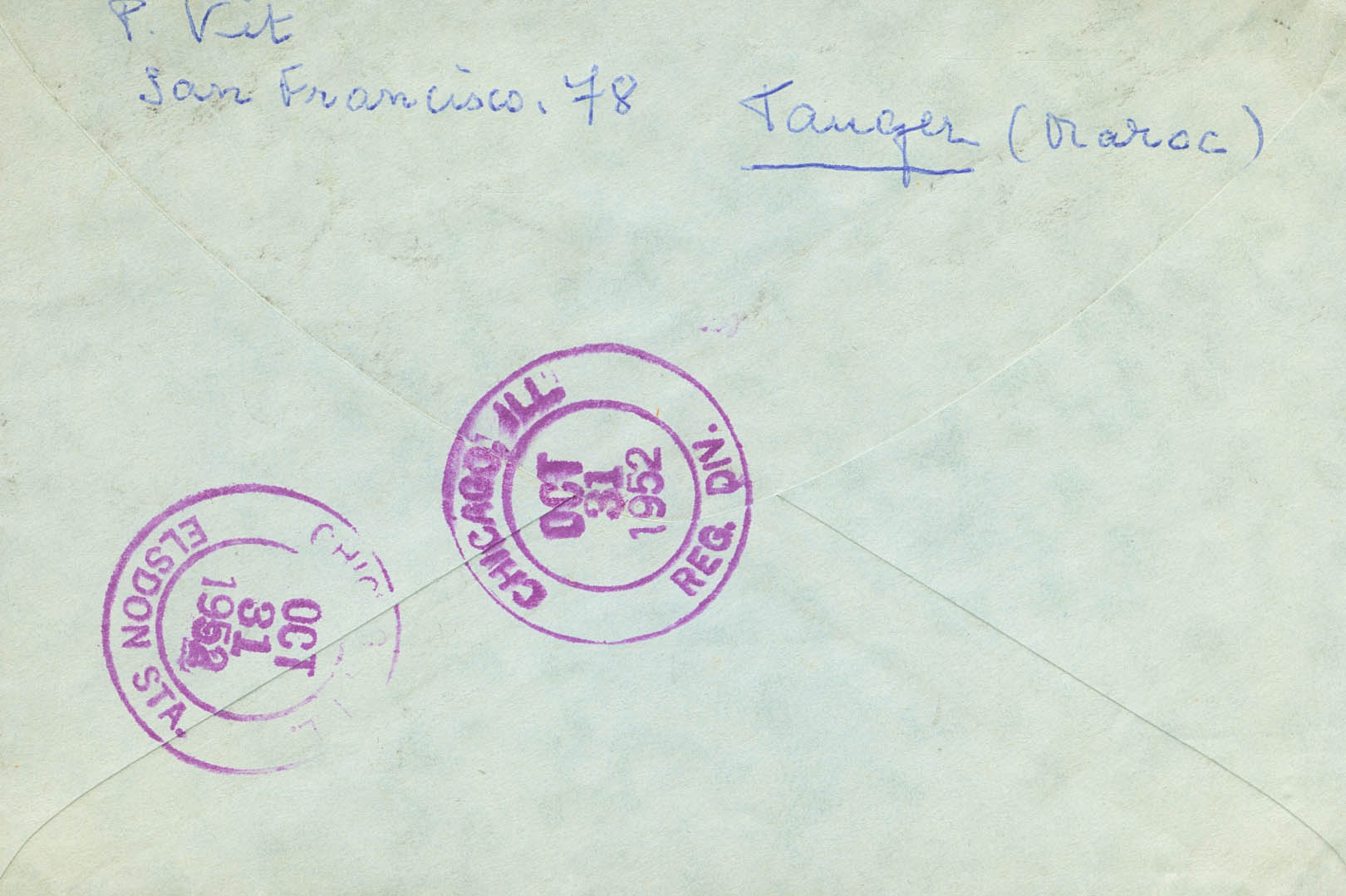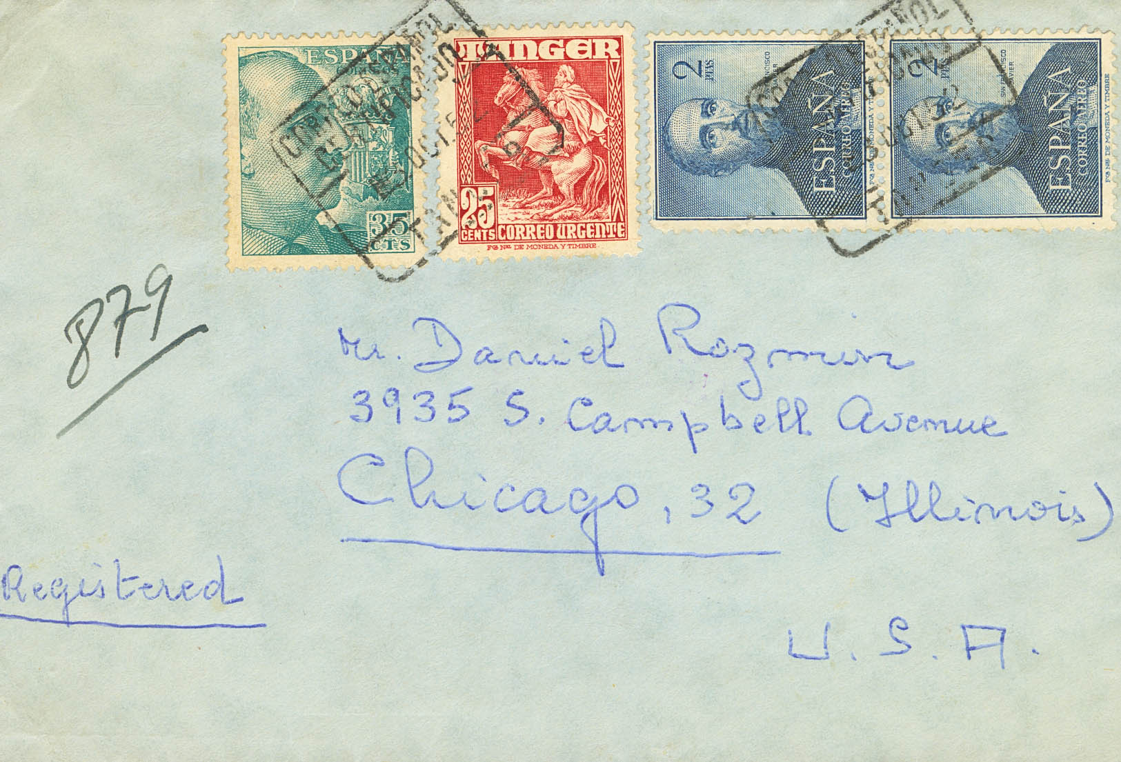 165, Spain 1118(2), 1050. 1952. 25 cts red and 2 pts blue Spanish stamps, two stamps and 35 cts turquoise blue. Certificate from TANGER to CHICAGO (USA). Arrival on the back. MAGNIFICENT.