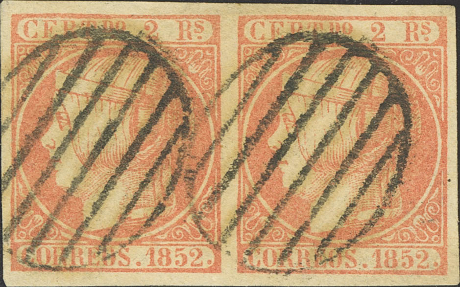 14F(2). 1852. 2 reales orange, pair. FAKE SPERATI, on the back signature of Jean Sperati and without the BPA mark. MAGNIFICENT AND VERY RARE PAIR.