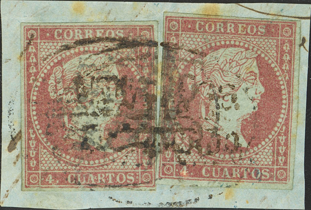 English △ 40(2). (1855ca). 4 cuartos red, two stamps, on fragment. Pre-philatelic postmark SANTIAGO / CERTIFICATE (we are inclined to deduce that it is this mark given its appearance, the originality of the ink is not in doubt). TO BE EXAMINED.