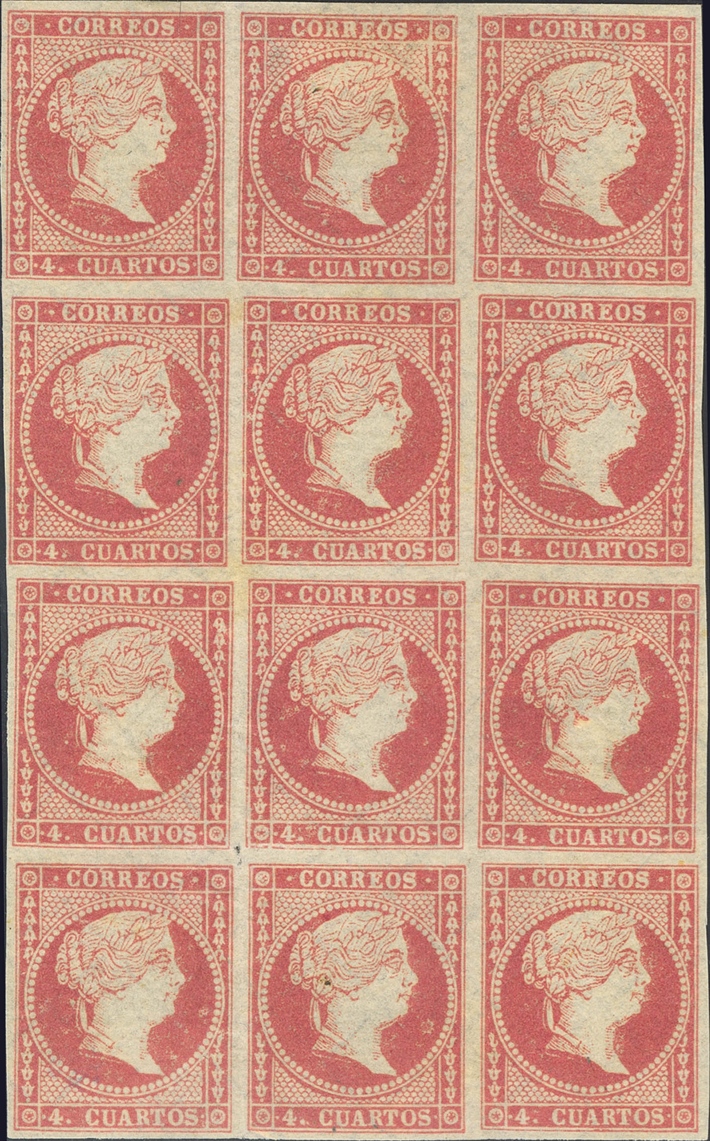 (★) 44(12). 1855. 4 red quarters, block of twelve. MAGNIFICENT AND RARE BLOCK.