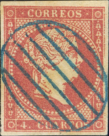 48. 1855. 4 quarts red. Postmark PARILLA, in blue. MAGNIFICENT.