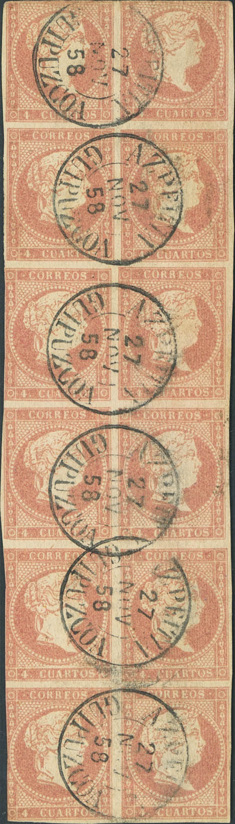 48(12). 1855. 4 cuartos red, block of twelve. Postmark AZPEITIA / GUIPUZCOA (Type I). MAGNIFICENT AND RARE.