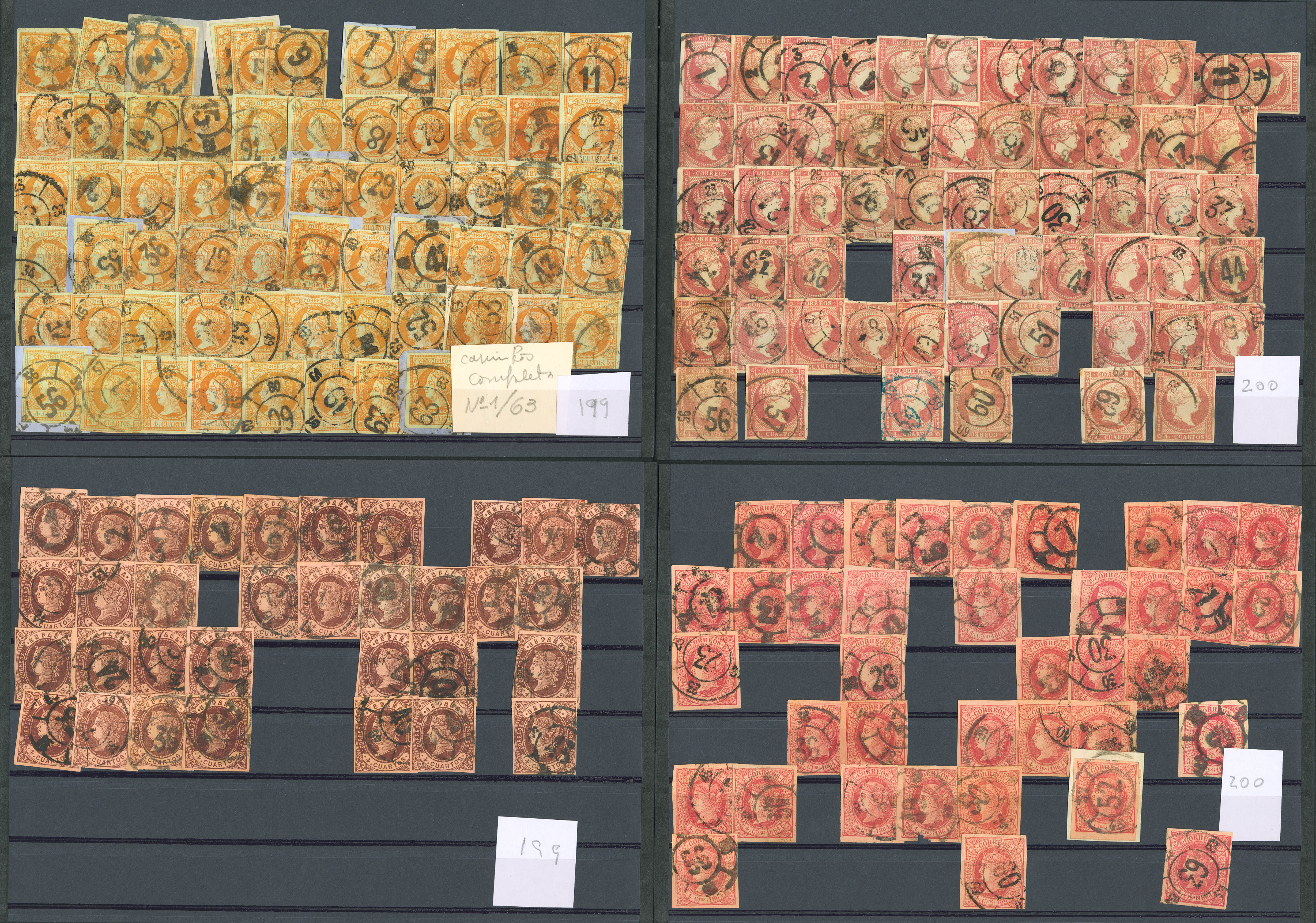 48, 52, 58, 64. (1860ca). Interesting complete set of the sixty-three different Wagon Wheel postmarks on the orange 4-quart note of 1860 and attempts at reconstruction on the 4-quart notes of 1855, 1862 and 1864. MAGNIFICENT.