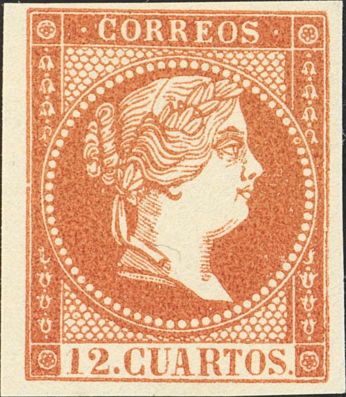 (★) NE1A. 1859. 12 orange cuartos NOT ISSUED. 2nd PRINT. MAGNIFICENT.