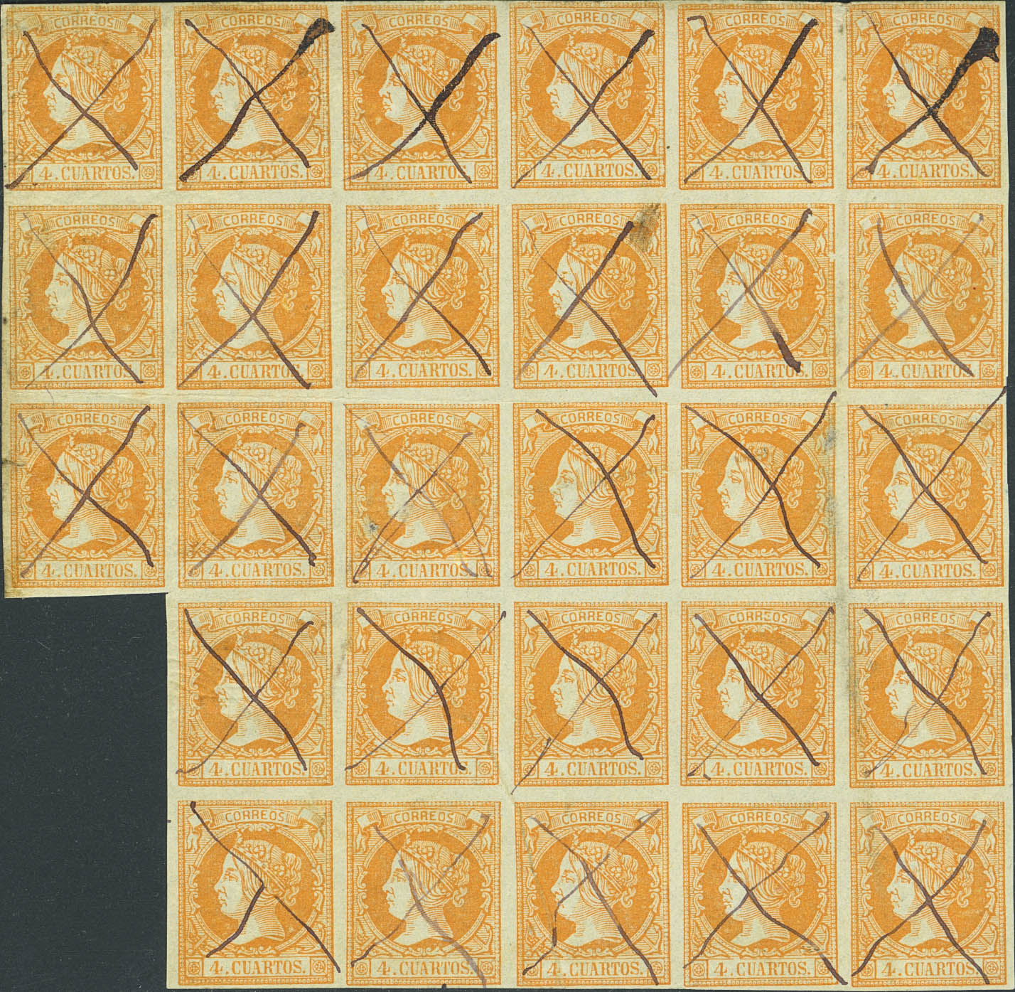 52(28). 1860. 4 orange quarts, block of twenty-eight. Defaced with cross-shaped pen strokes. MAGNIFICENT AND UNUSUAL.