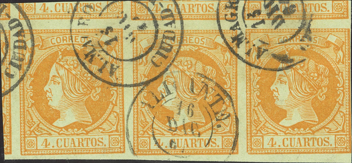 52(3). 1860. 4 orange cuartos, strip of three. Mixed postmark ALMAGRO / CIUDAD REAL and ALICANTE / (9). MAGNIFICA.