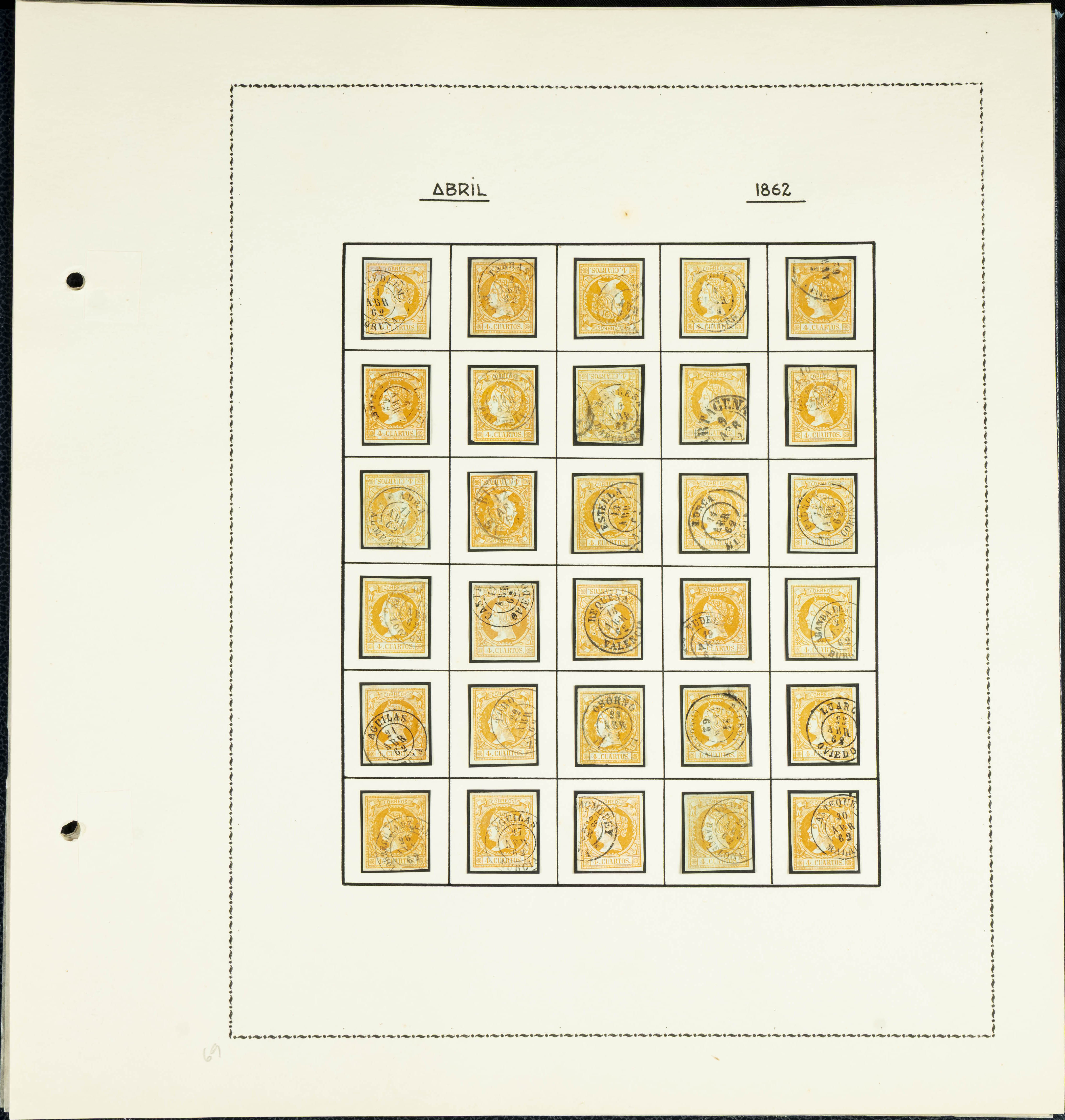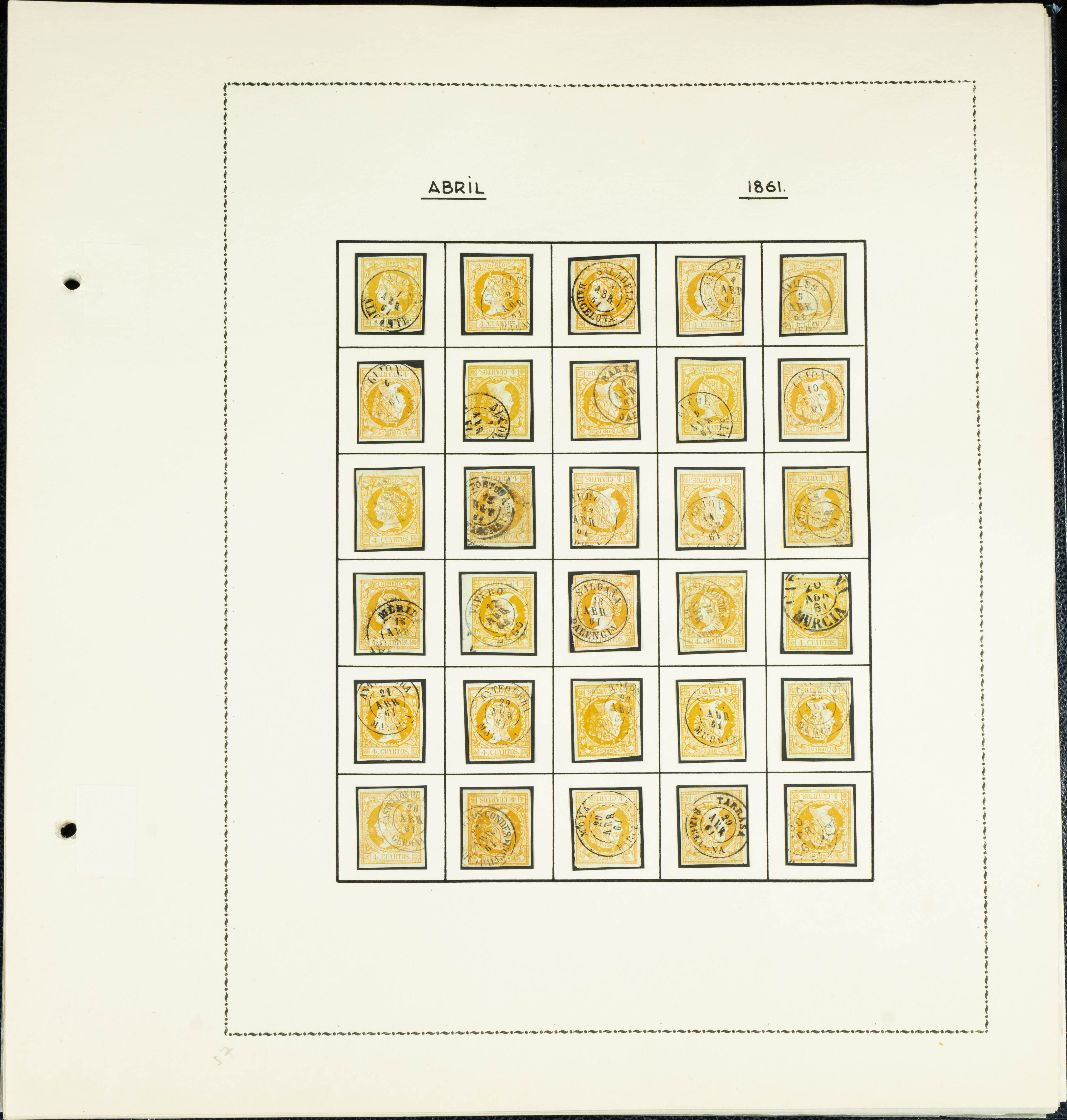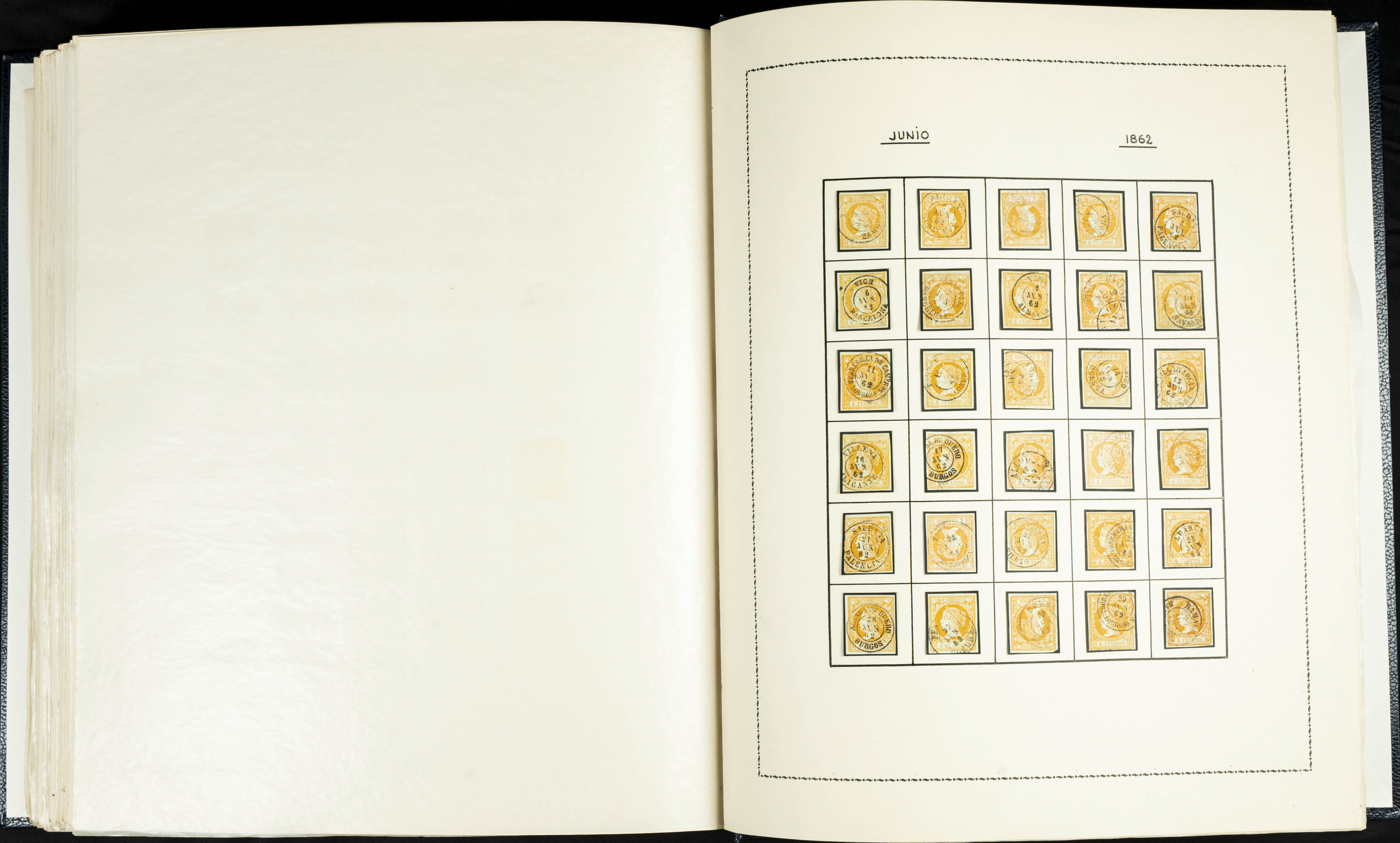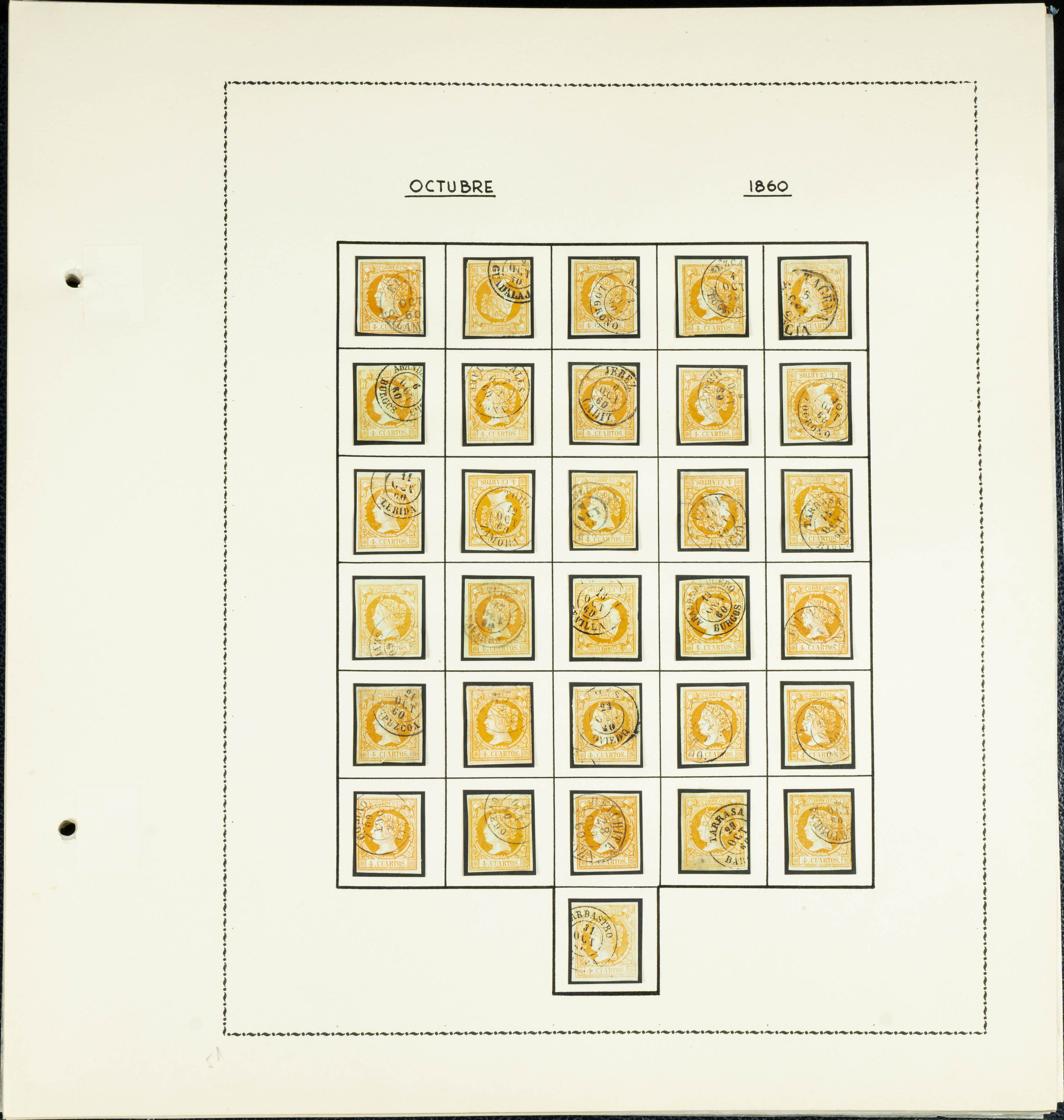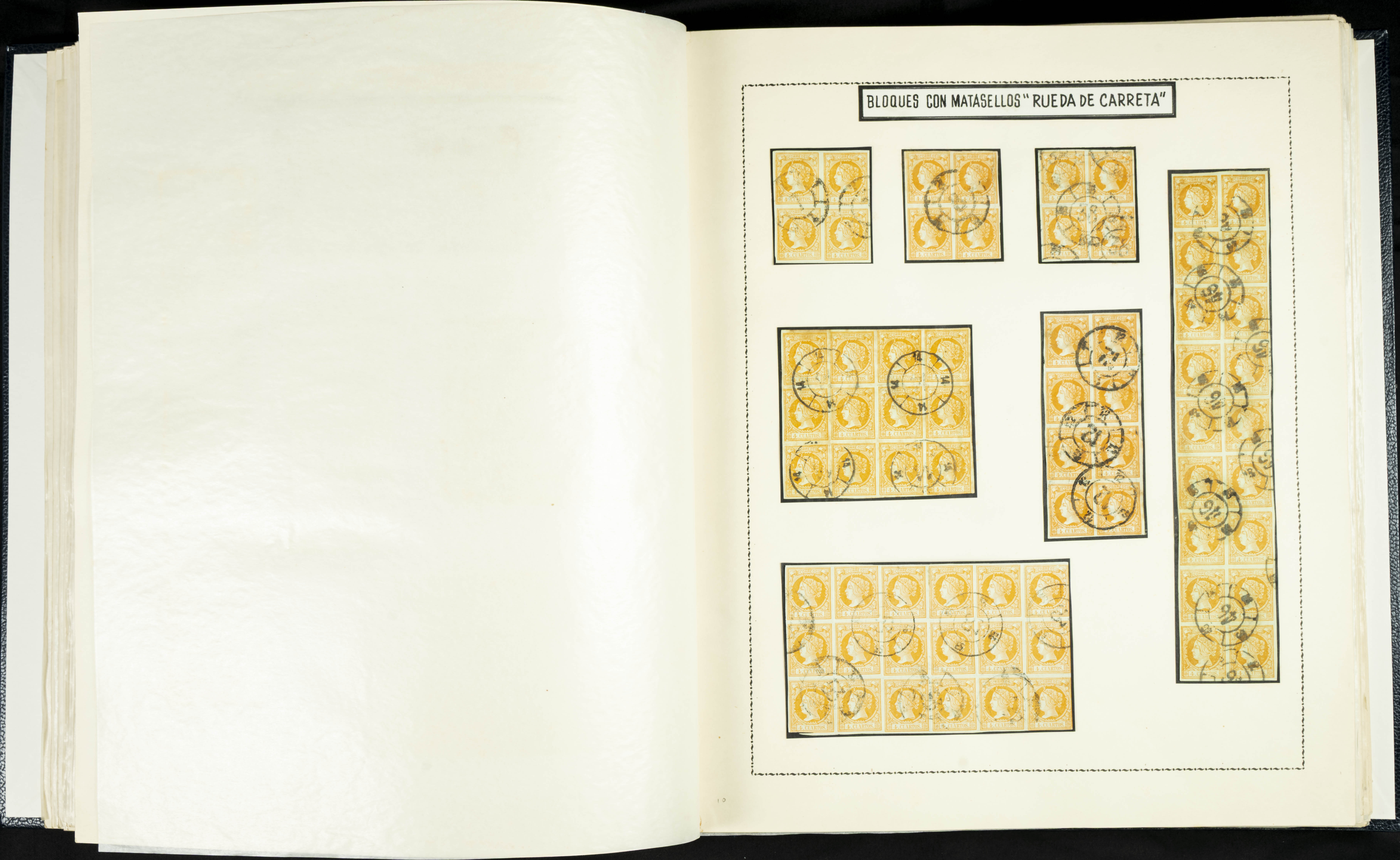 English 52. 1860. Spectacular collection of the yellow 4cuarto stamp, including countless stamps, blocks, fragments, and letters. Part of it is organized by province, especially the Type I and II date stamps. It includes a complete calendar of use, various clichés, a complete set of wagon wheel stamps, and almost a complete set of letter stamps, including the extremely rare No. 42. Individual highlights include a first-day cover stamp and letter, the perforated stamp used in Valencia on a letter (possibly the only one known), stamps and letters with pre-philatelic postmarks, and enormous blocks (spectacularly mounted in antique albums). A MUST-SEE.