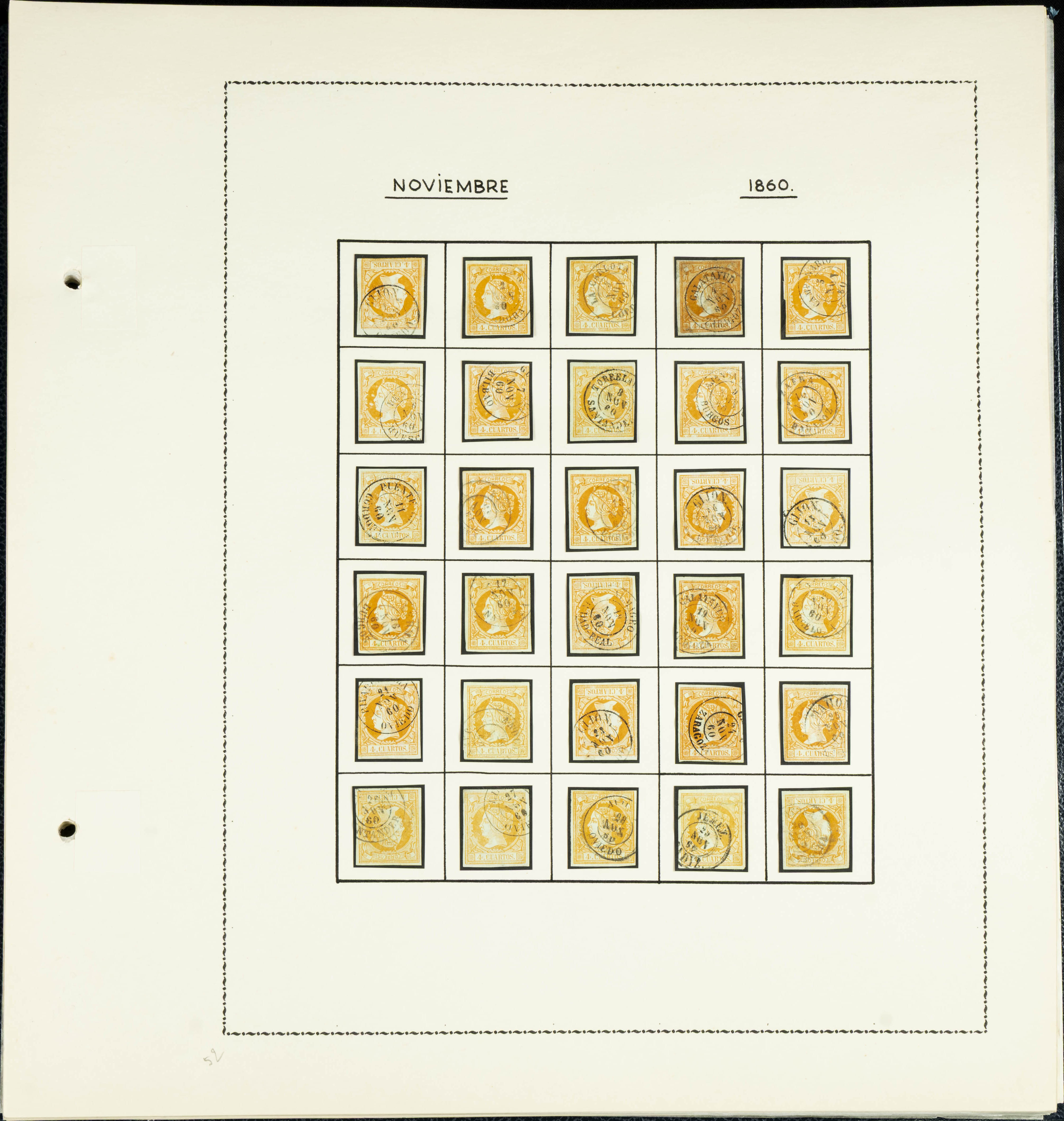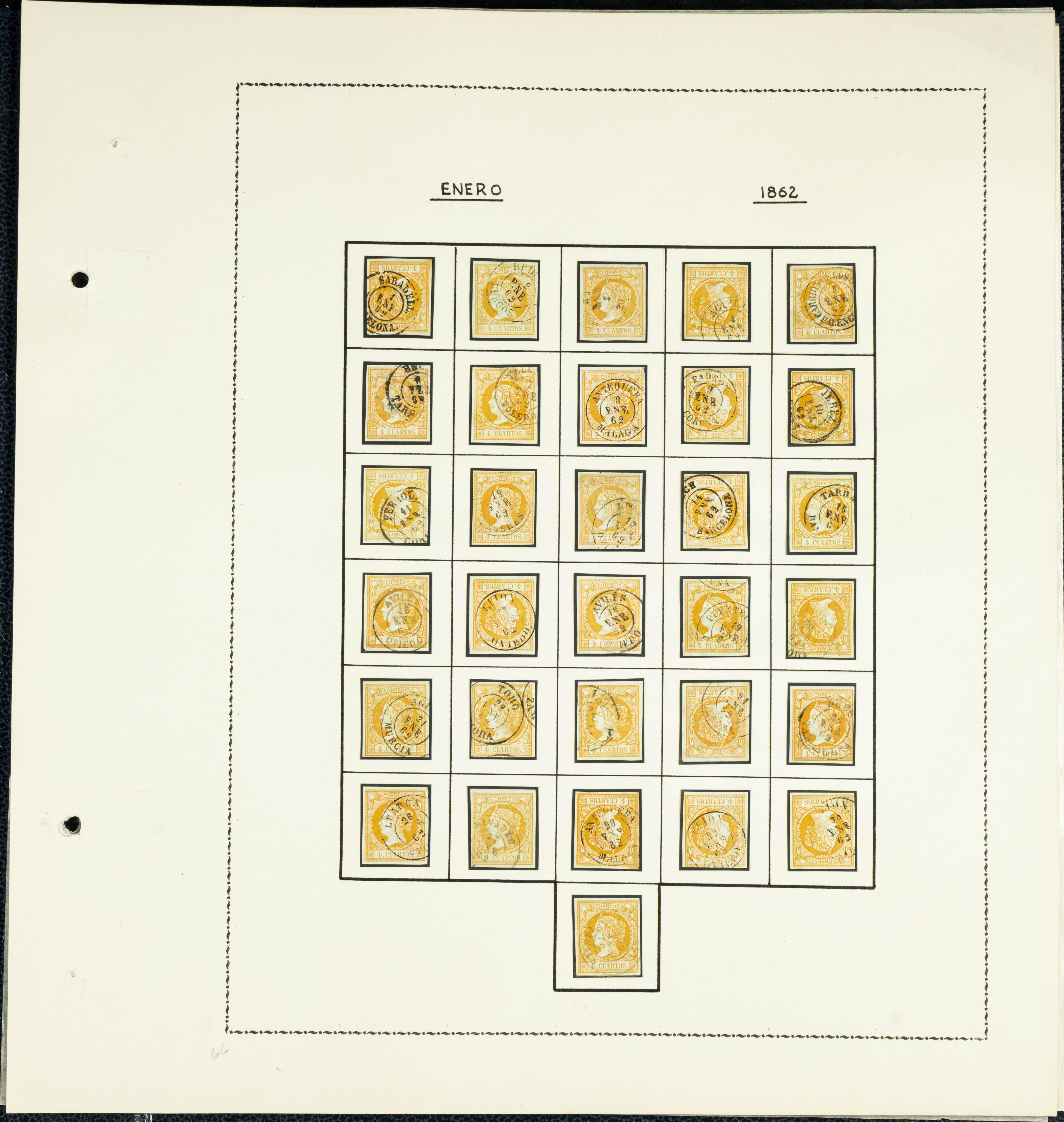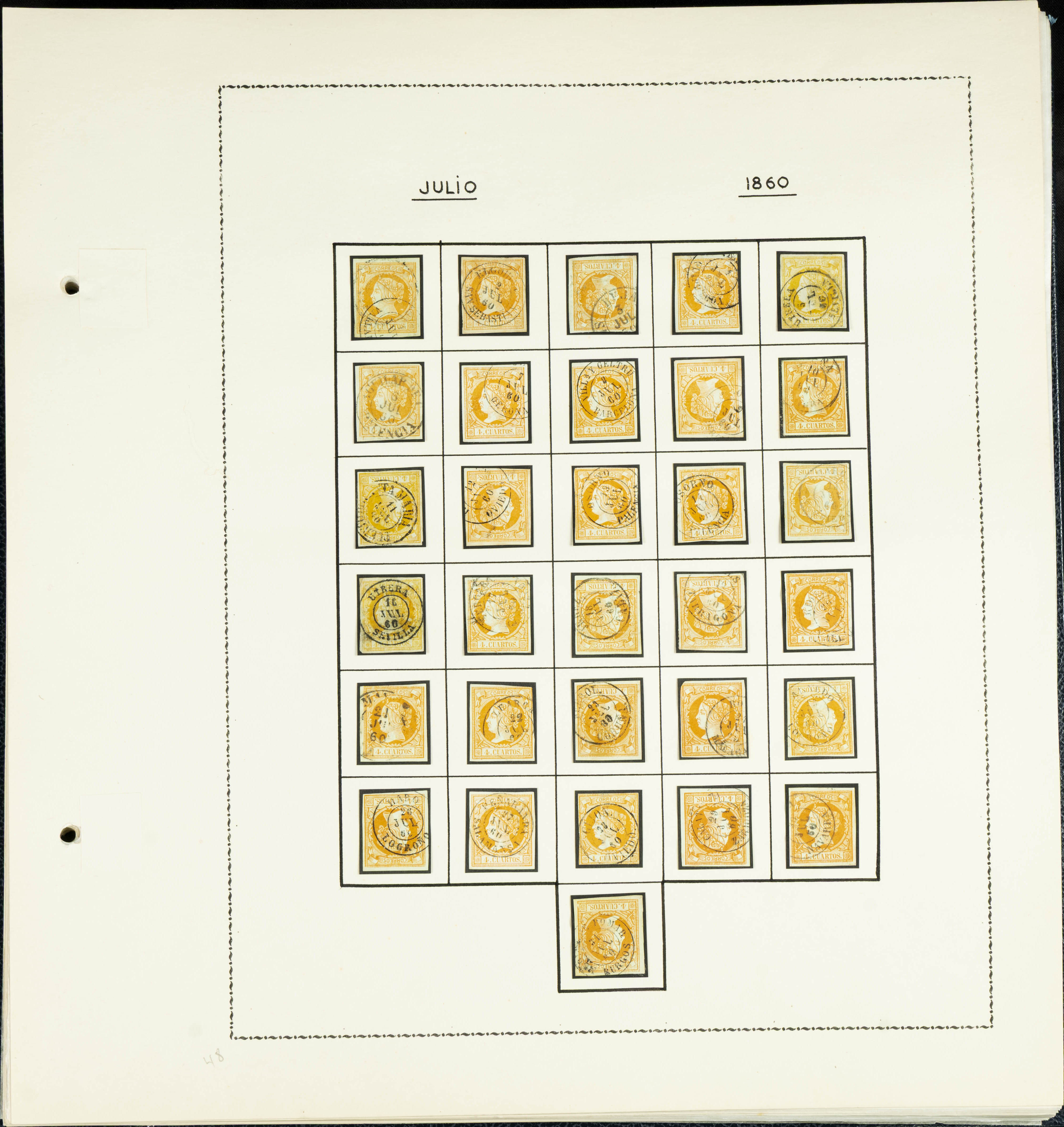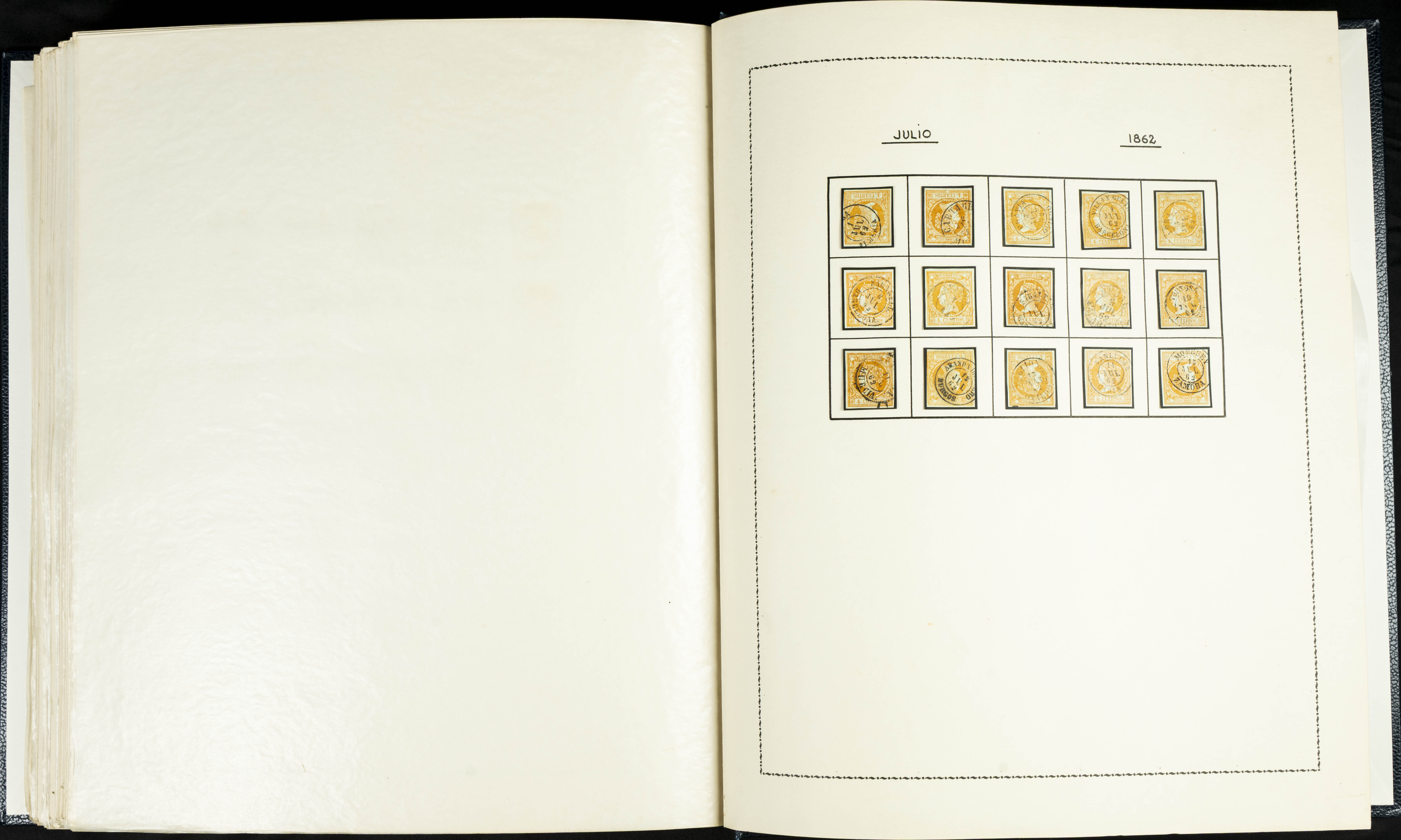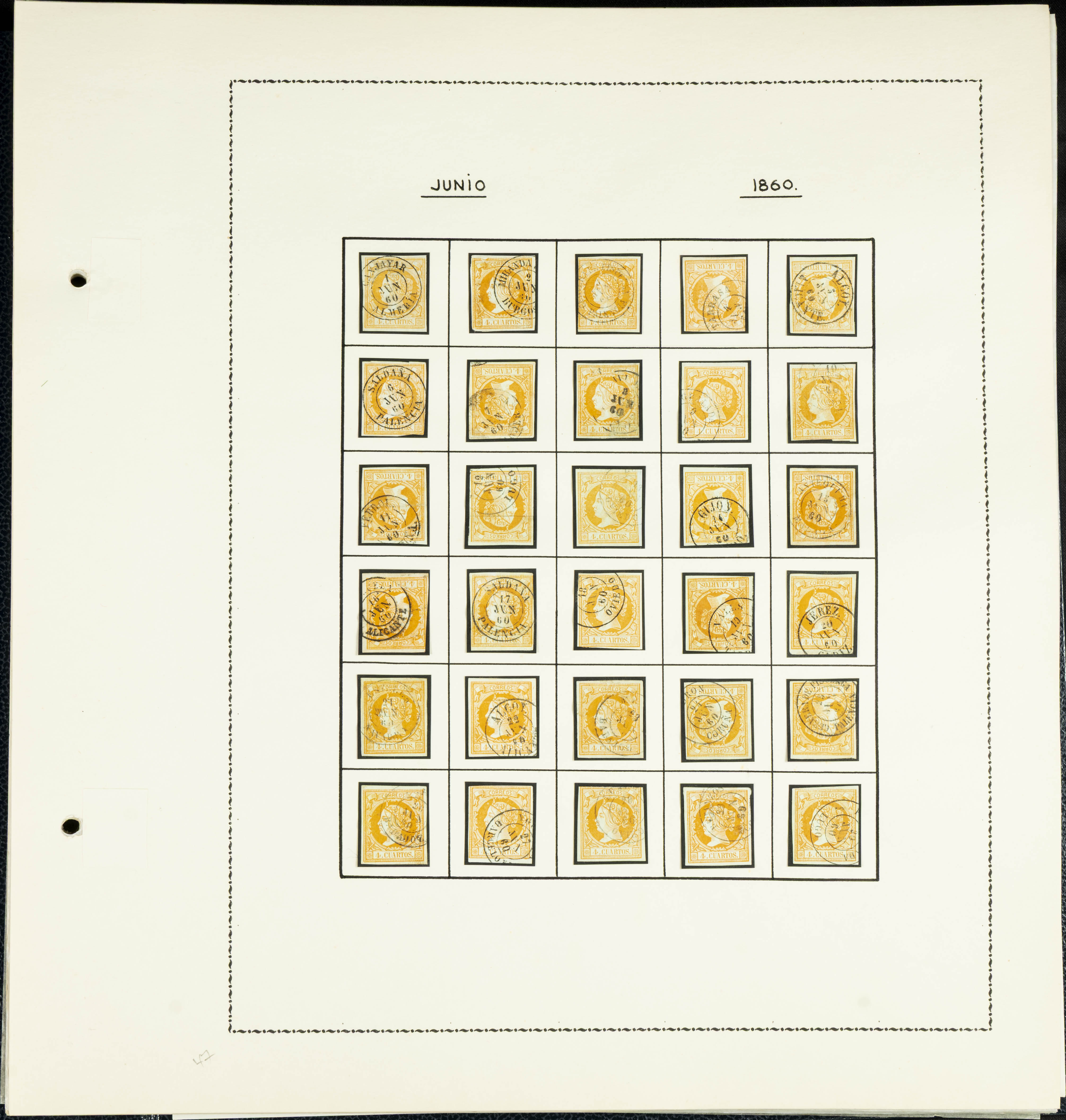 English 52. 1860. Spectacular collection of the yellow 4cuarto stamp, including countless stamps, blocks, fragments, and letters. Part of it is organized by province, especially the Type I and II date stamps. It includes a complete calendar of use, various clichés, a complete set of wagon wheel stamps, and almost a complete set of letter stamps, including the extremely rare No. 42. Individual highlights include a first-day cover stamp and letter, the perforated stamp used in Valencia on a letter (possibly the only one known), stamps and letters with pre-philatelic postmarks, and enormous blocks (spectacularly mounted in antique albums). A MUST-SEE.