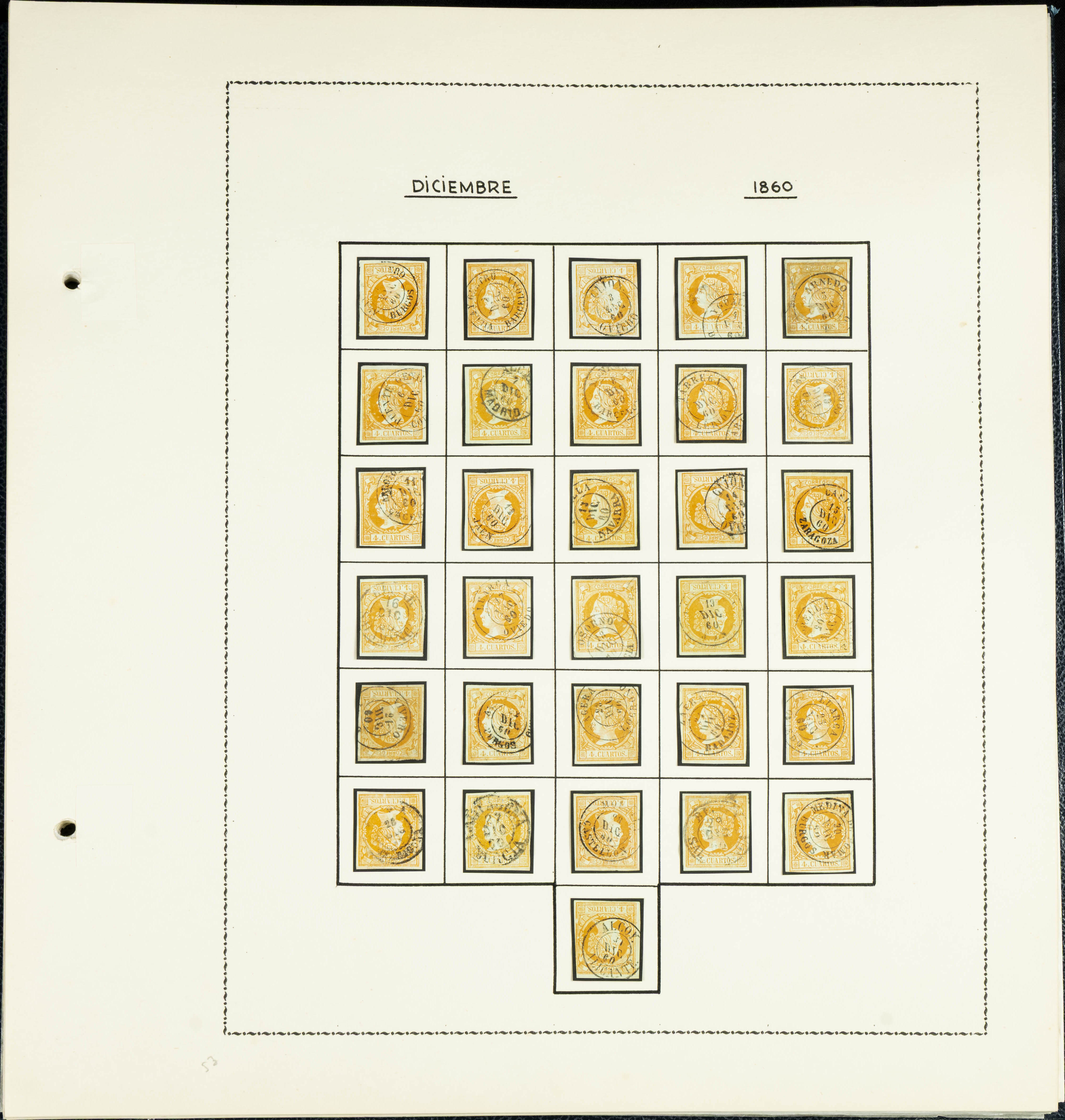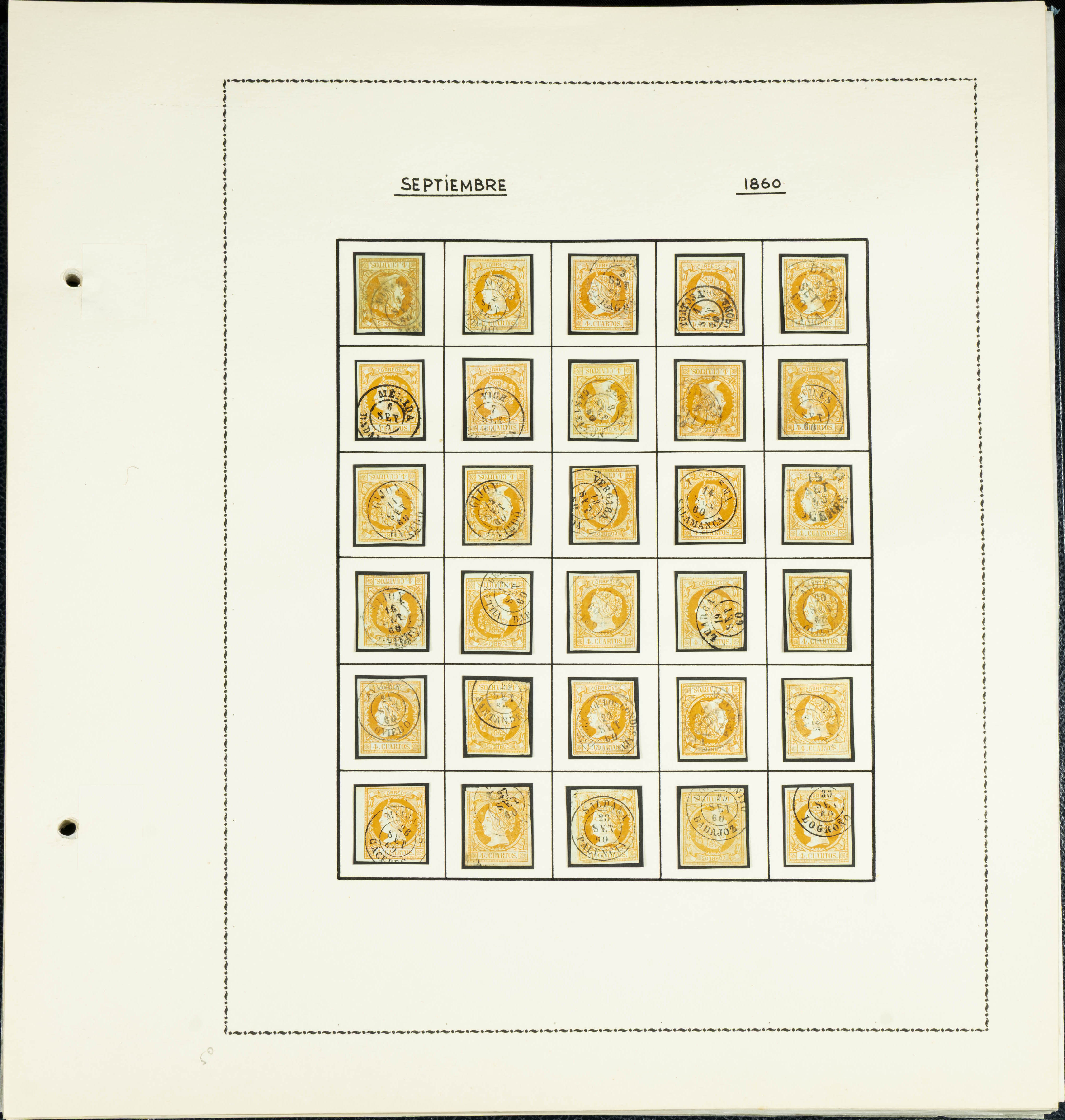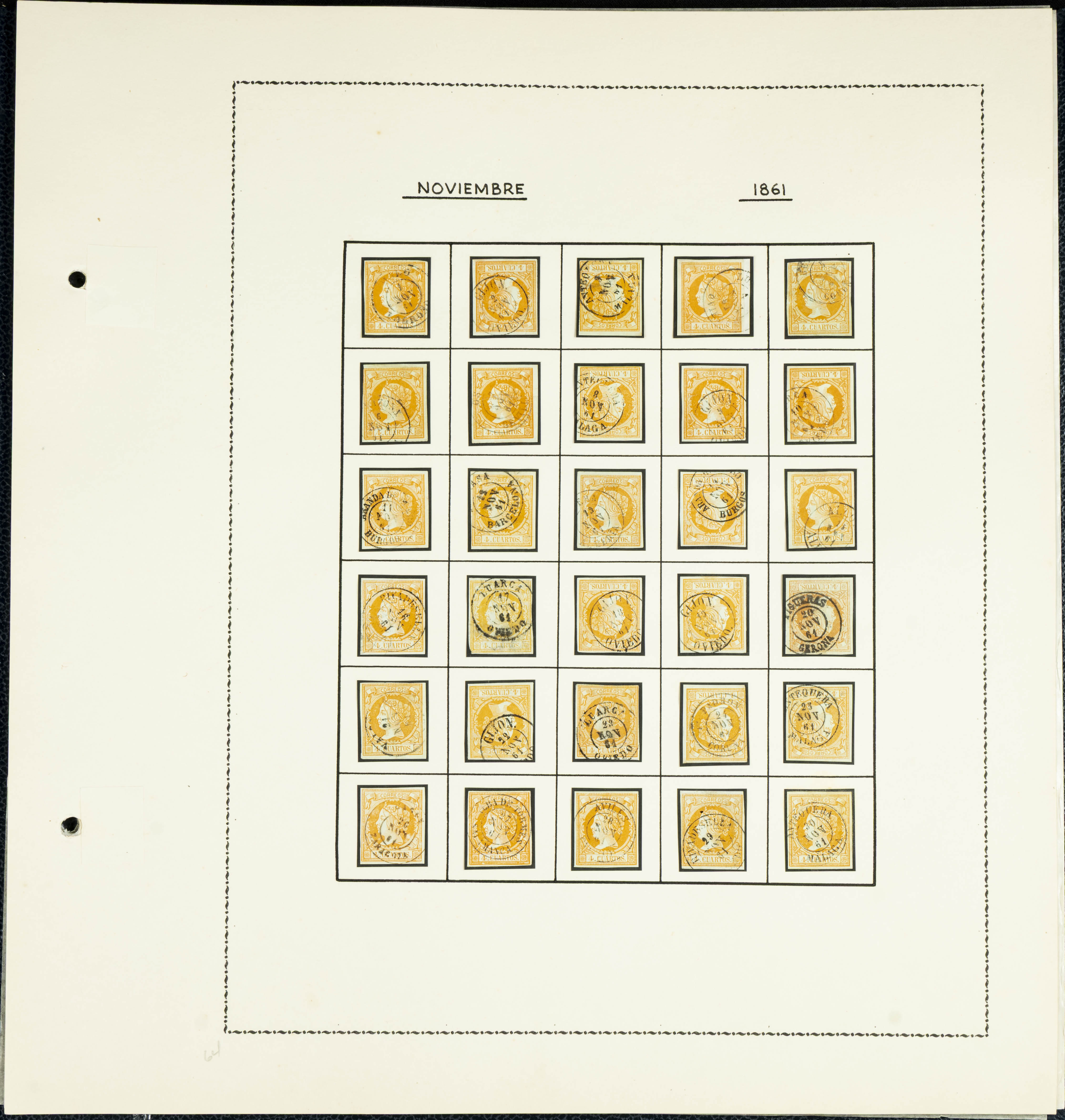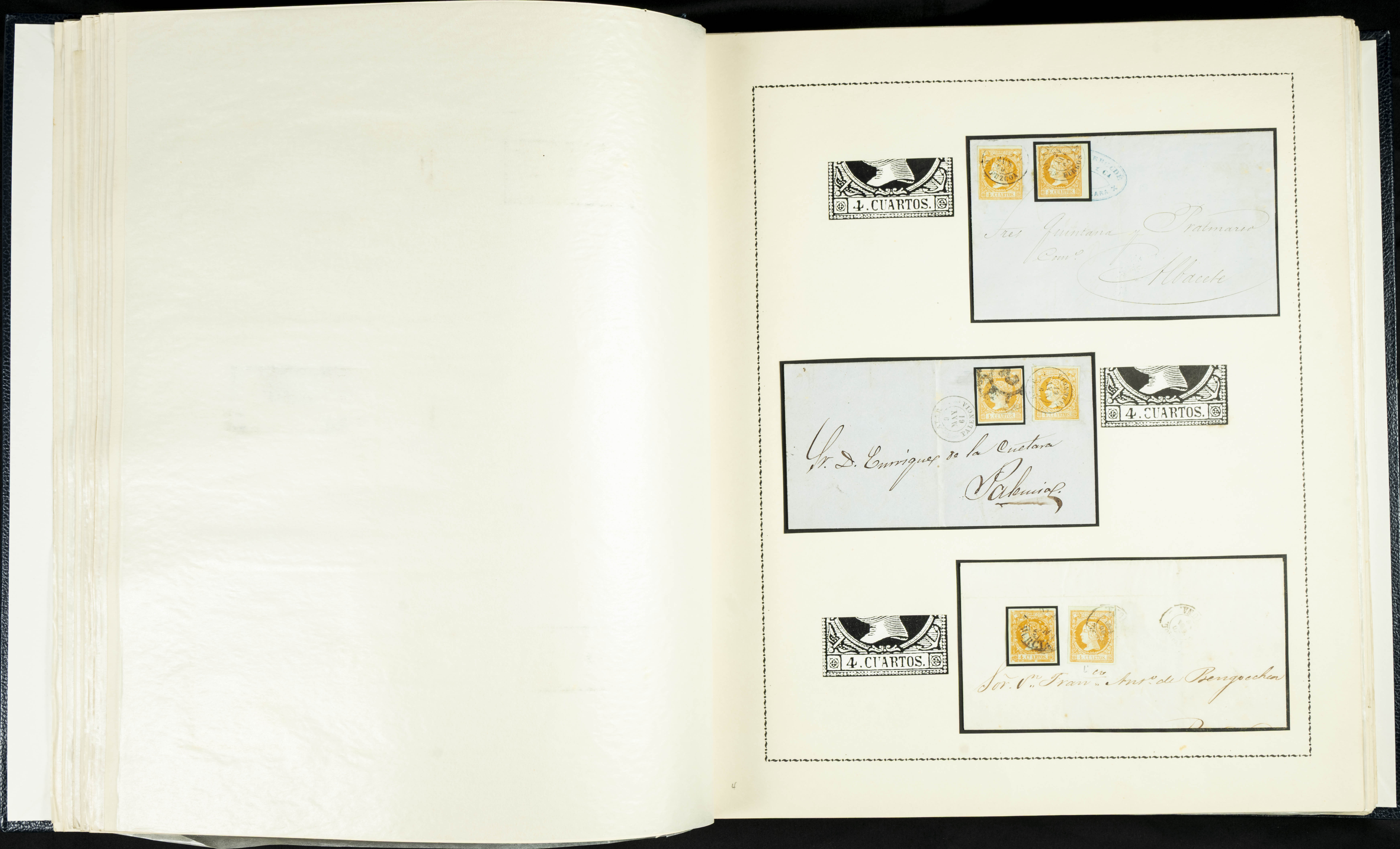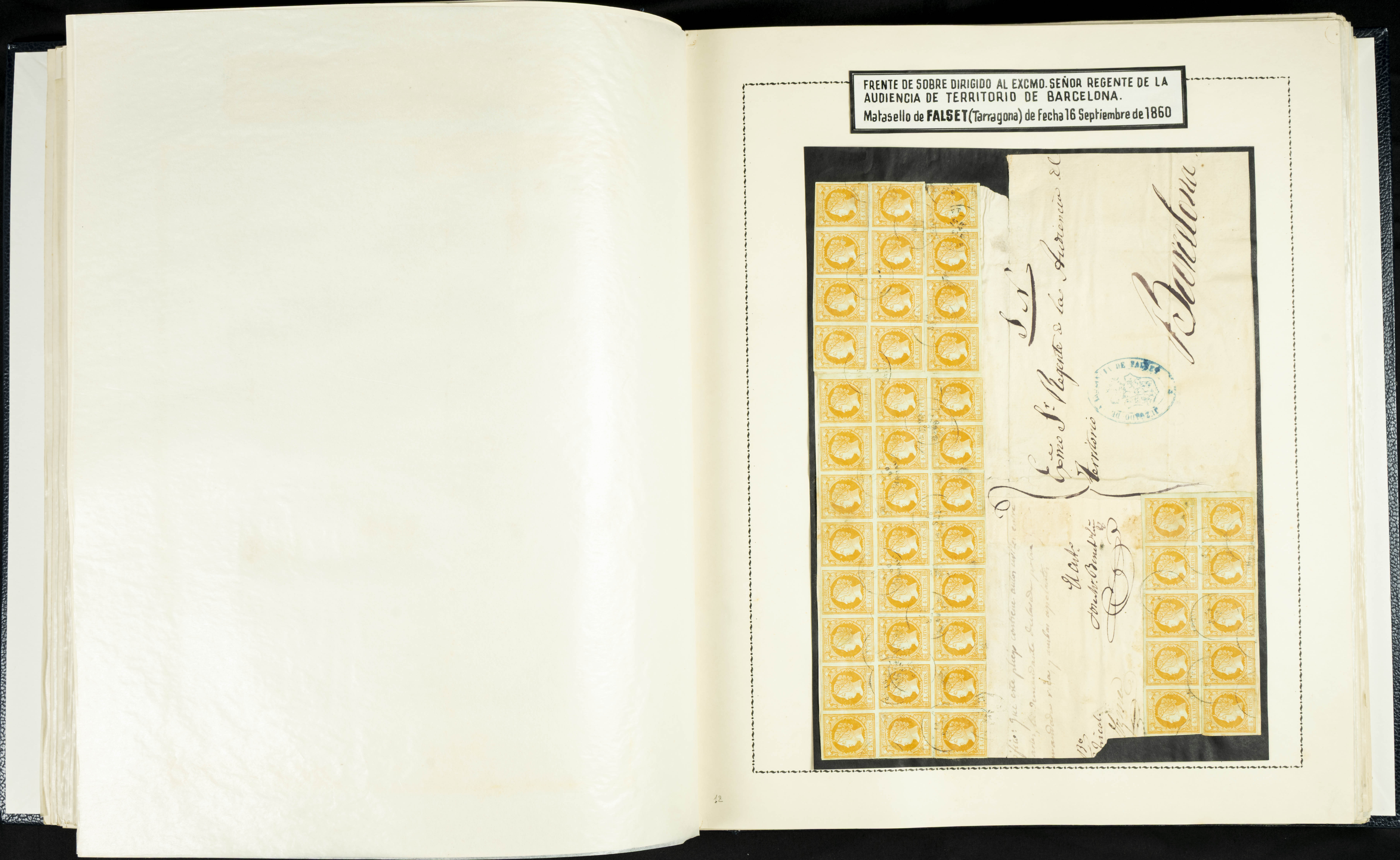 English 52. 1860. Spectacular collection of the yellow 4cuarto stamp, including countless stamps, blocks, fragments, and letters. Part of it is organized by province, especially the Type I and II date stamps. It includes a complete calendar of use, various clichés, a complete set of wagon wheel stamps, and almost a complete set of letter stamps, including the extremely rare No. 42. Individual highlights include a first-day cover stamp and letter, the perforated stamp used in Valencia on a letter (possibly the only one known), stamps and letters with pre-philatelic postmarks, and enormous blocks (spectacularly mounted in antique albums). A MUST-SEE.
