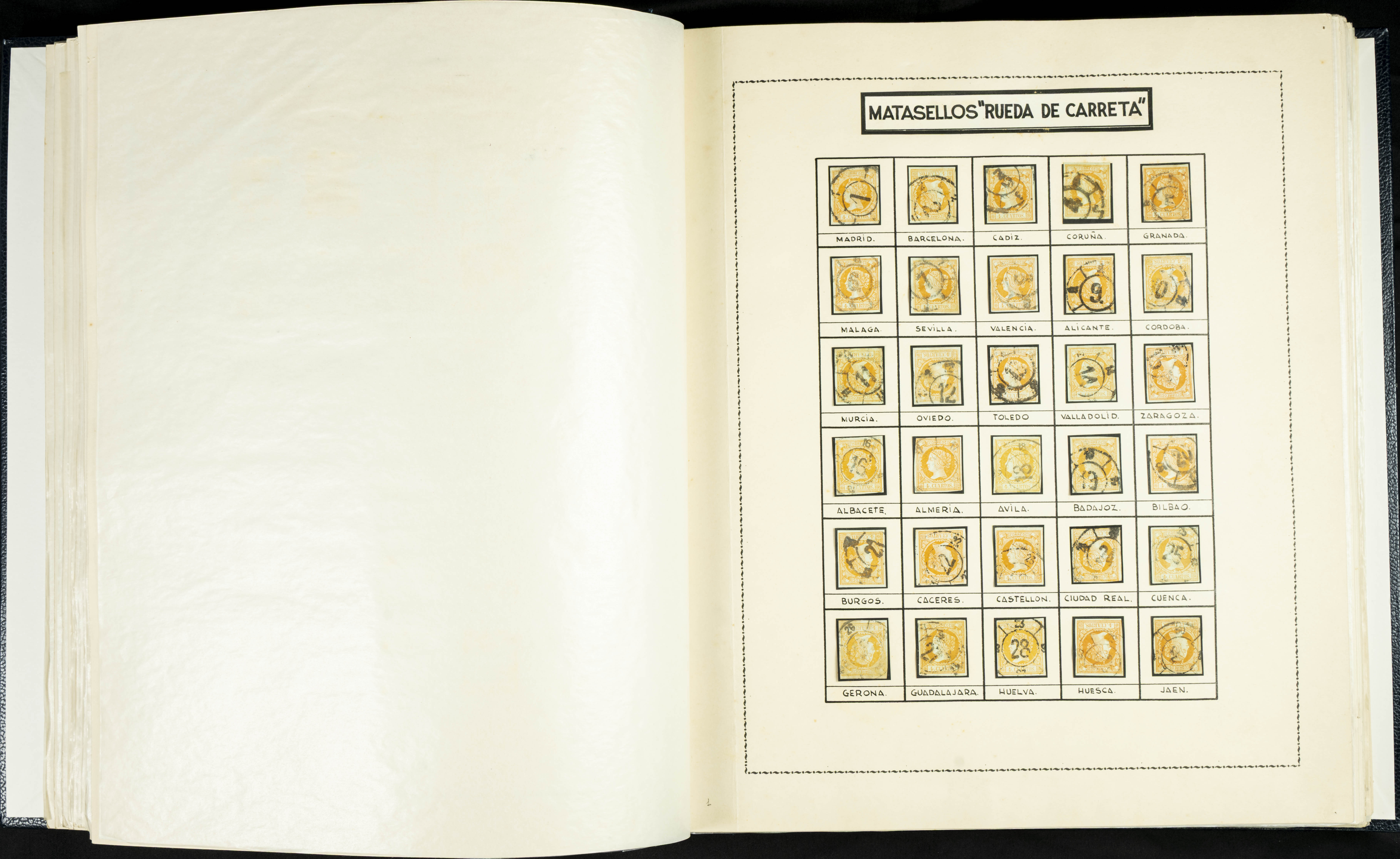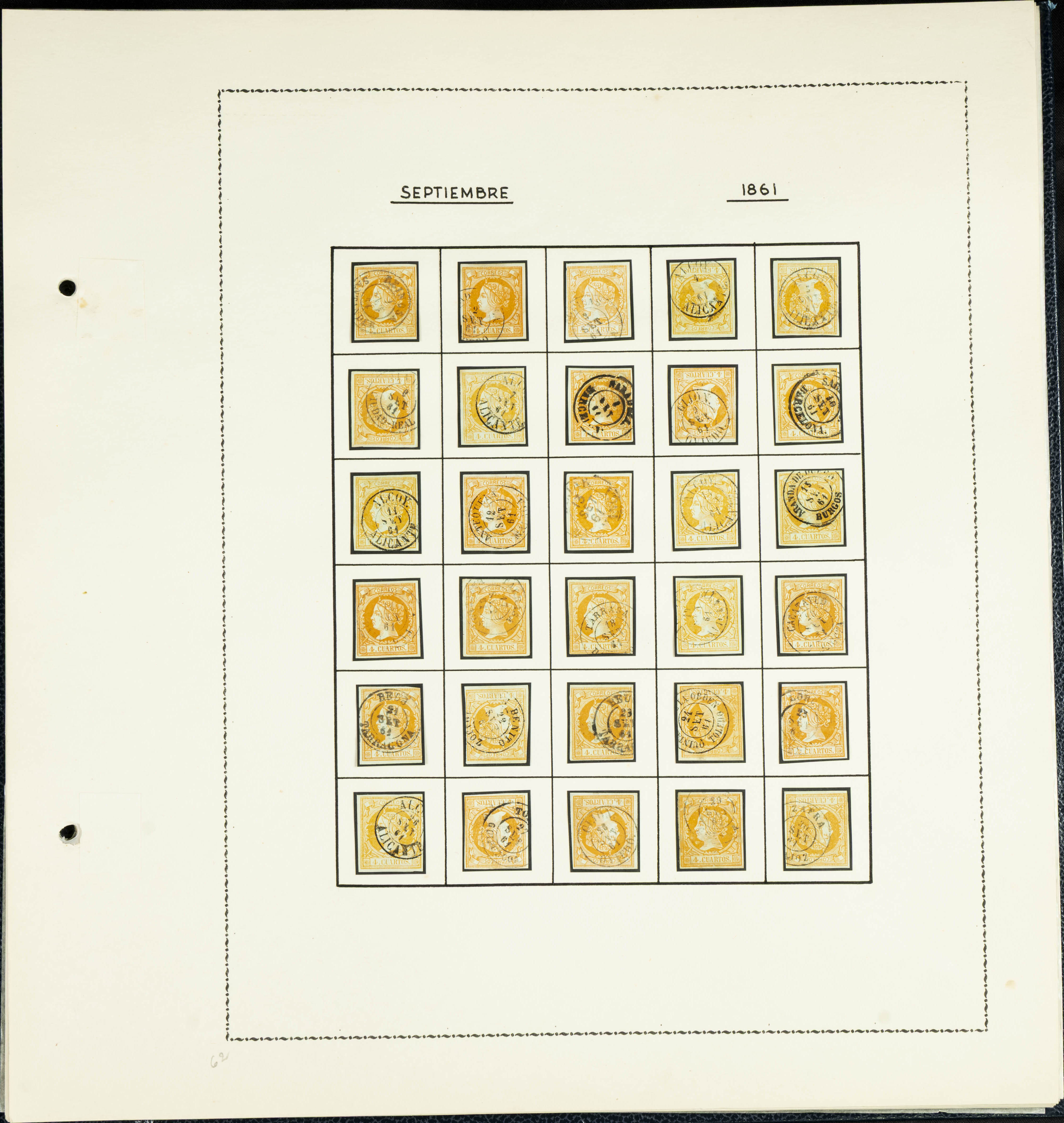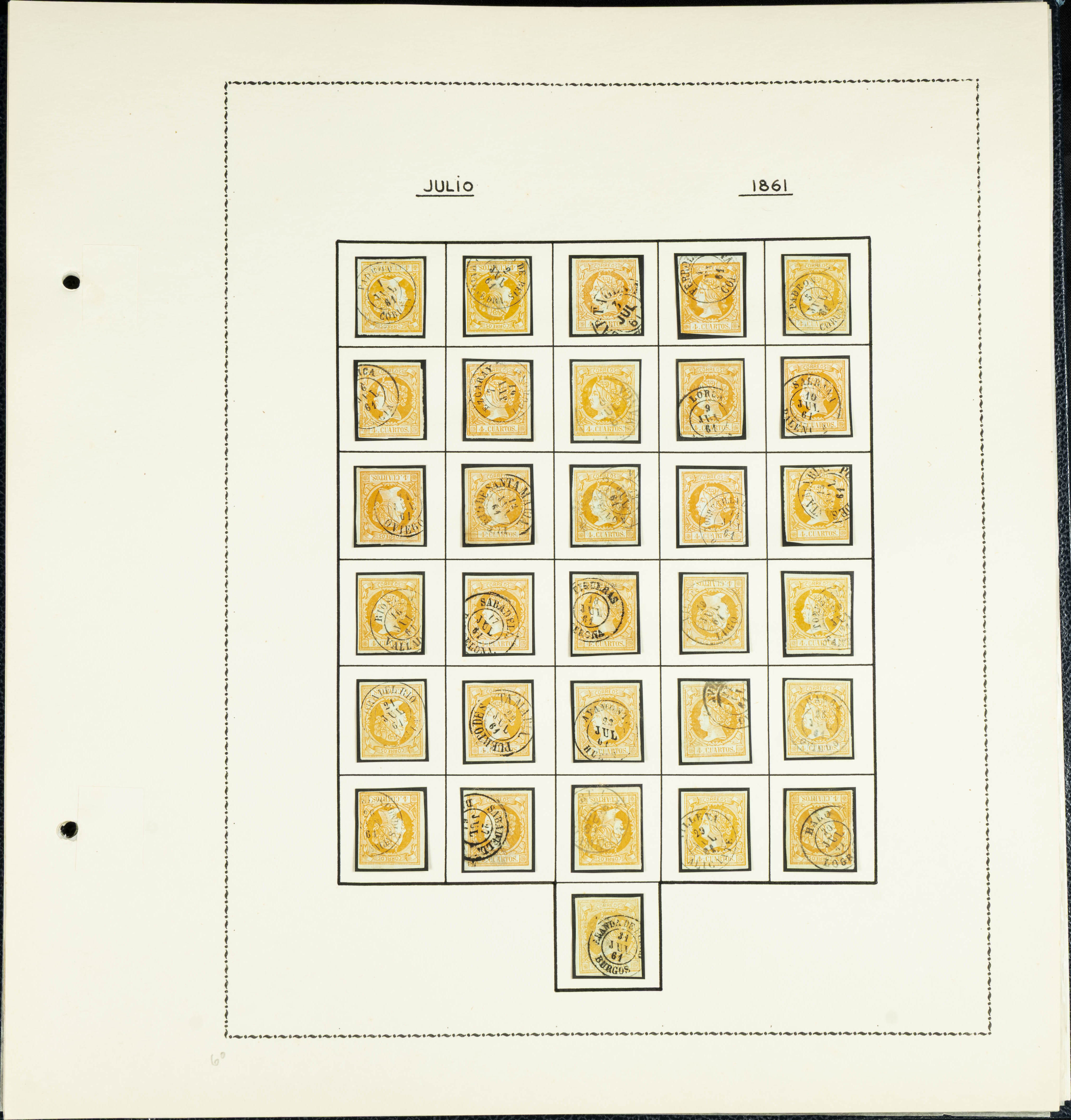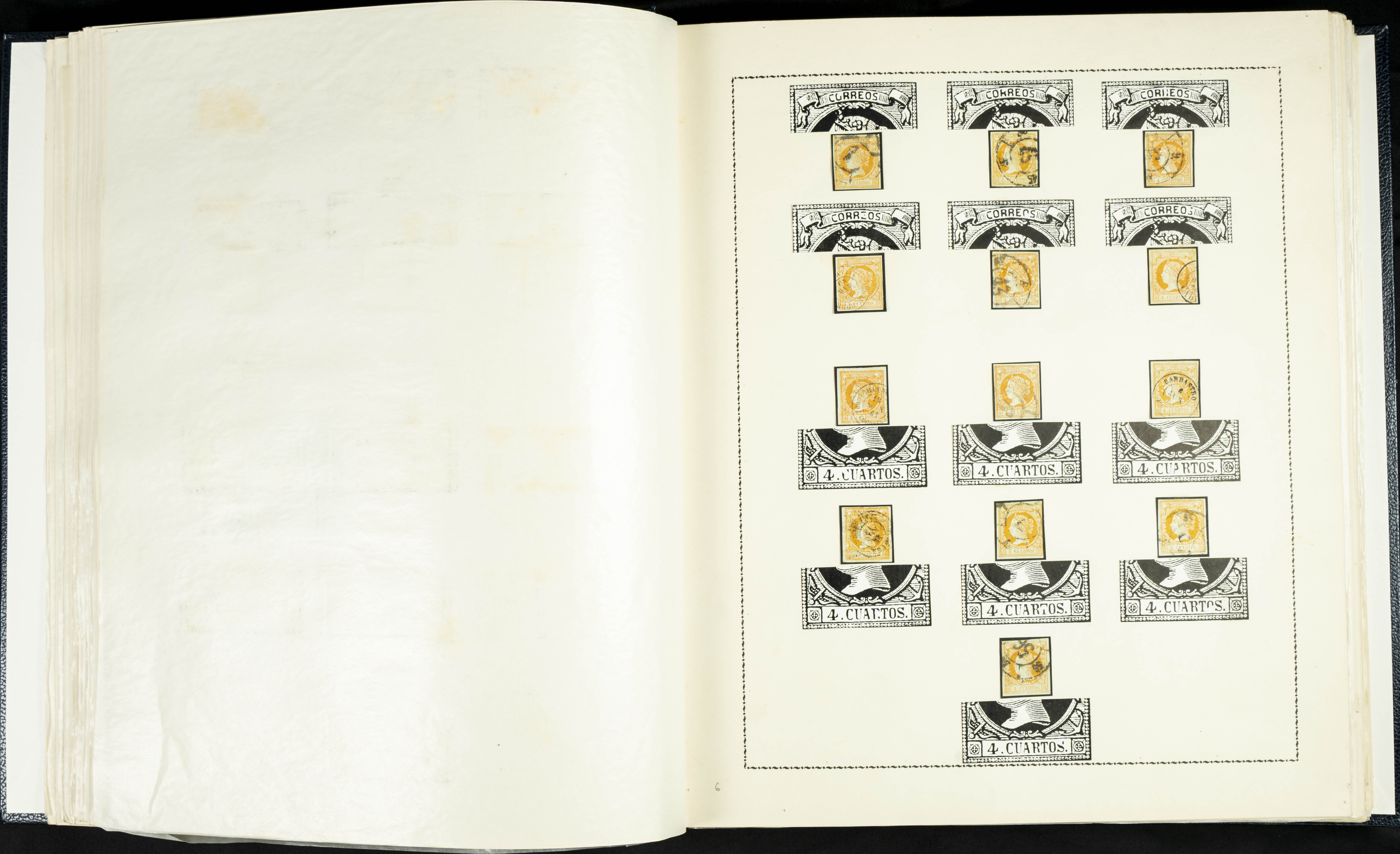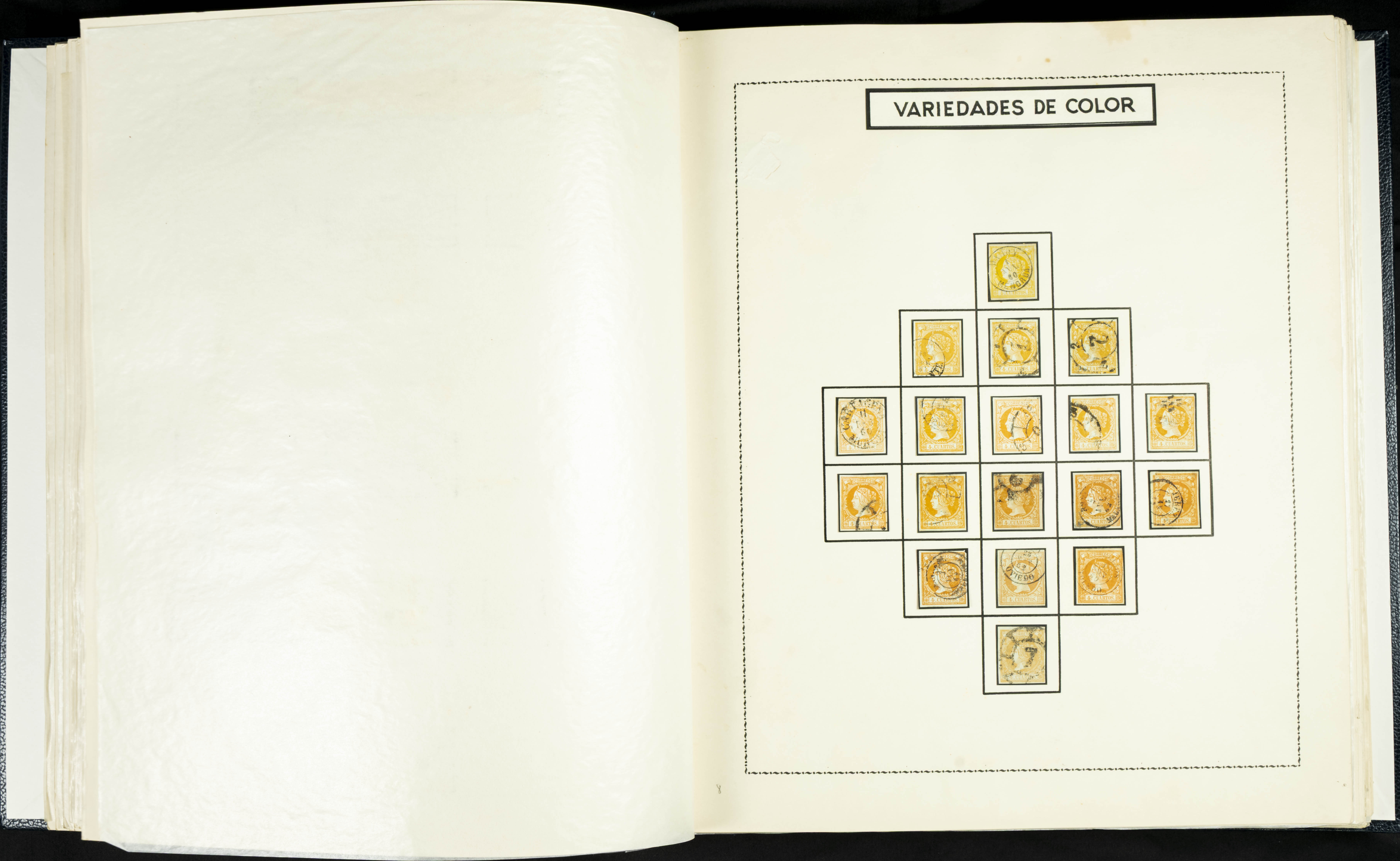 English 52. 1860. Spectacular collection of the yellow 4cuarto stamp, including countless stamps, blocks, fragments, and letters. Part of it is organized by province, especially the Type I and II date stamps. It includes a complete calendar of use, various clichés, a complete set of wagon wheel stamps, and almost a complete set of letter stamps, including the extremely rare No. 42. Individual highlights include a first-day cover stamp and letter, the perforated stamp used in Valencia on a letter (possibly the only one known), stamps and letters with pre-philatelic postmarks, and enormous blocks (spectacularly mounted in antique albums). A MUST-SEE.