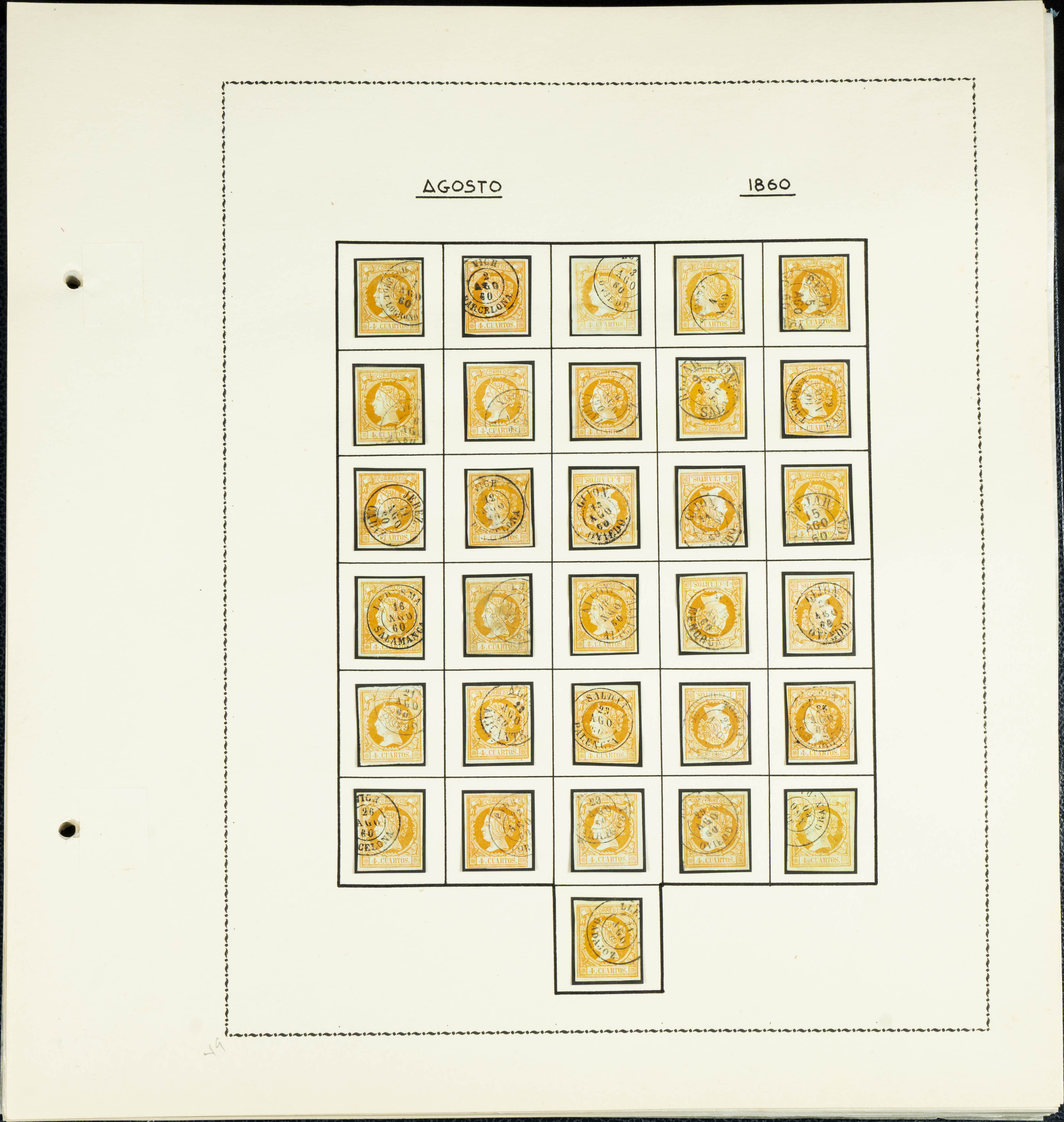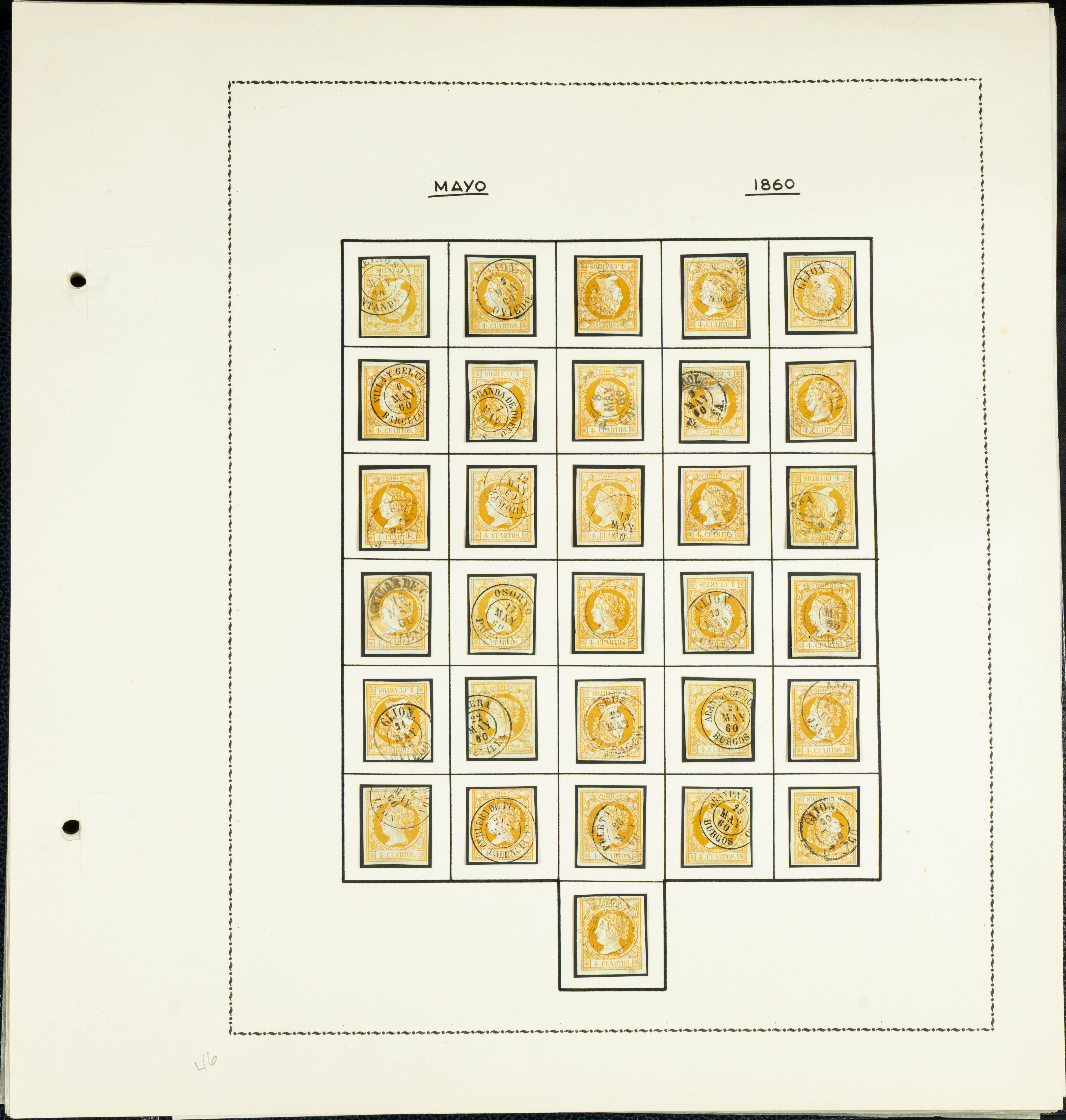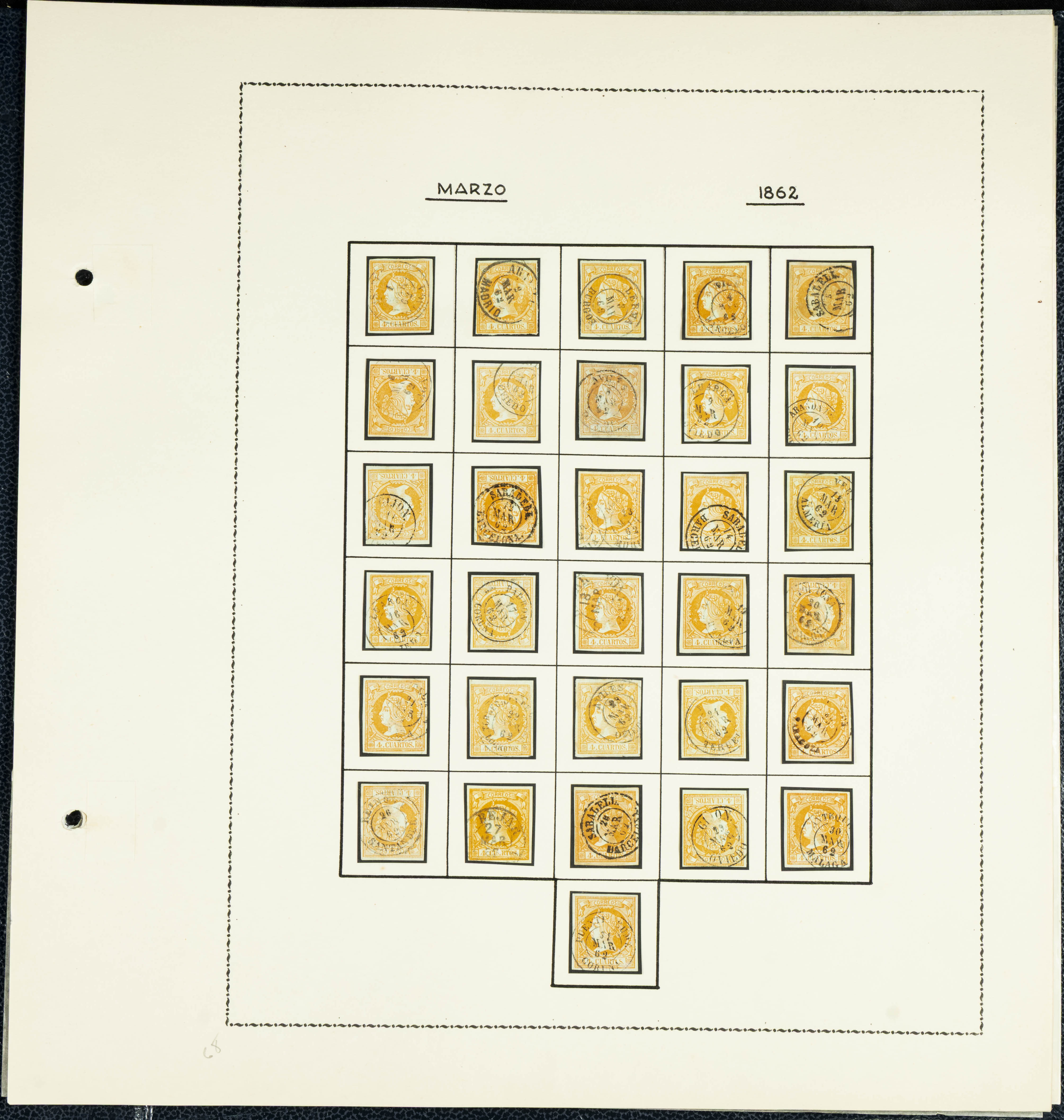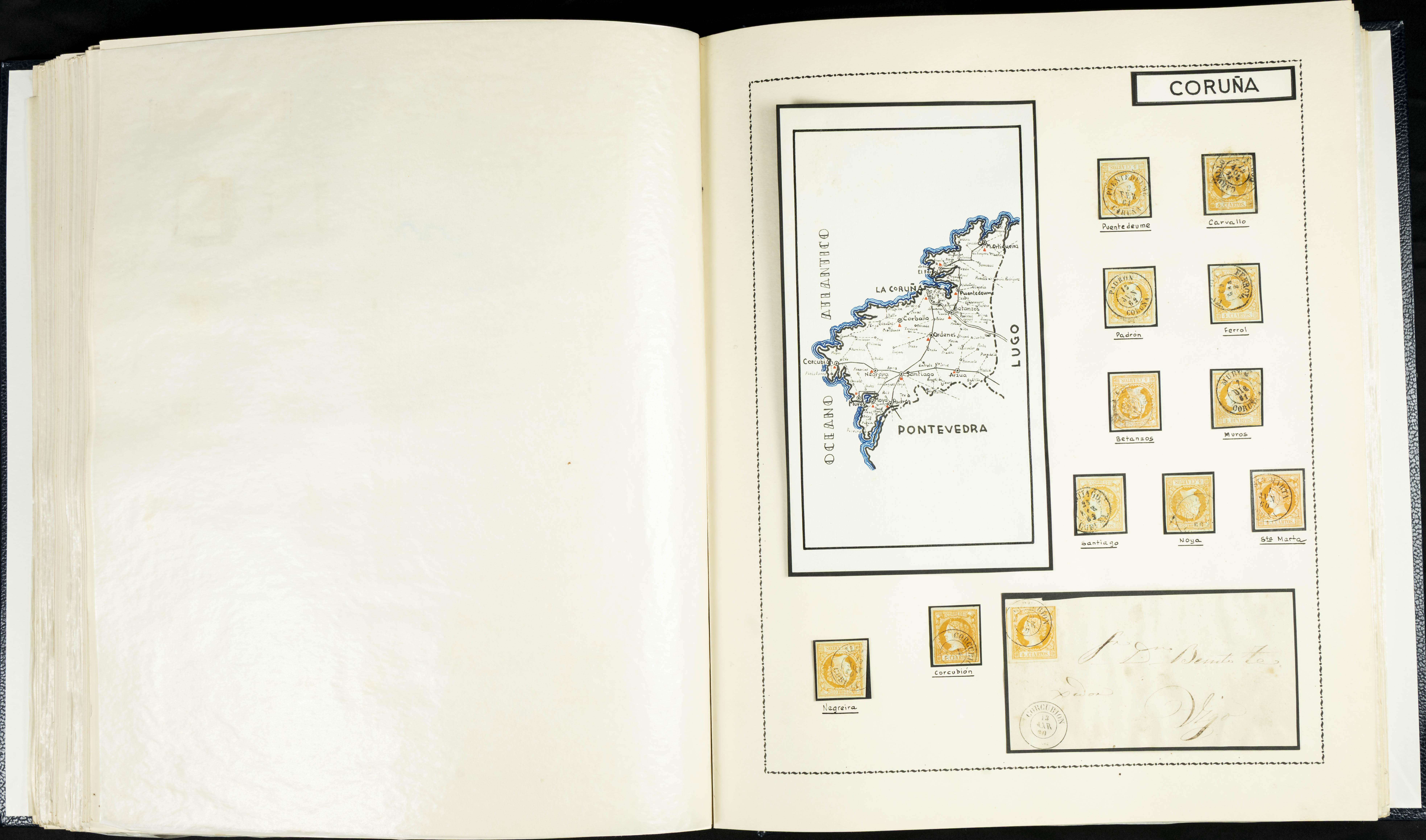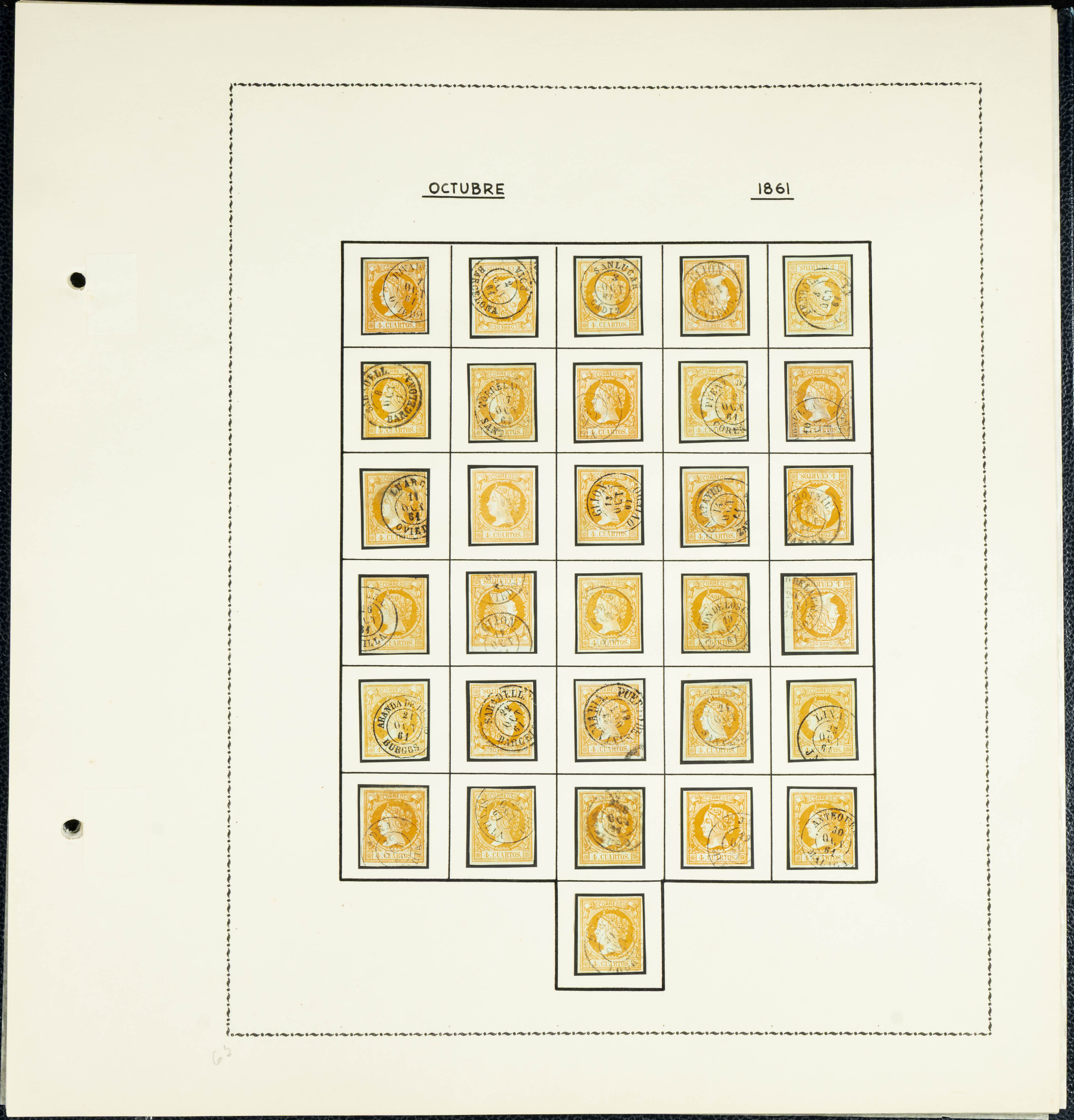 English 52. 1860. Spectacular collection of the yellow 4cuarto stamp, including countless stamps, blocks, fragments, and letters. Part of it is organized by province, especially the Type I and II date stamps. It includes a complete calendar of use, various clichés, a complete set of wagon wheel stamps, and almost a complete set of letter stamps, including the extremely rare No. 42. Individual highlights include a first-day cover stamp and letter, the perforated stamp used in Valencia on a letter (possibly the only one known), stamps and letters with pre-philatelic postmarks, and enormous blocks (spectacularly mounted in antique albums). A MUST-SEE.