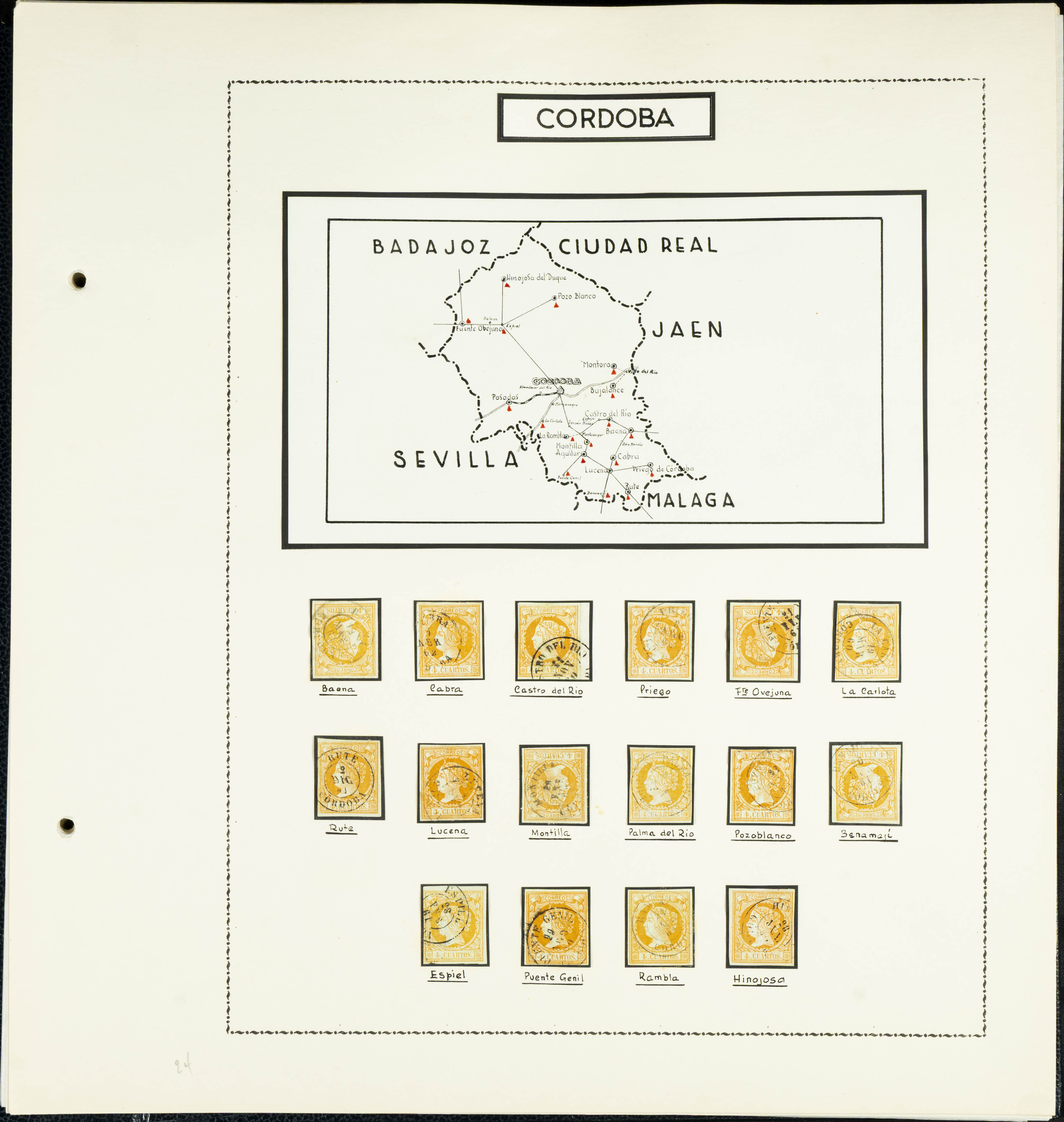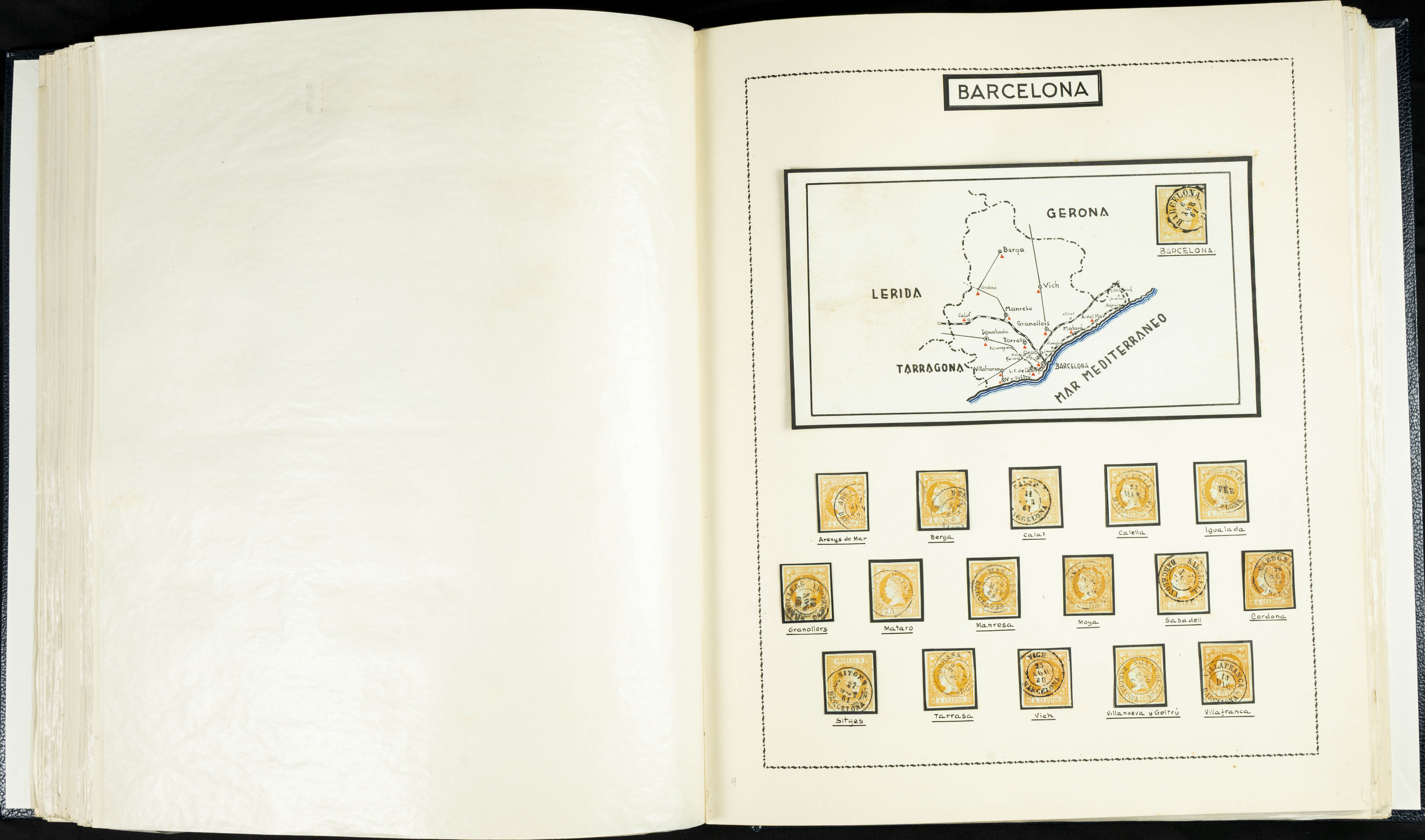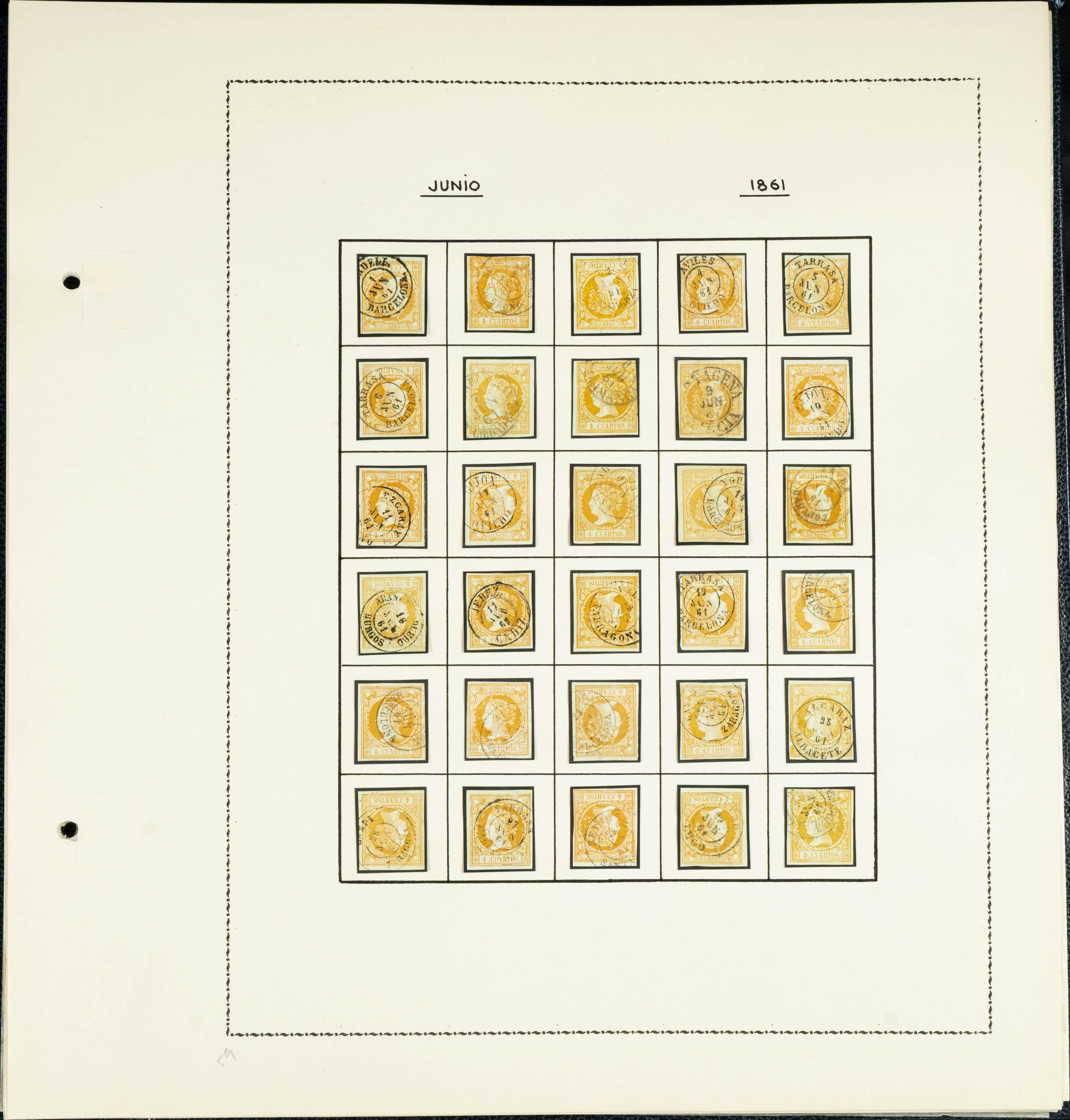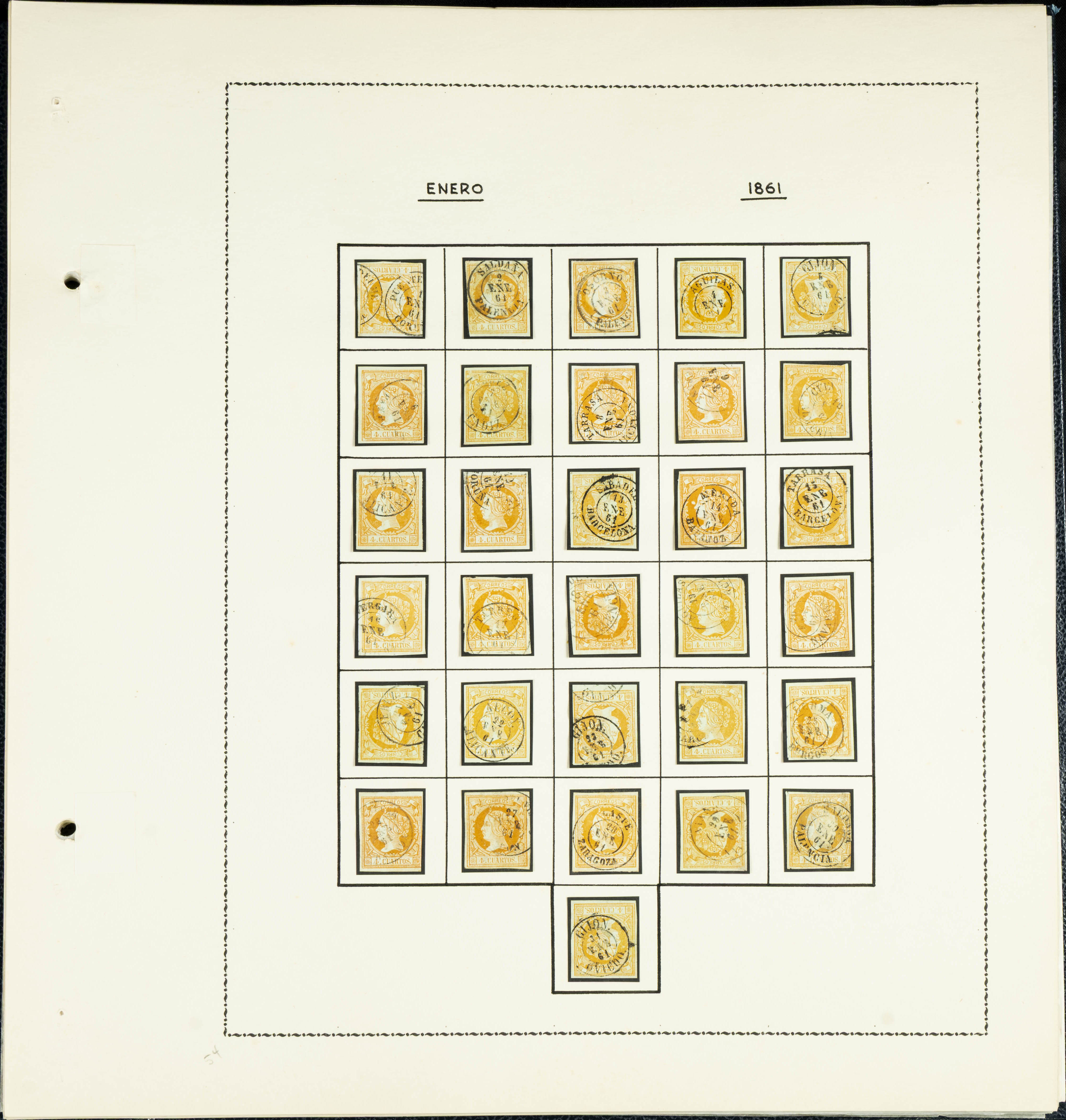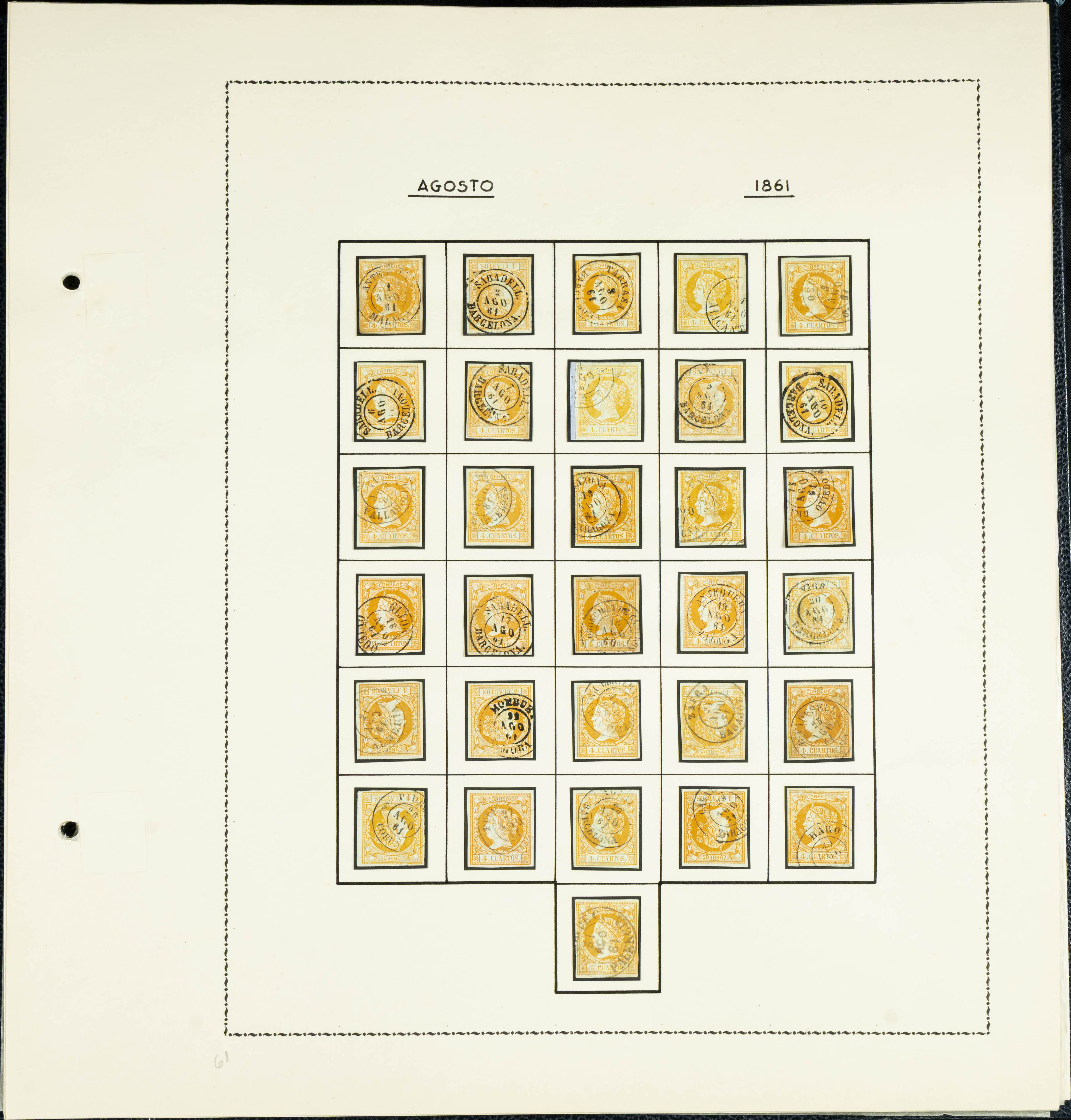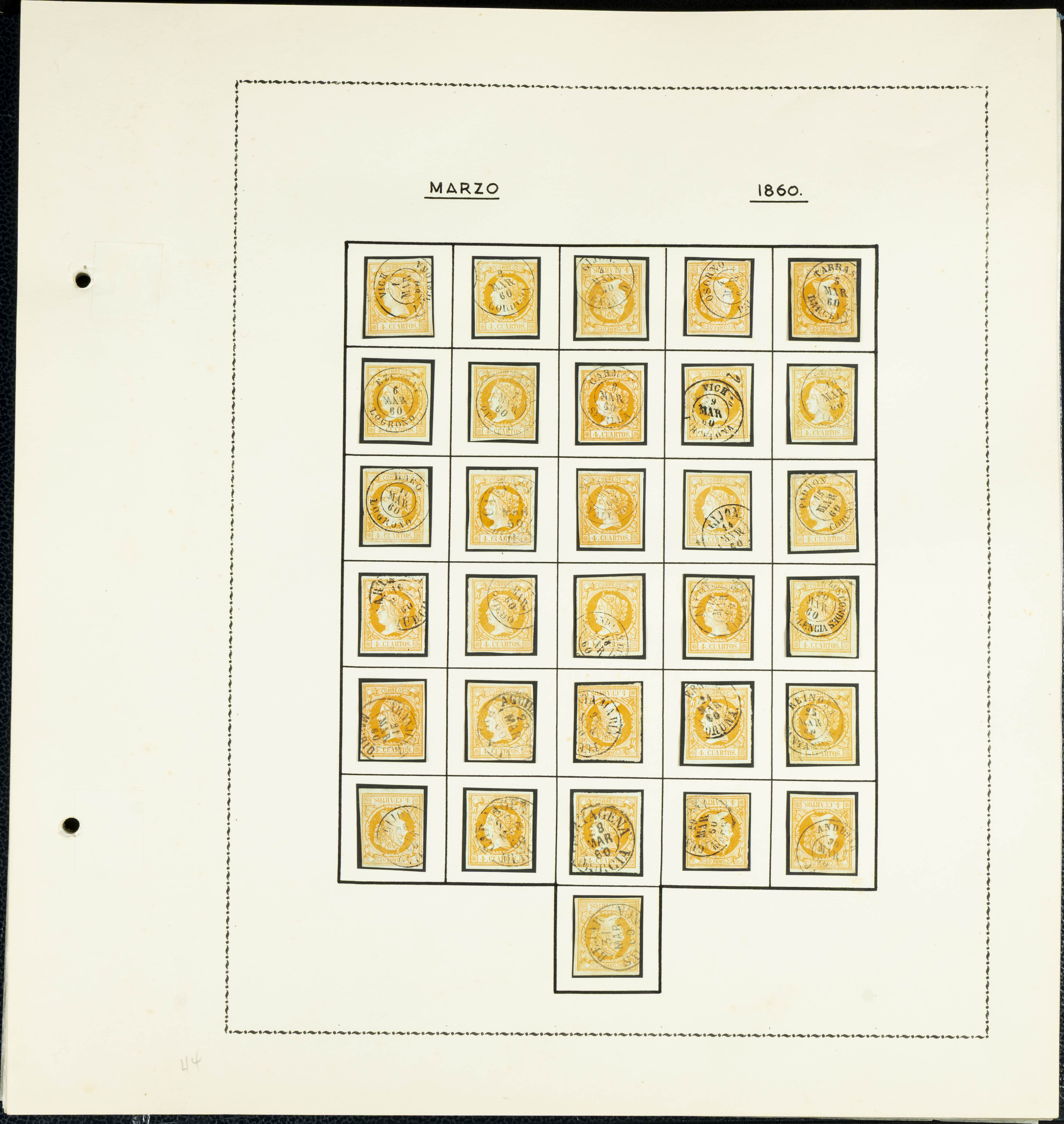 English 52. 1860. Spectacular collection of the yellow 4cuarto stamp, including countless stamps, blocks, fragments, and letters. Part of it is organized by province, especially the Type I and II date stamps. It includes a complete calendar of use, various clichés, a complete set of wagon wheel stamps, and almost a complete set of letter stamps, including the extremely rare No. 42. Individual highlights include a first-day cover stamp and letter, the perforated stamp used in Valencia on a letter (possibly the only one known), stamps and letters with pre-philatelic postmarks, and enormous blocks (spectacularly mounted in antique albums). A MUST-SEE.