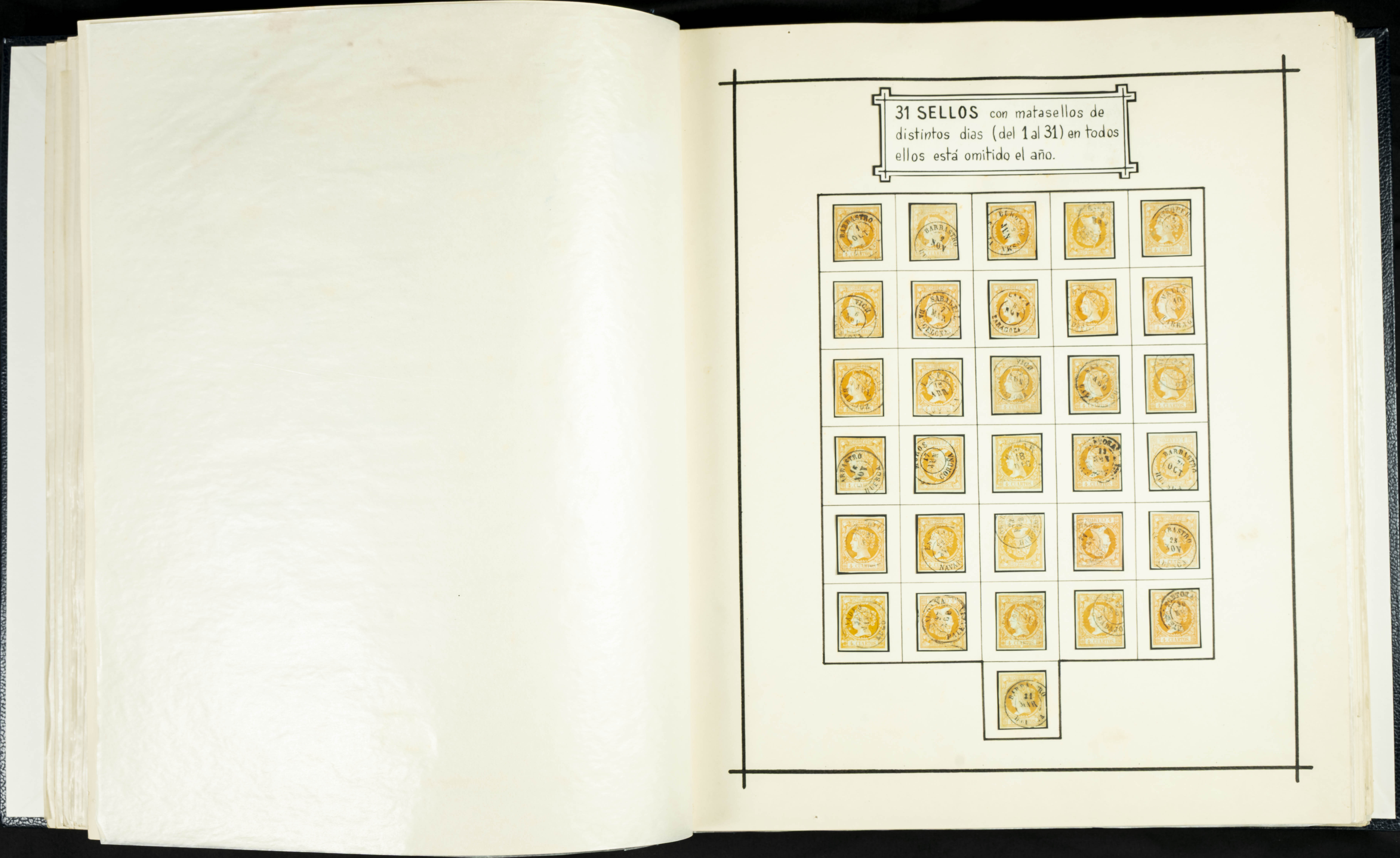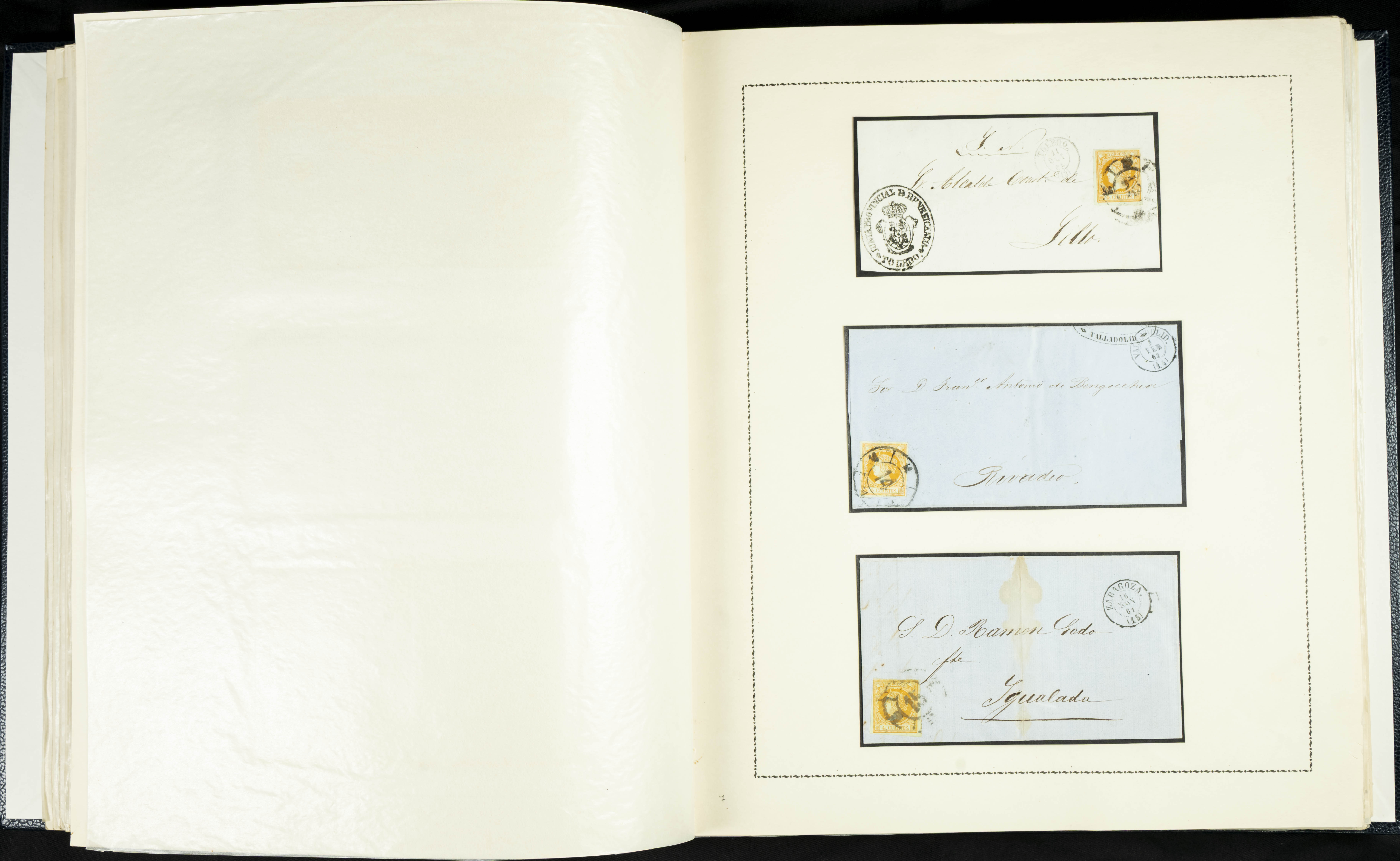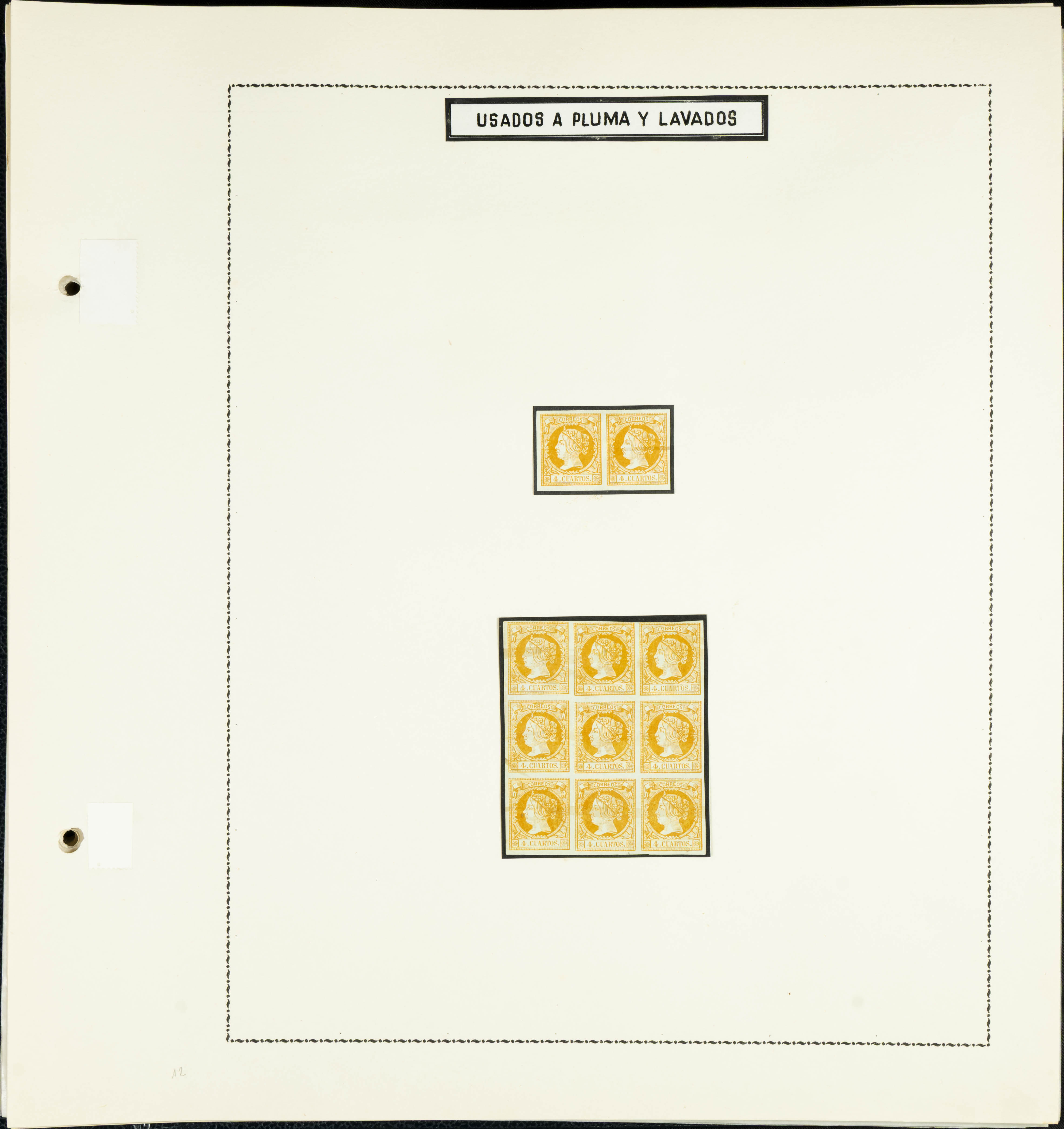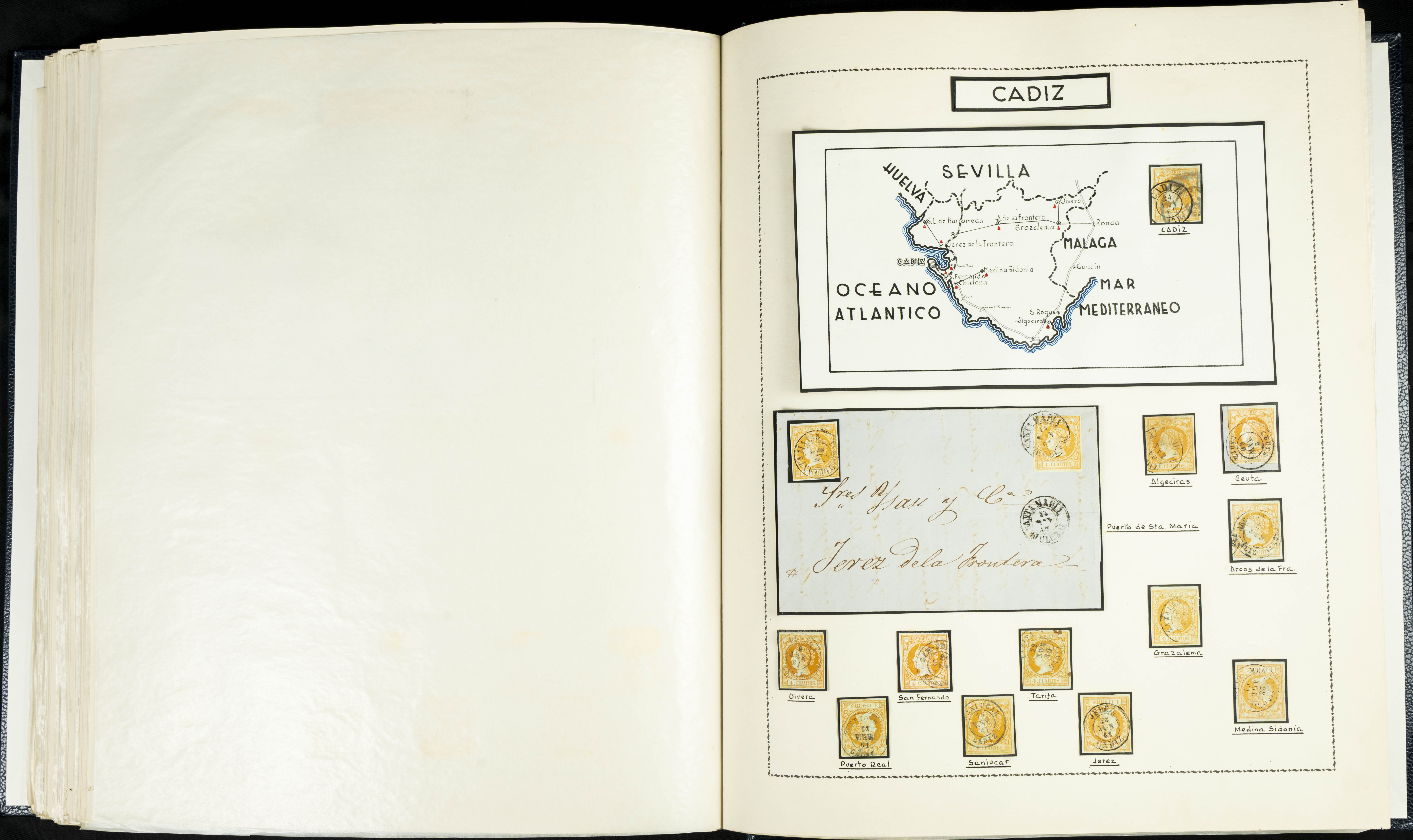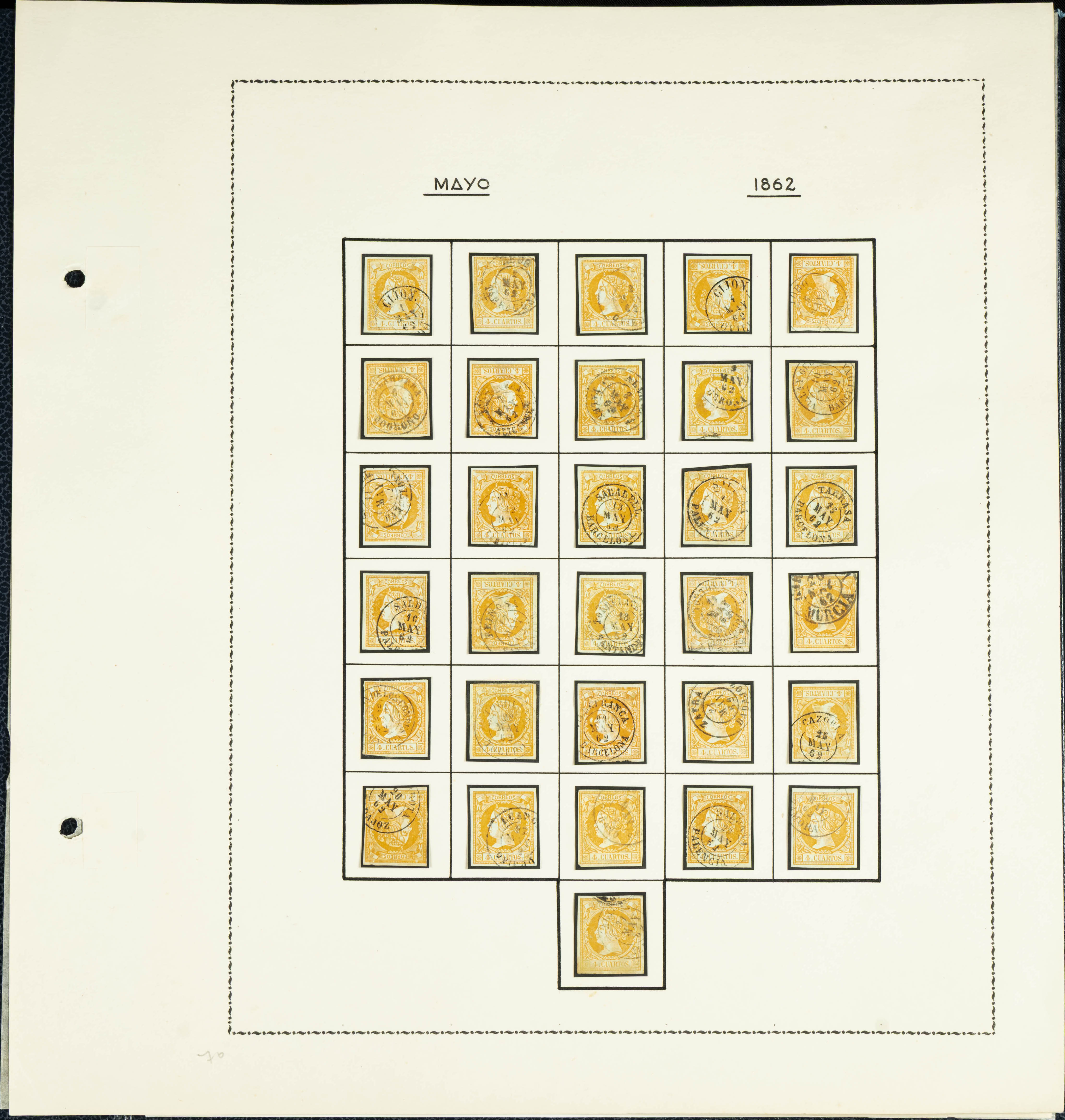 English 52. 1860. Spectacular collection of the yellow 4cuarto stamp, including countless stamps, blocks, fragments, and letters. Part of it is organized by province, especially the Type I and II date stamps. It includes a complete calendar of use, various clichés, a complete set of wagon wheel stamps, and almost a complete set of letter stamps, including the extremely rare No. 42. Individual highlights include a first-day cover stamp and letter, the perforated stamp used in Valencia on a letter (possibly the only one known), stamps and letters with pre-philatelic postmarks, and enormous blocks (spectacularly mounted in antique albums). A MUST-SEE.