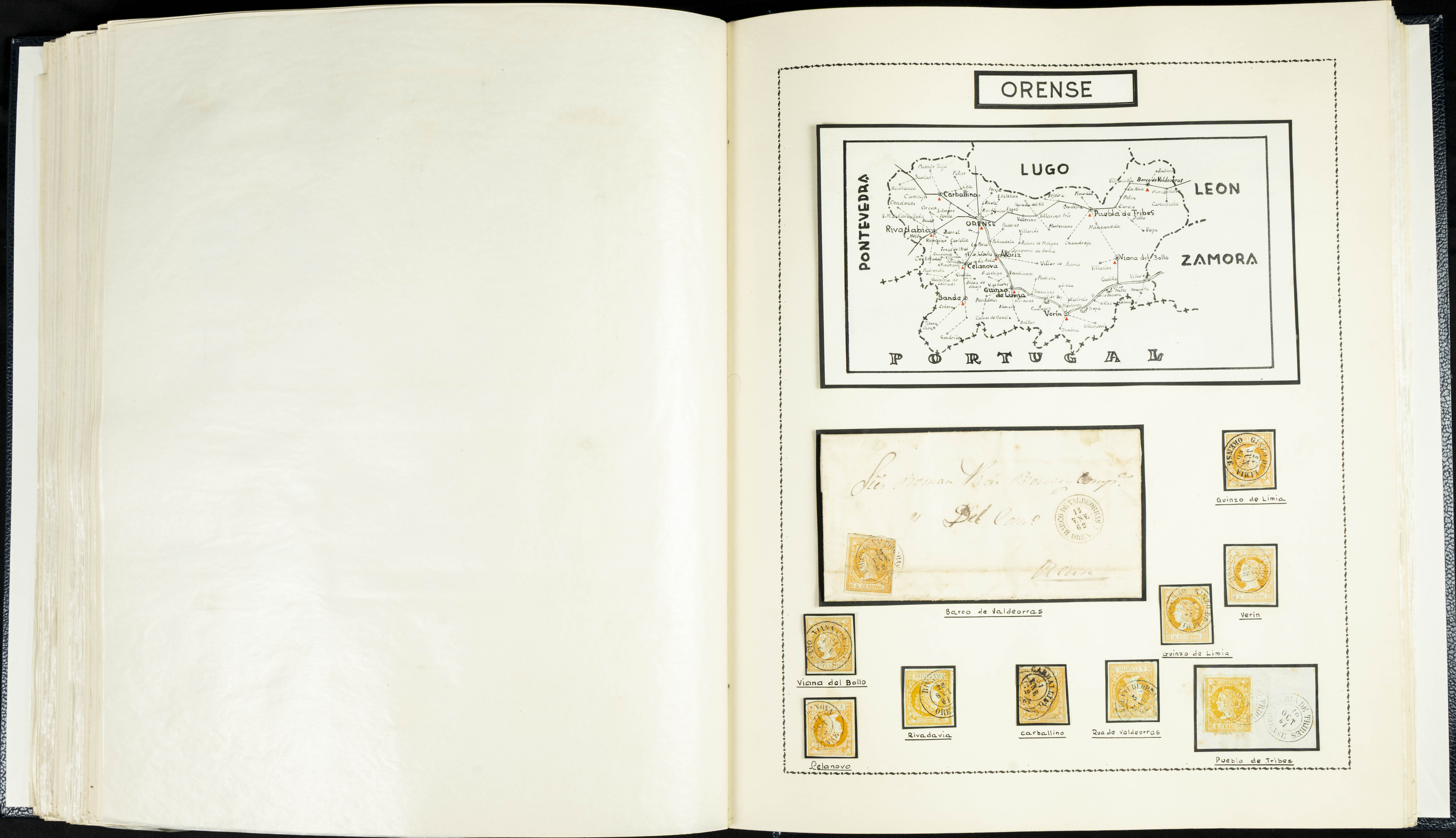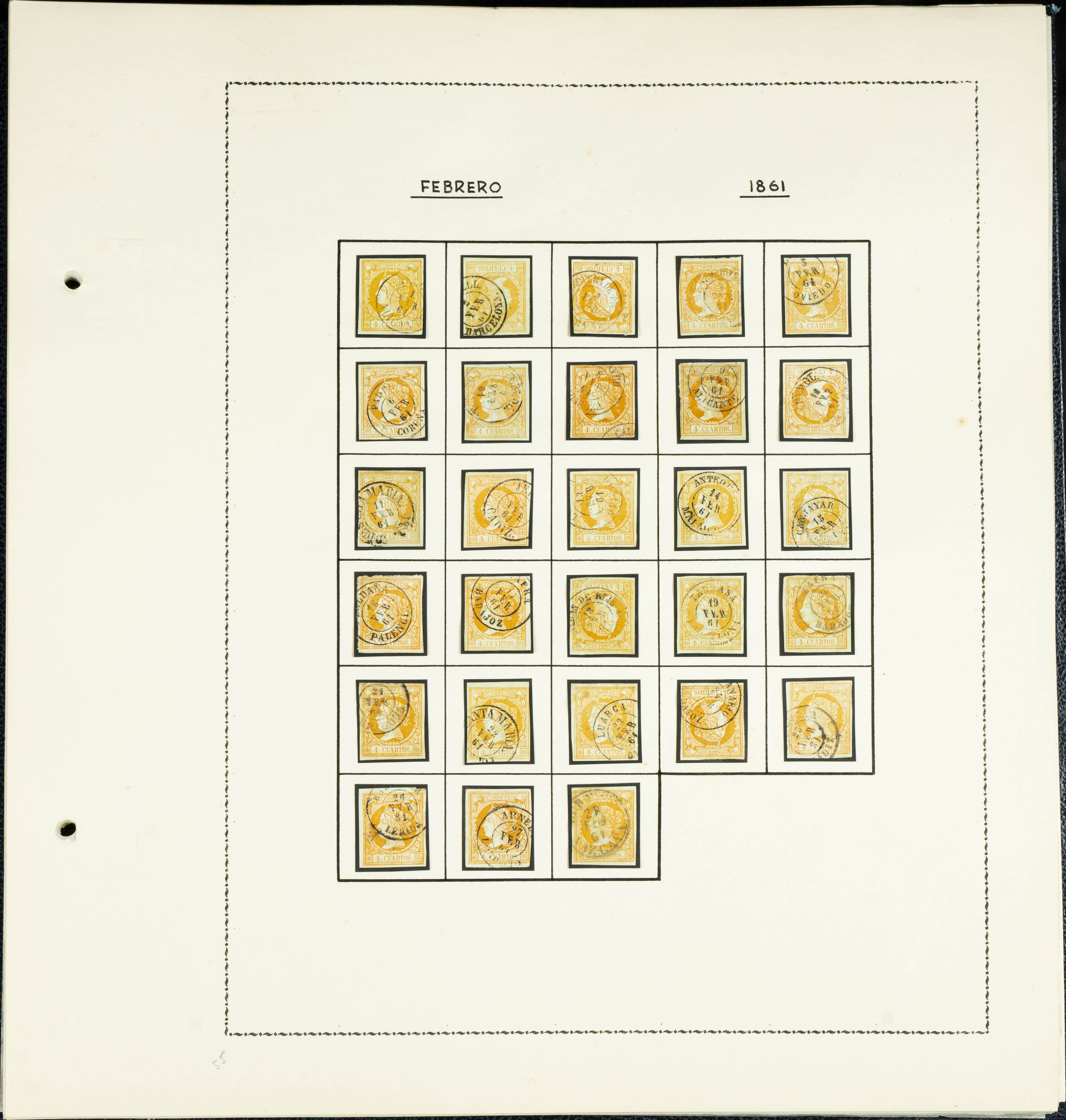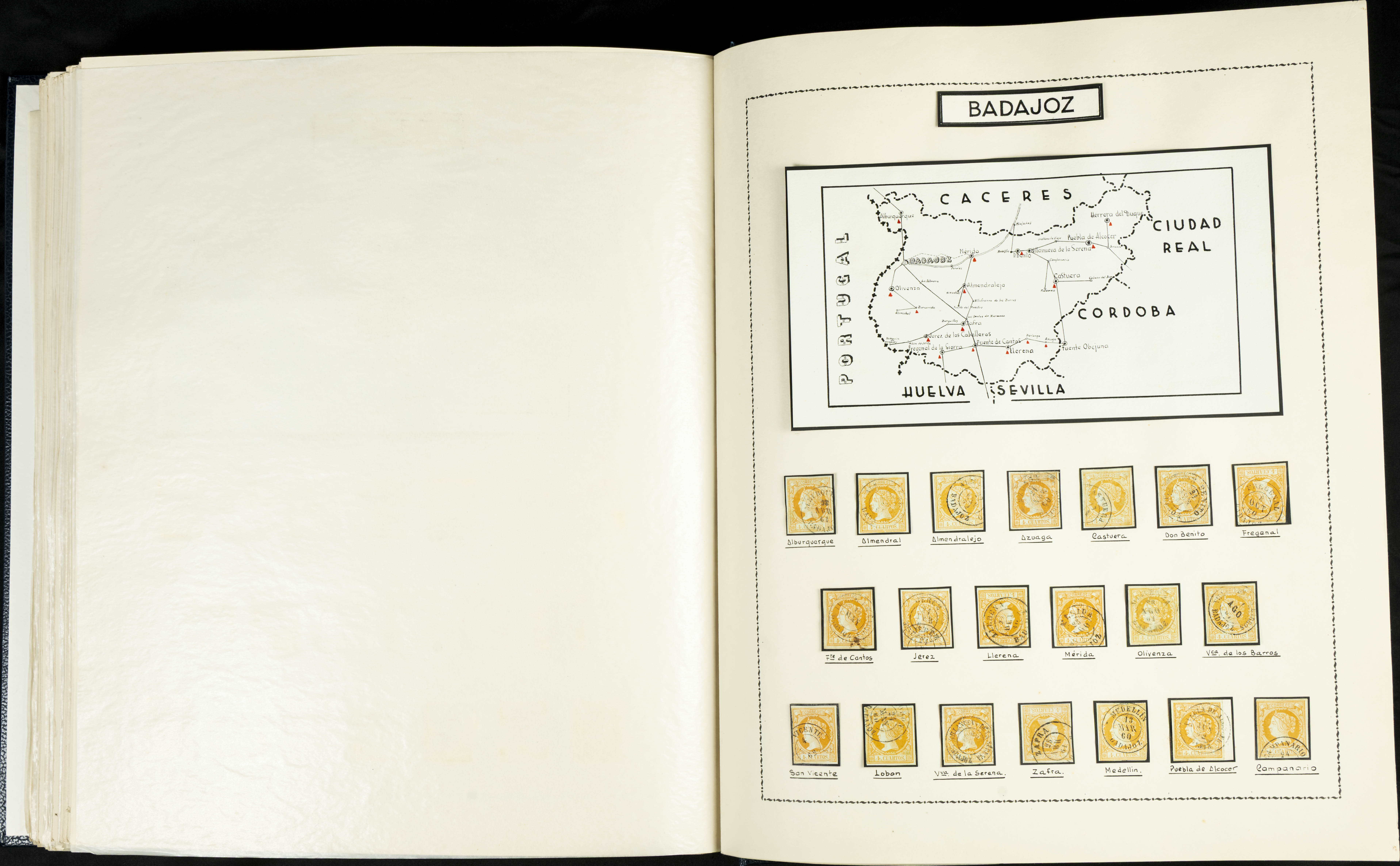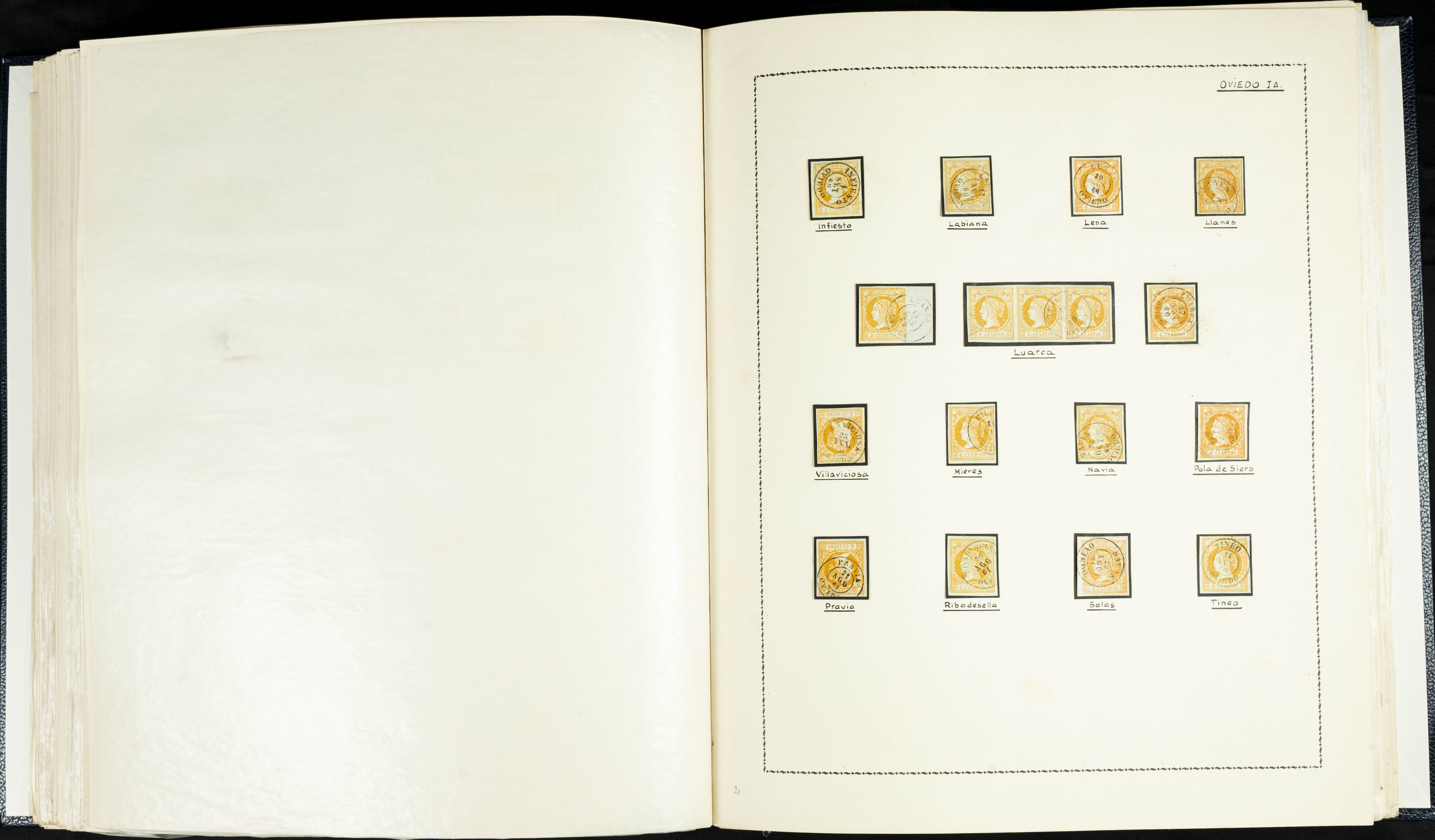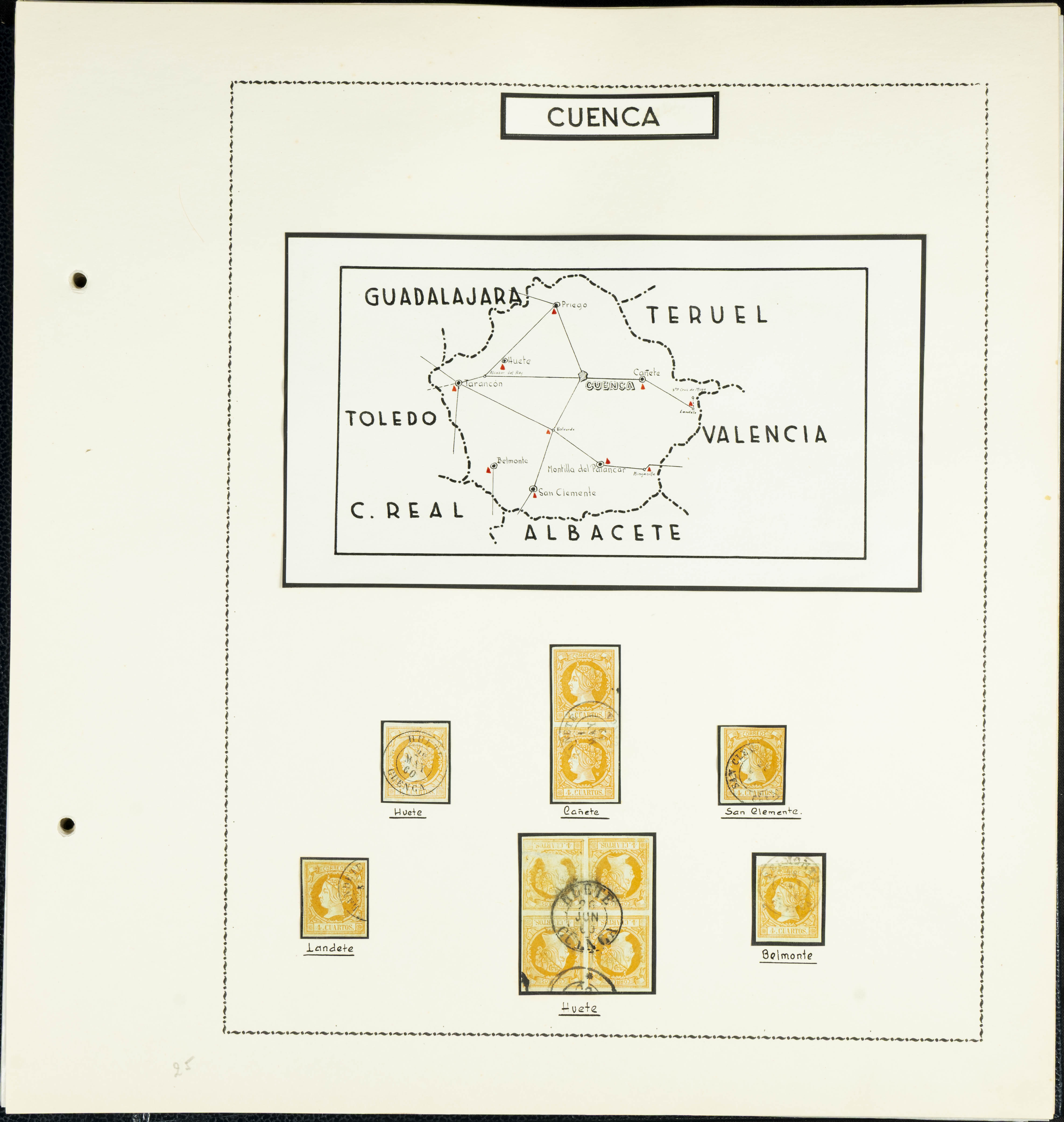 English 52. 1860. Spectacular collection of the yellow 4cuarto stamp, including countless stamps, blocks, fragments, and letters. Part of it is organized by province, especially the Type I and II date stamps. It includes a complete calendar of use, various clichés, a complete set of wagon wheel stamps, and almost a complete set of letter stamps, including the extremely rare No. 42. Individual highlights include a first-day cover stamp and letter, the perforated stamp used in Valencia on a letter (possibly the only one known), stamps and letters with pre-philatelic postmarks, and enormous blocks (spectacularly mounted in antique albums). A MUST-SEE.