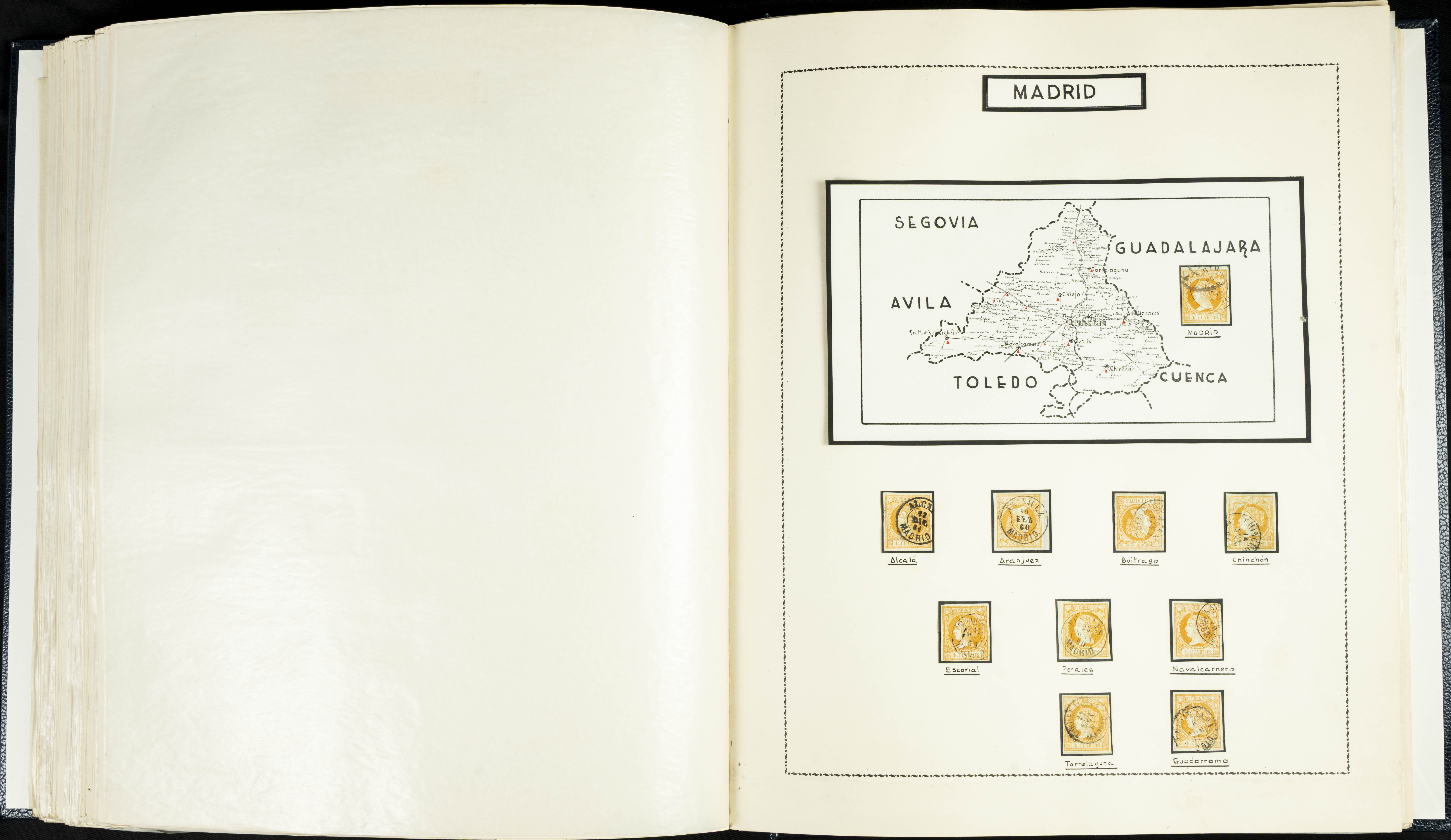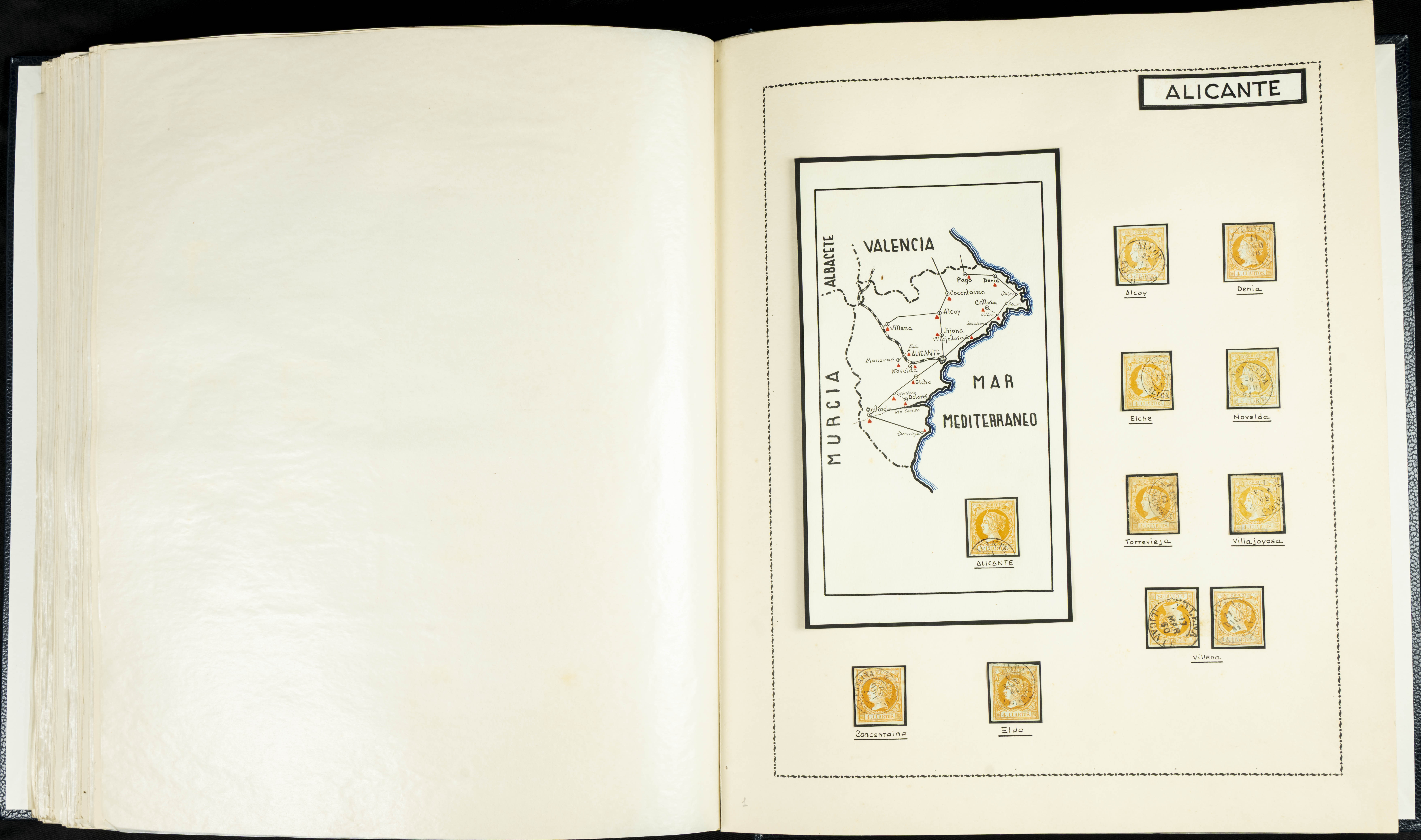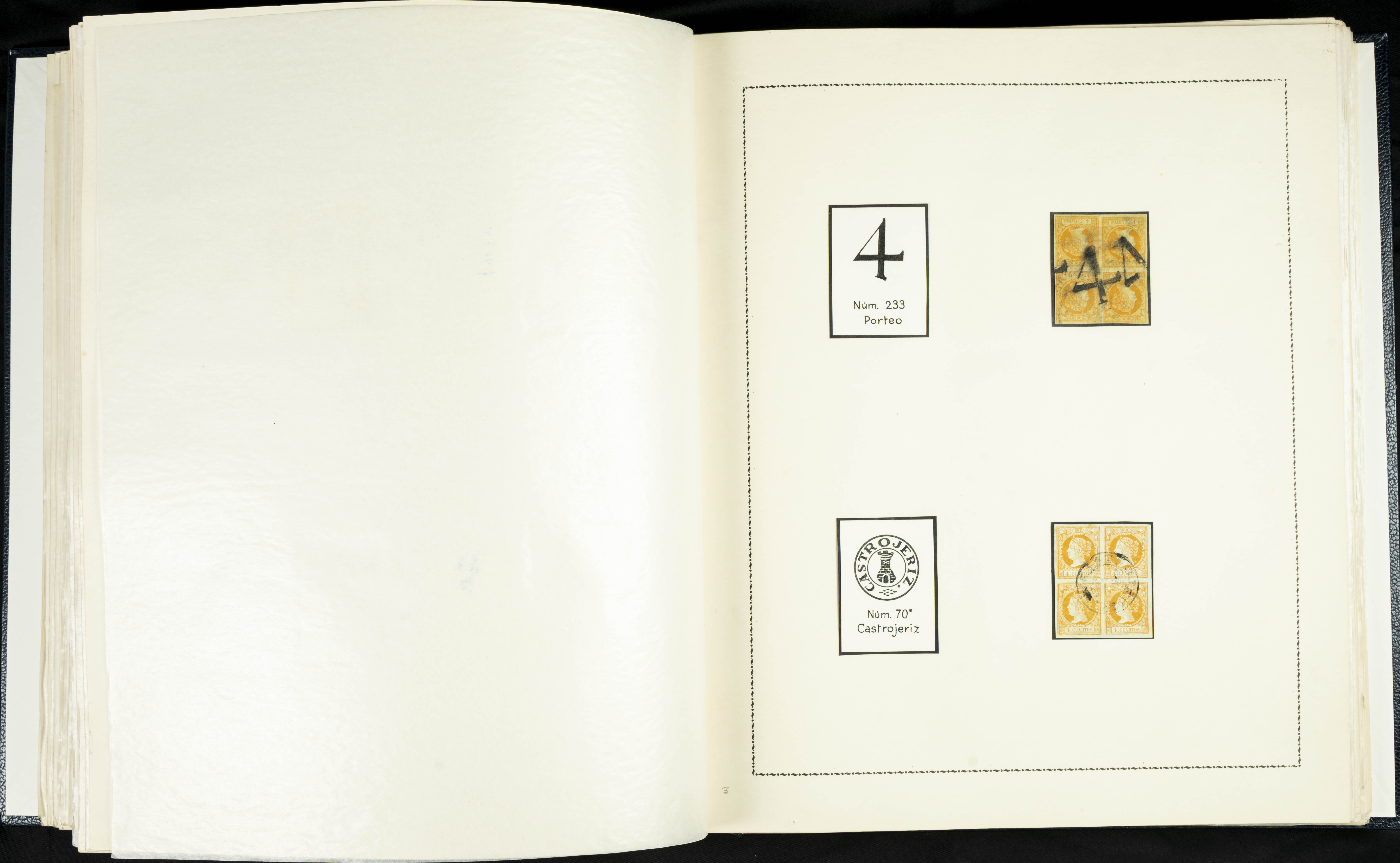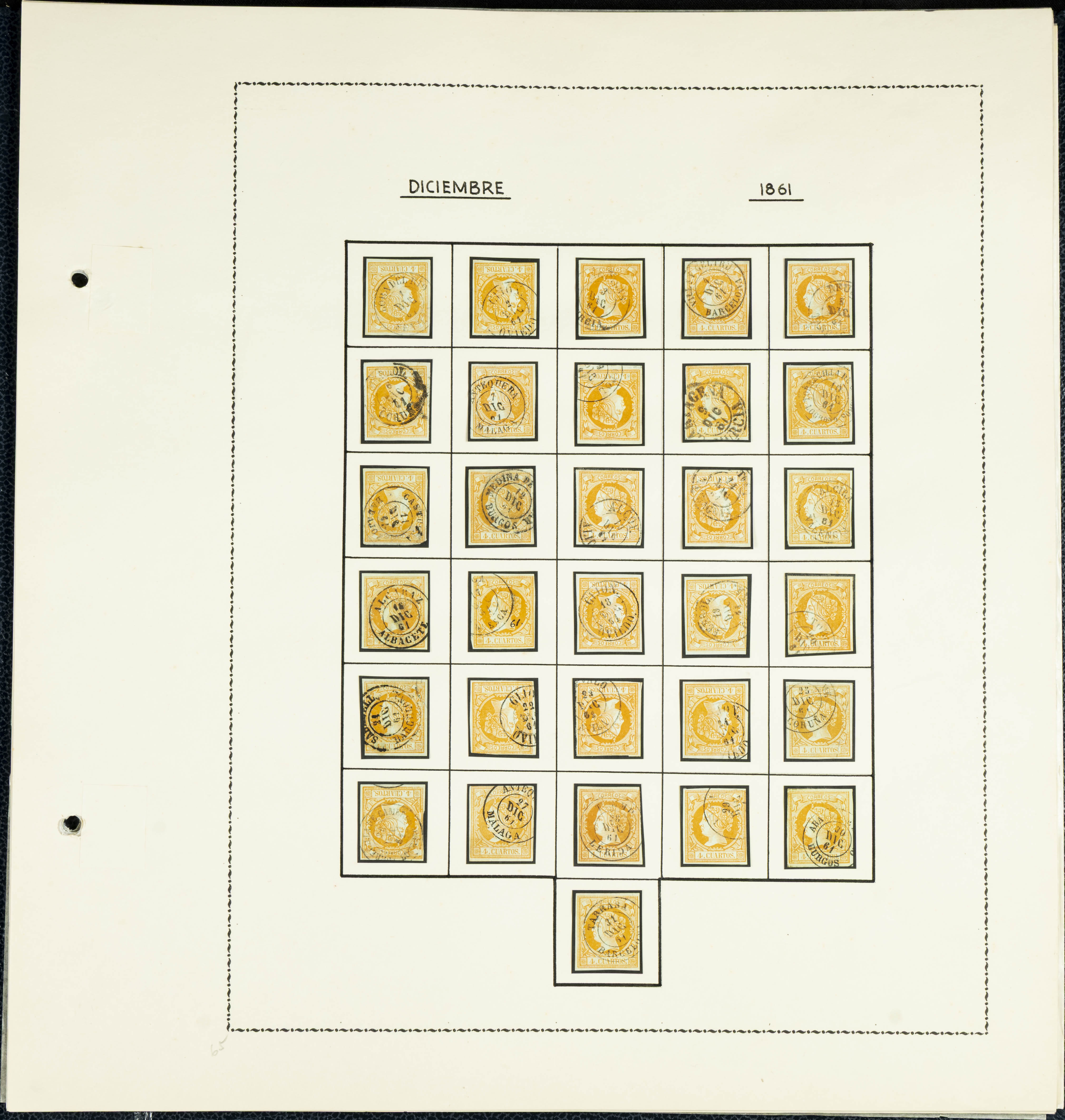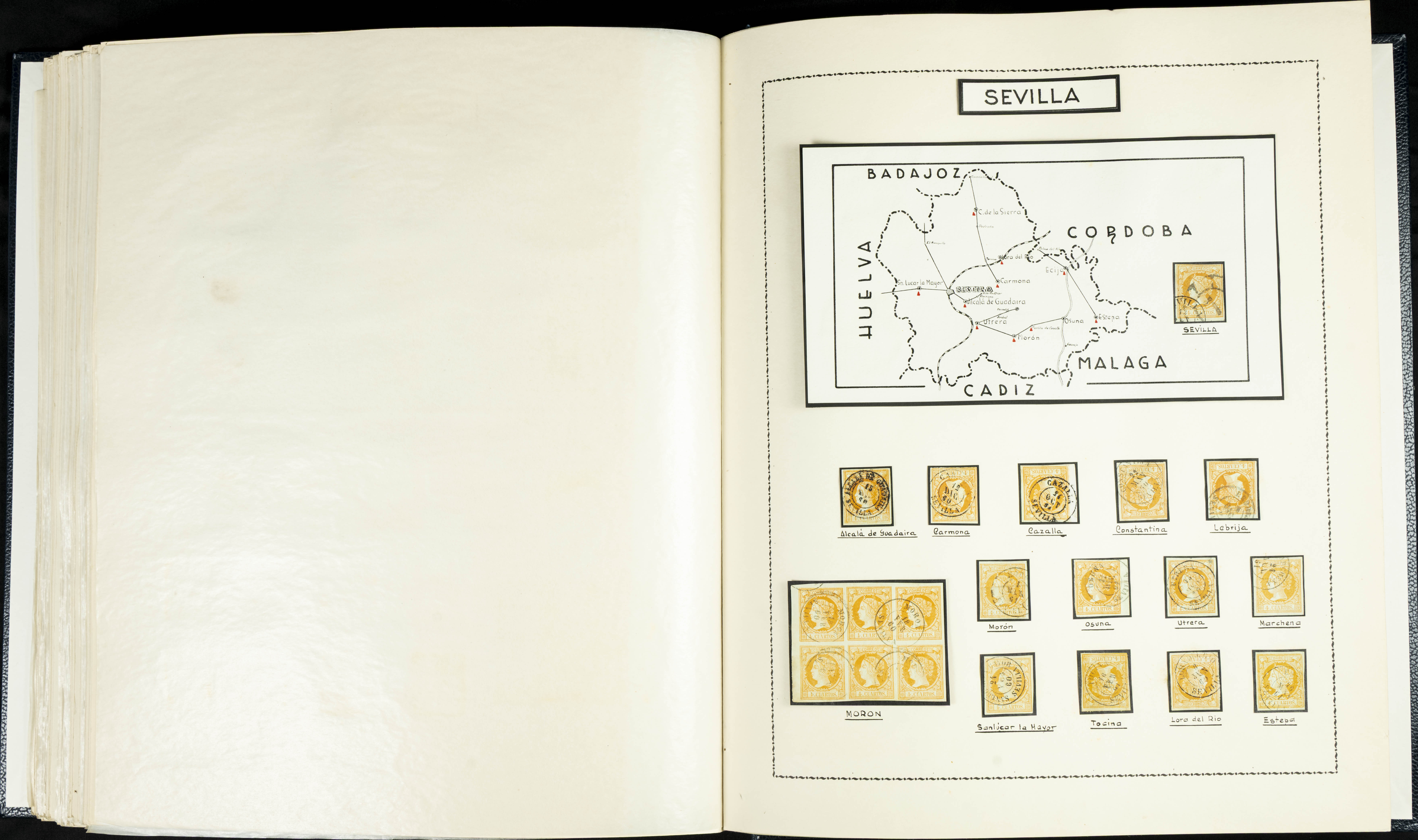 English 52. 1860. Spectacular collection of the yellow 4cuarto stamp, including countless stamps, blocks, fragments, and letters. Part of it is organized by province, especially the Type I and II date stamps. It includes a complete calendar of use, various clichés, a complete set of wagon wheel stamps, and almost a complete set of letter stamps, including the extremely rare No. 42. Individual highlights include a first-day cover stamp and letter, the perforated stamp used in Valencia on a letter (possibly the only one known), stamps and letters with pre-philatelic postmarks, and enormous blocks (spectacularly mounted in antique albums). A MUST-SEE.