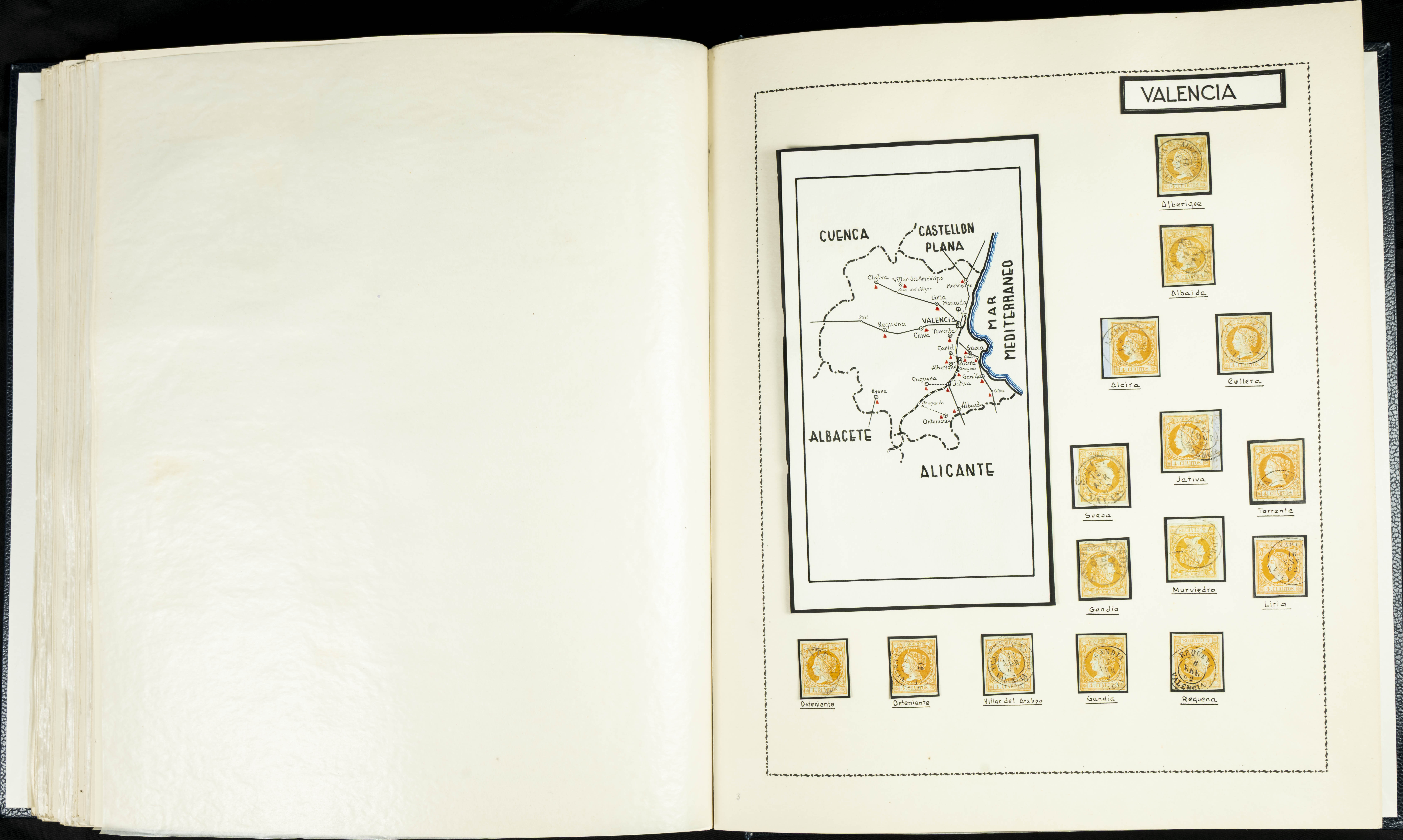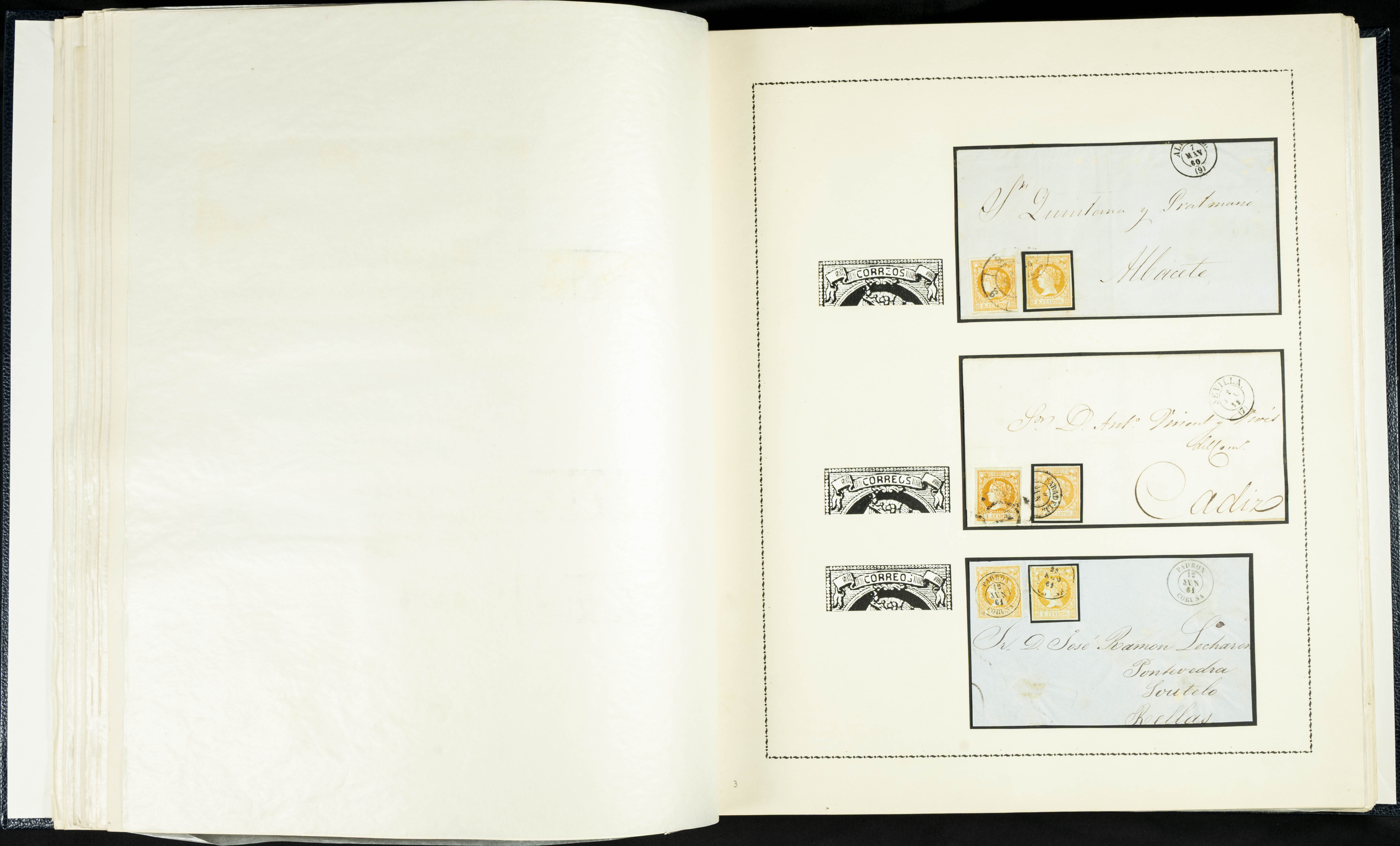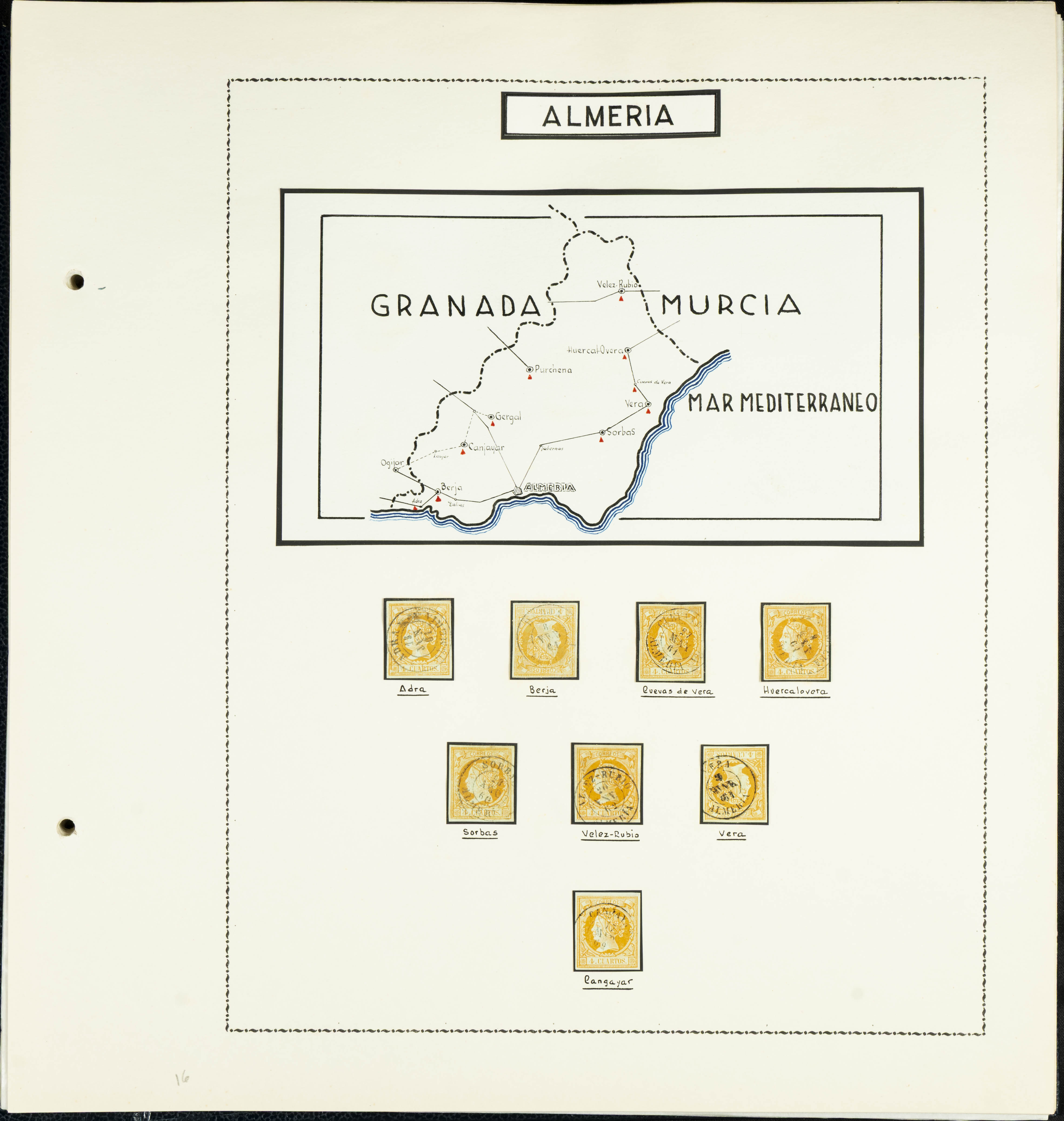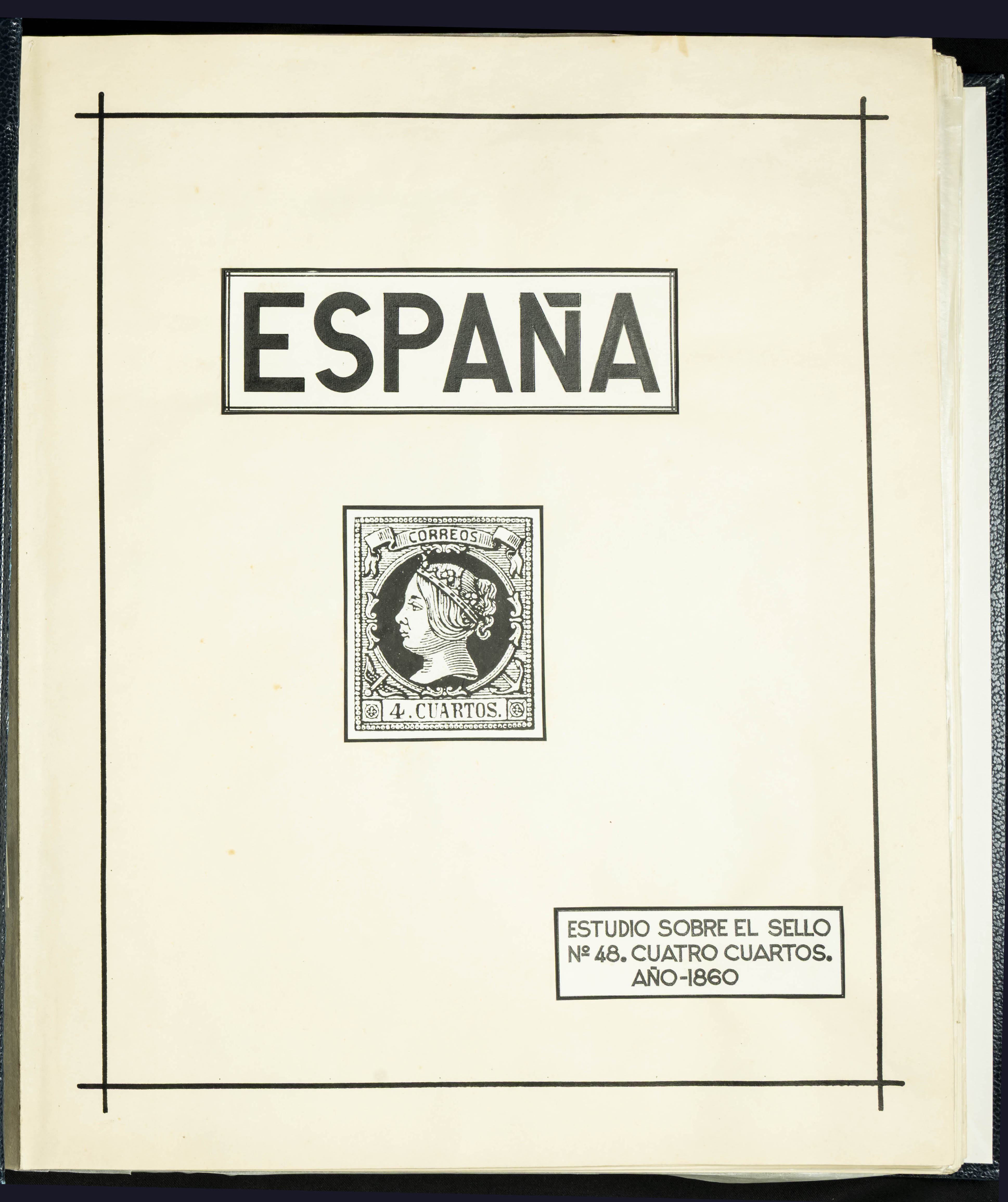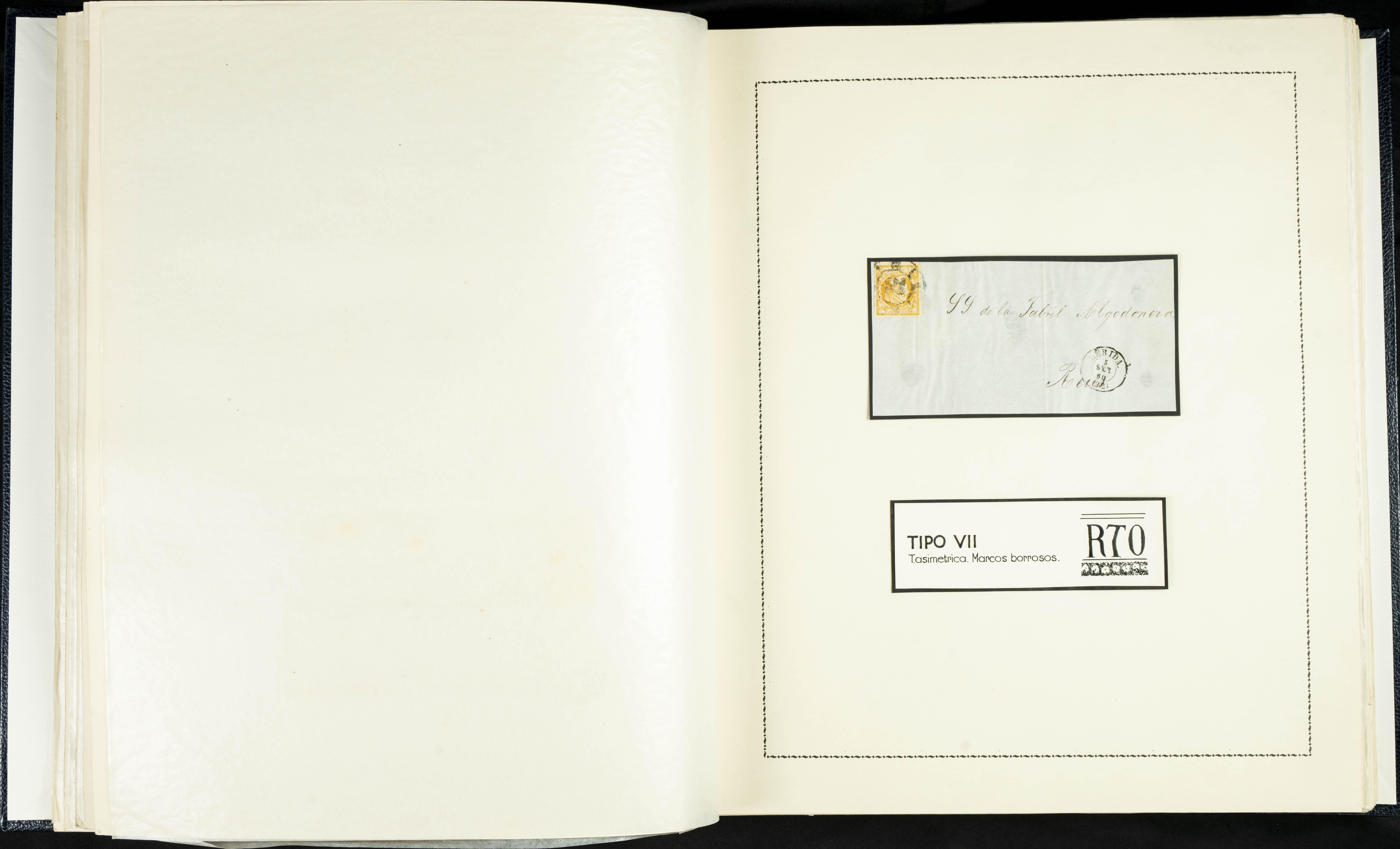 English 52. 1860. Spectacular collection of the yellow 4cuarto stamp, including countless stamps, blocks, fragments, and letters. Part of it is organized by province, especially the Type I and II date stamps. It includes a complete calendar of use, various clichés, a complete set of wagon wheel stamps, and almost a complete set of letter stamps, including the extremely rare No. 42. Individual highlights include a first-day cover stamp and letter, the perforated stamp used in Valencia on a letter (possibly the only one known), stamps and letters with pre-philatelic postmarks, and enormous blocks (spectacularly mounted in antique albums). A MUST-SEE.