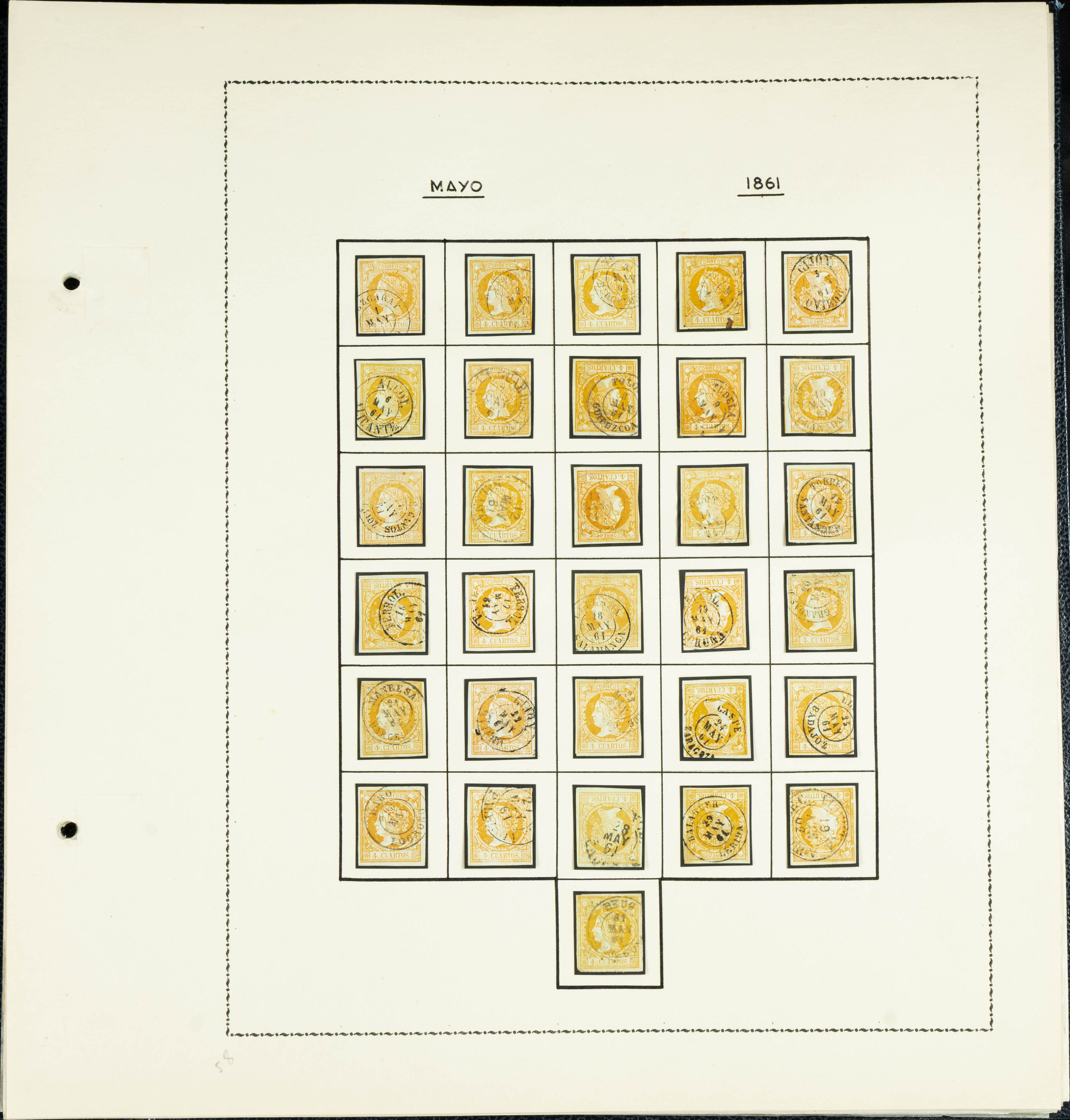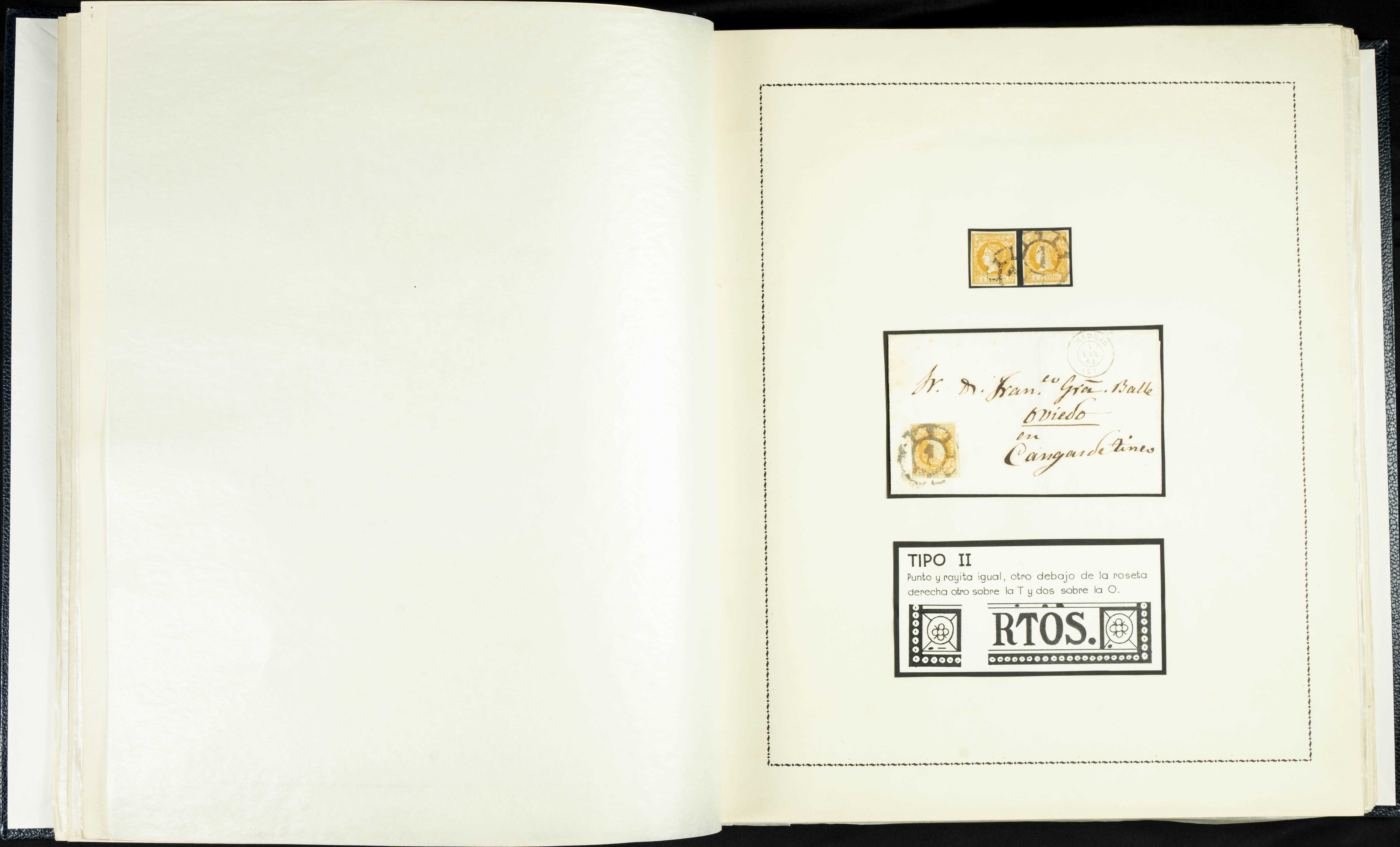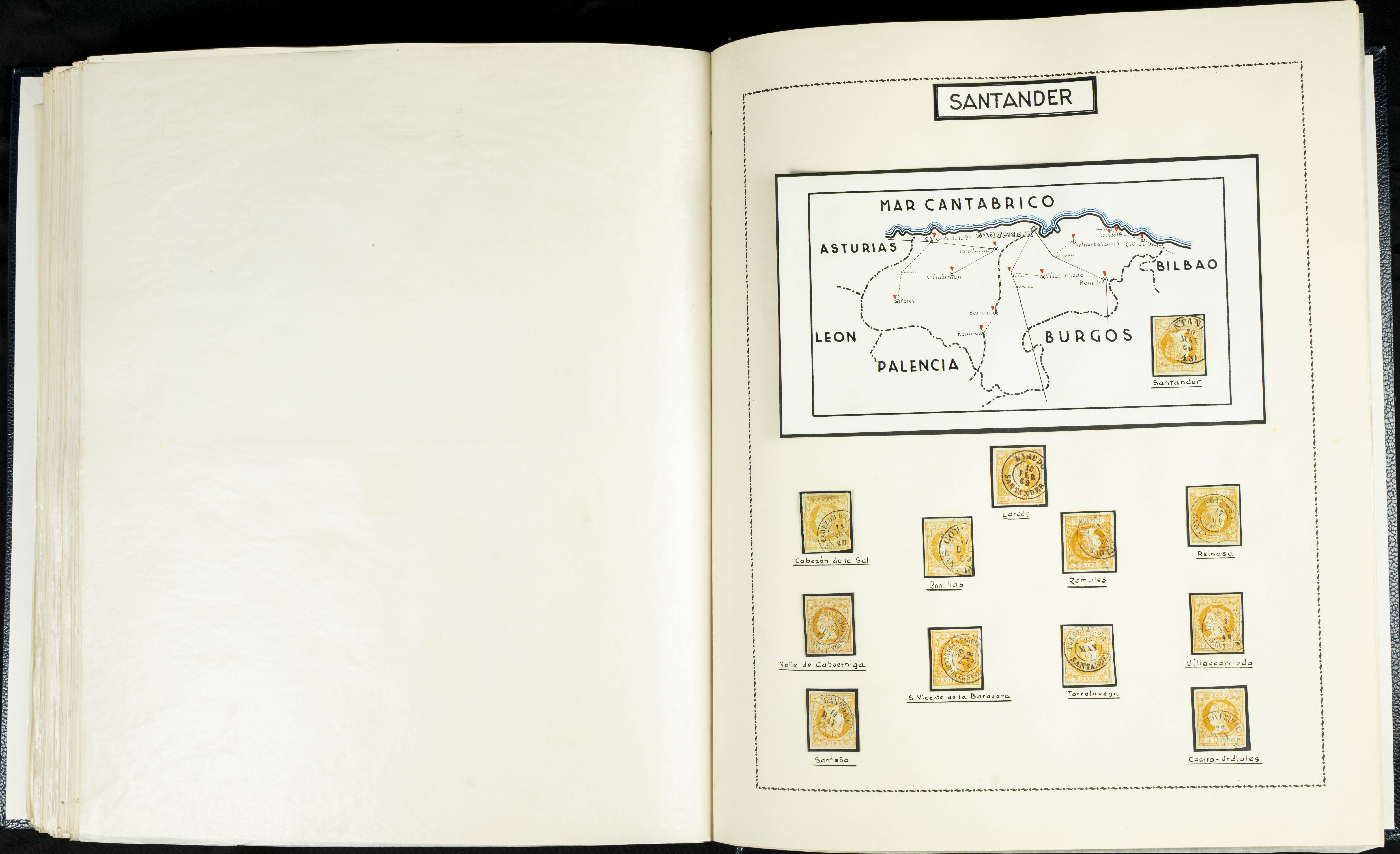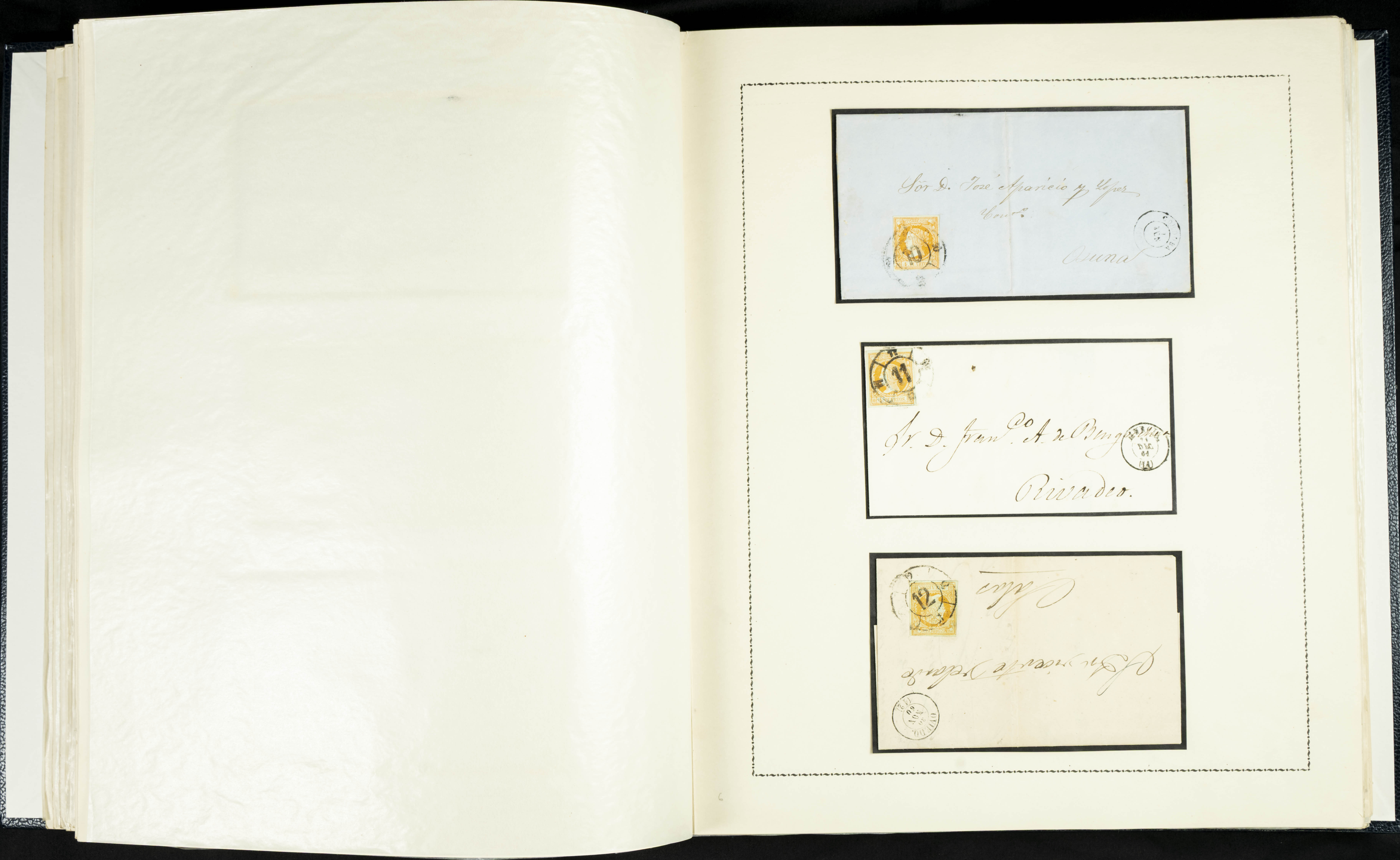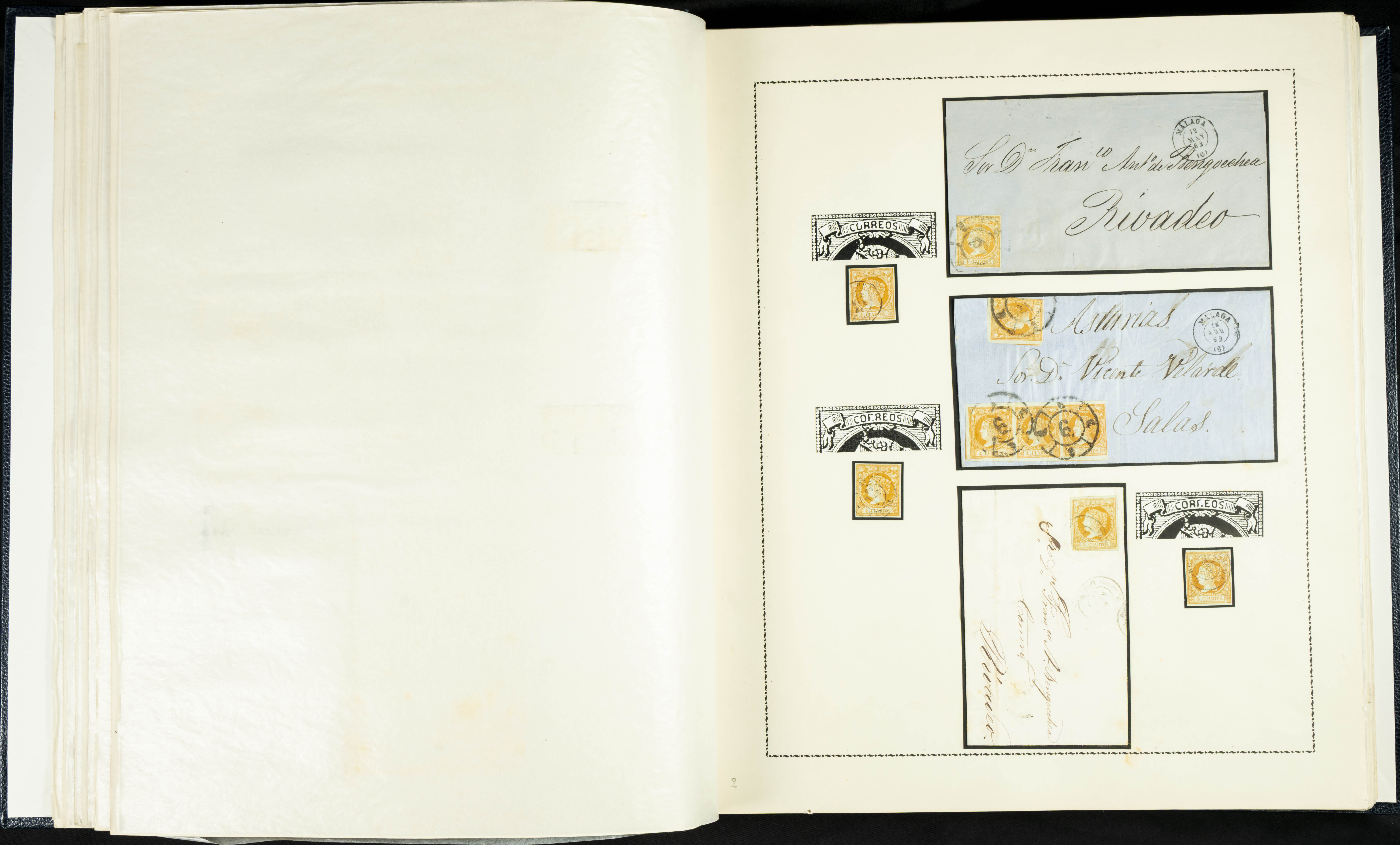 English 52. 1860. Spectacular collection of the yellow 4cuarto stamp, including countless stamps, blocks, fragments, and letters. Part of it is organized by province, especially the Type I and II date stamps. It includes a complete calendar of use, various clichés, a complete set of wagon wheel stamps, and almost a complete set of letter stamps, including the extremely rare No. 42. Individual highlights include a first-day cover stamp and letter, the perforated stamp used in Valencia on a letter (possibly the only one known), stamps and letters with pre-philatelic postmarks, and enormous blocks (spectacularly mounted in antique albums). A MUST-SEE.