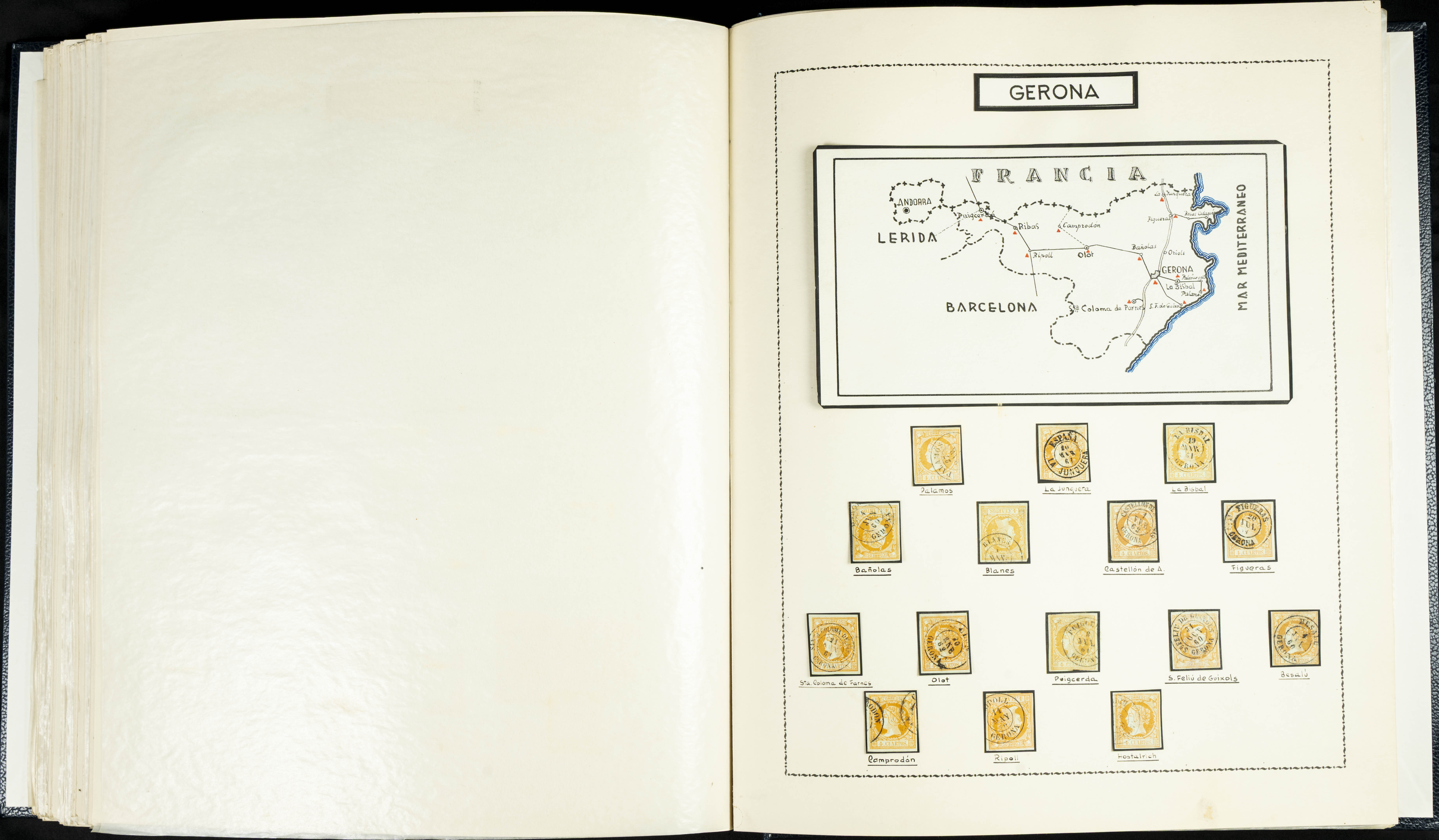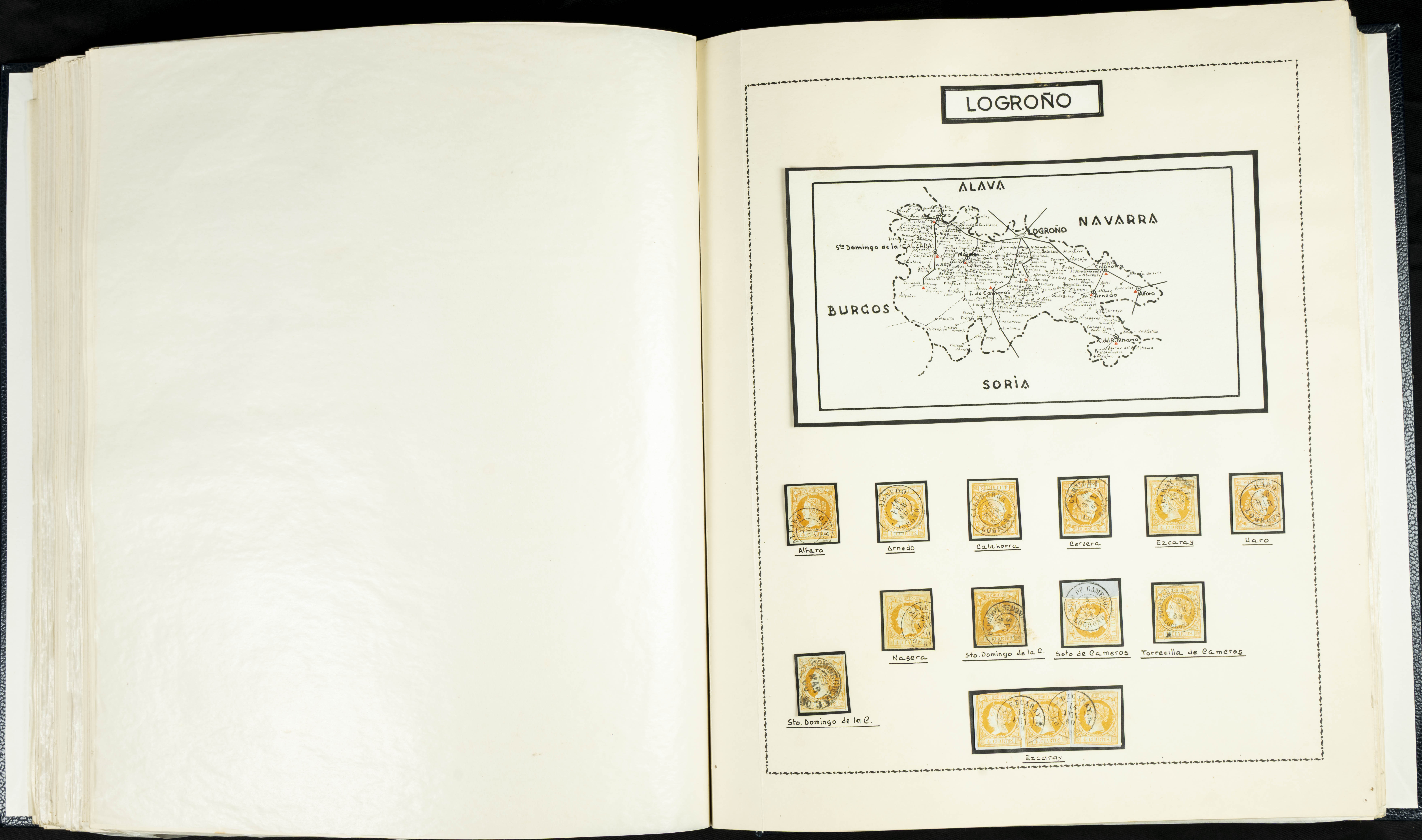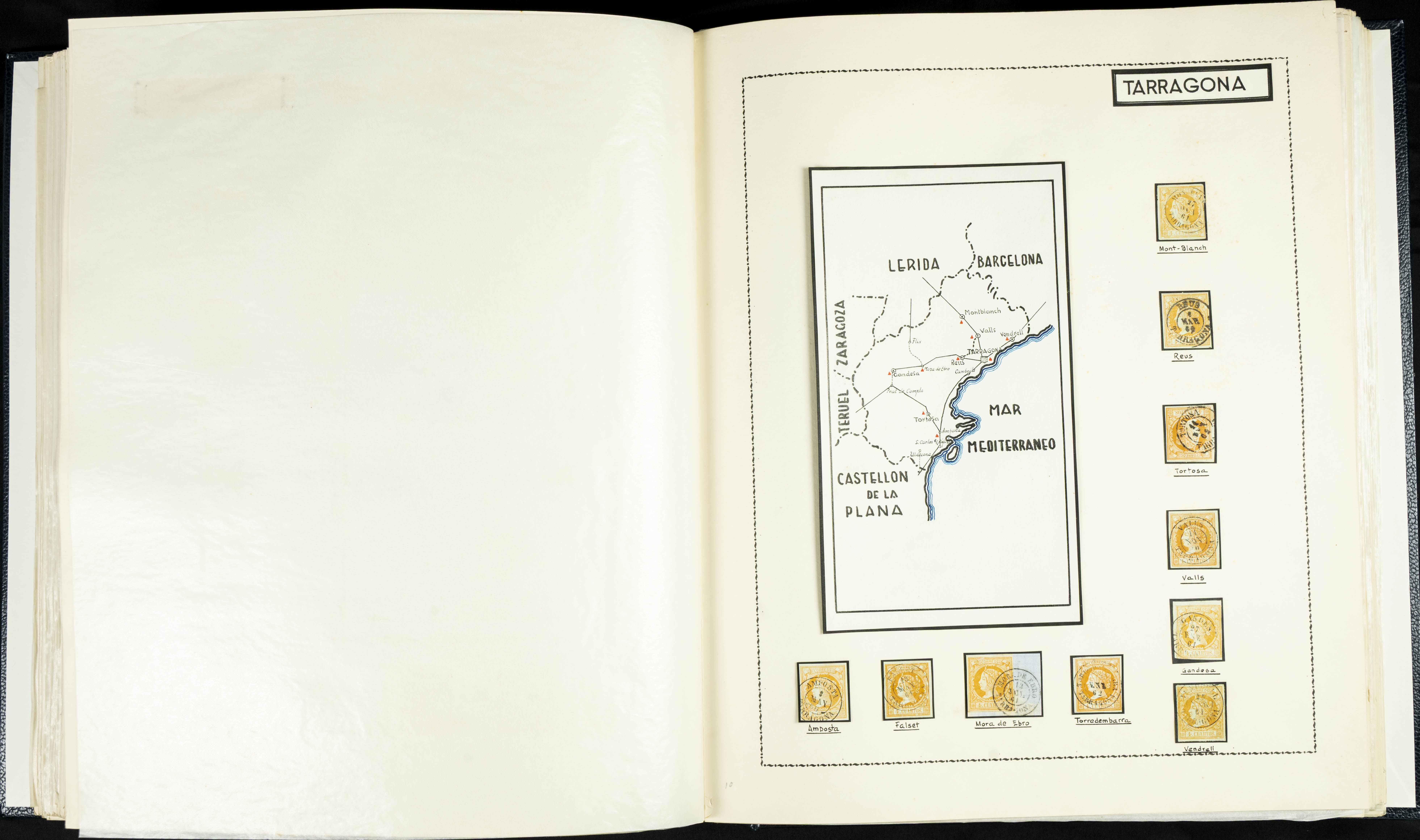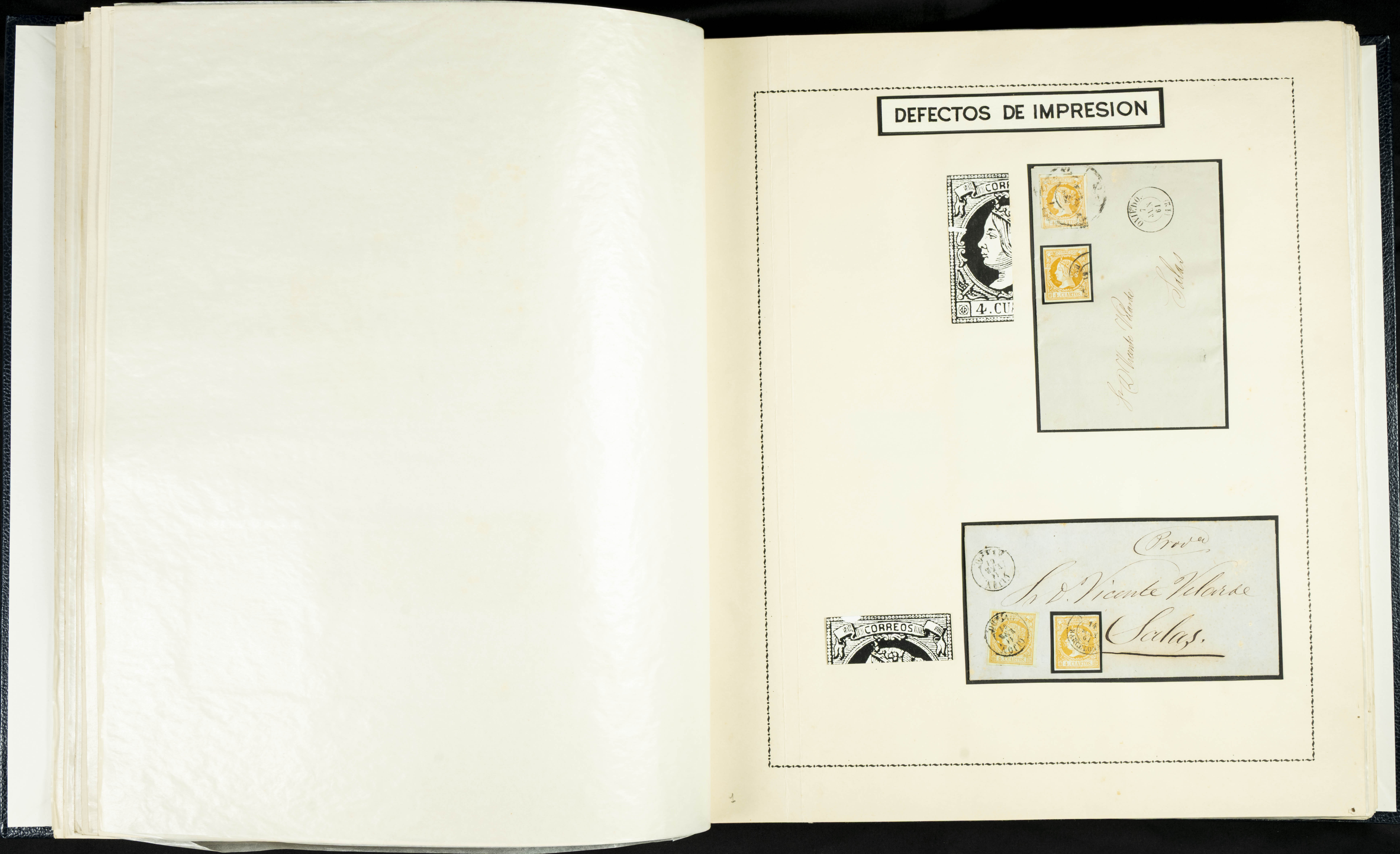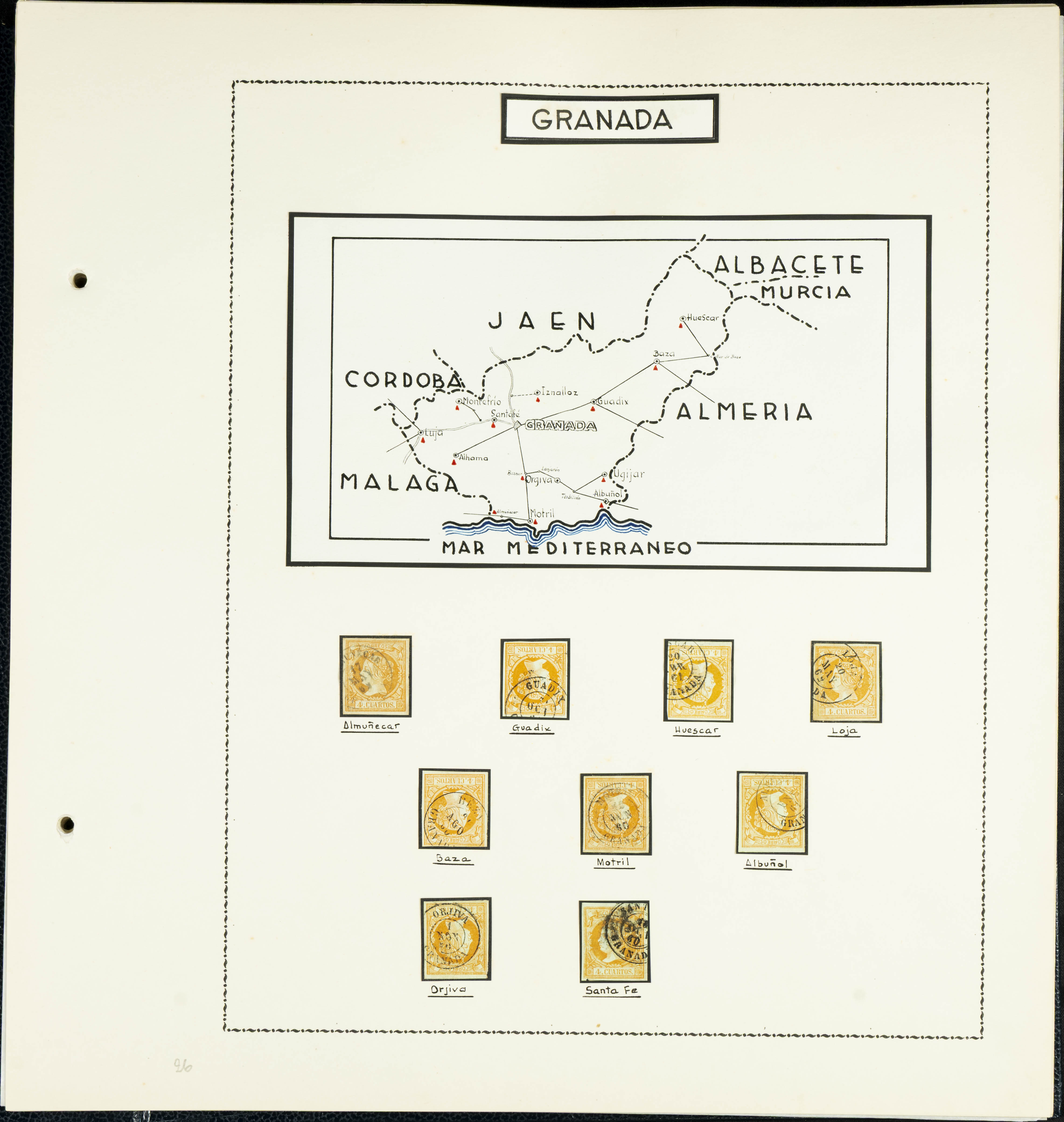 English 52. 1860. Spectacular collection of the yellow 4cuarto stamp, including countless stamps, blocks, fragments, and letters. Part of it is organized by province, especially the Type I and II date stamps. It includes a complete calendar of use, various clichés, a complete set of wagon wheel stamps, and almost a complete set of letter stamps, including the extremely rare No. 42. Individual highlights include a first-day cover stamp and letter, the perforated stamp used in Valencia on a letter (possibly the only one known), stamps and letters with pre-philatelic postmarks, and enormous blocks (spectacularly mounted in antique albums). A MUST-SEE.